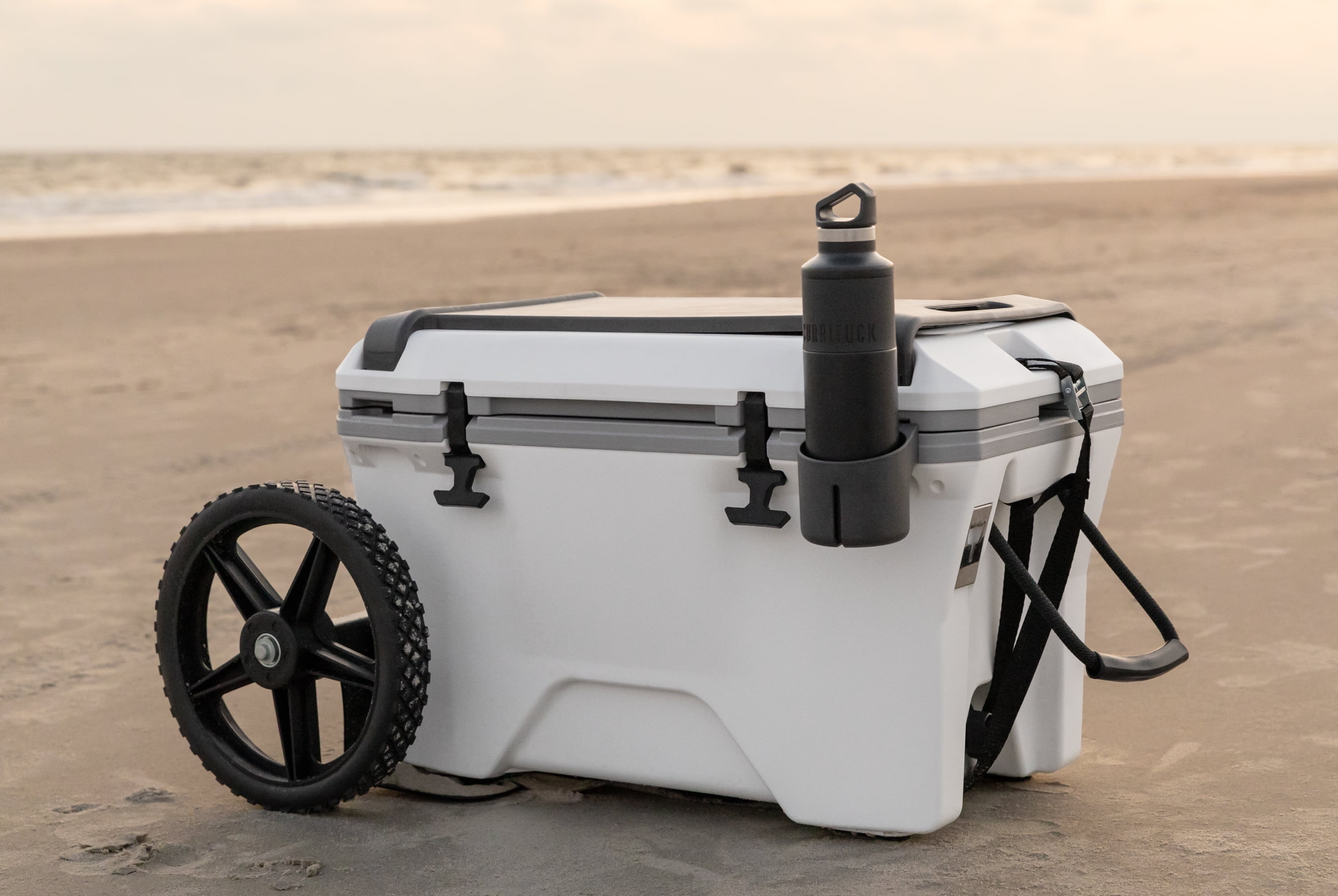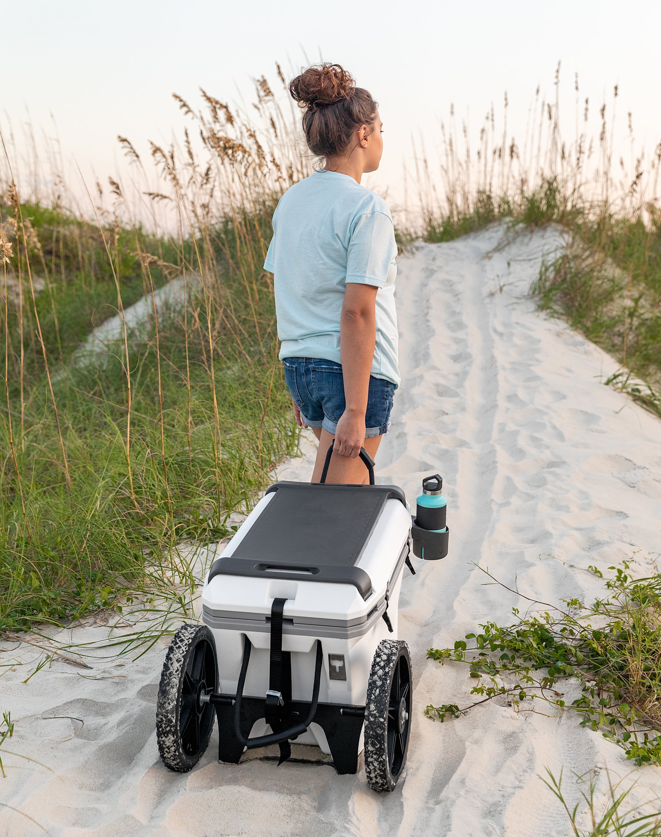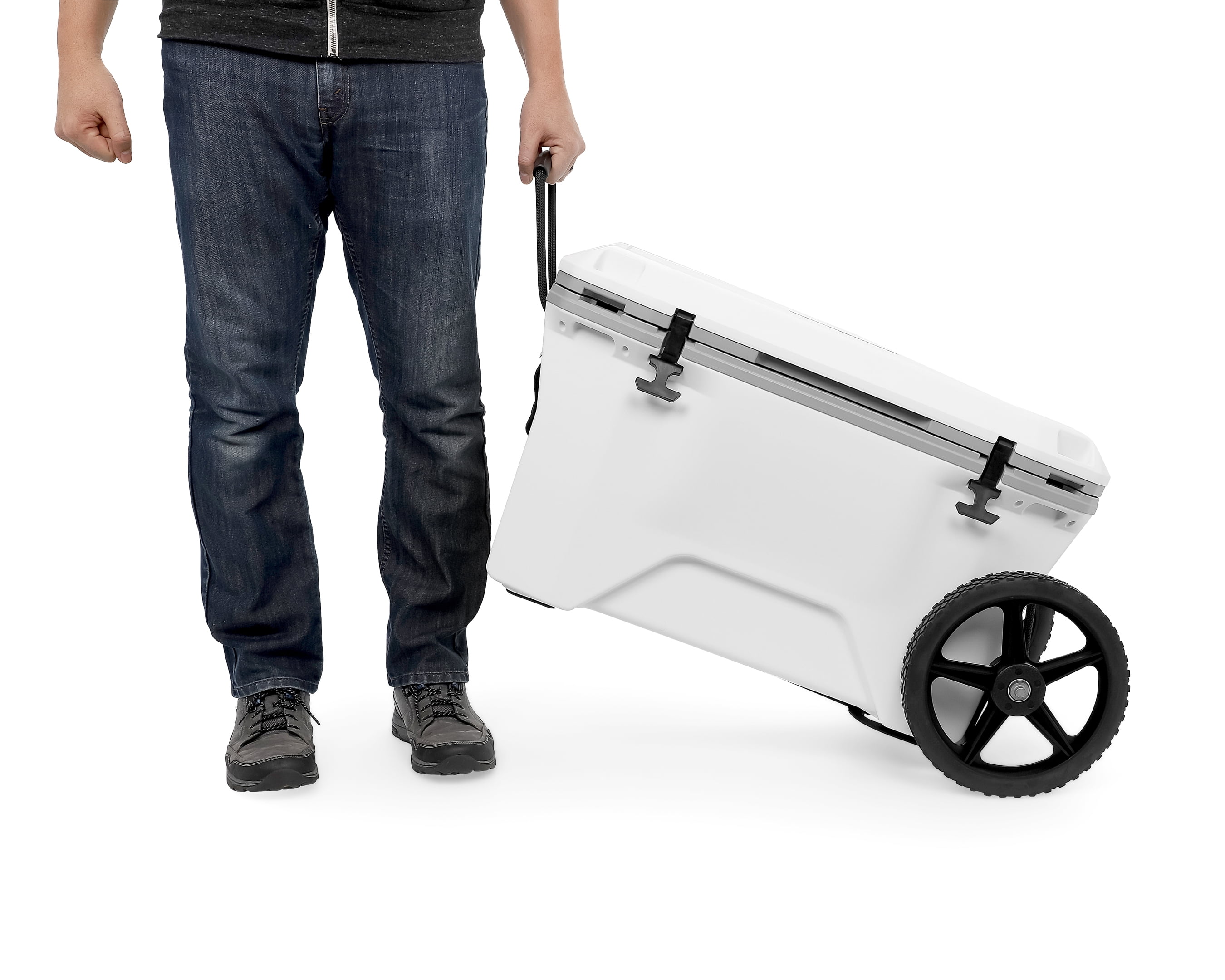 Allows you to wheel your cooler, rather than having to carry it Fits most coolers with widths up to 17.5-inches (measured 12-inches off the ground) Axles can be set so maximum width between tires is 15.5-inches or 17.5-inches 12-inch wheels provide easy toting over different terrain Made of a powder-coated steel frame with zinc-plated steel axles and polyester straps Model#: 51798; Color: Black; Brand: Camco
