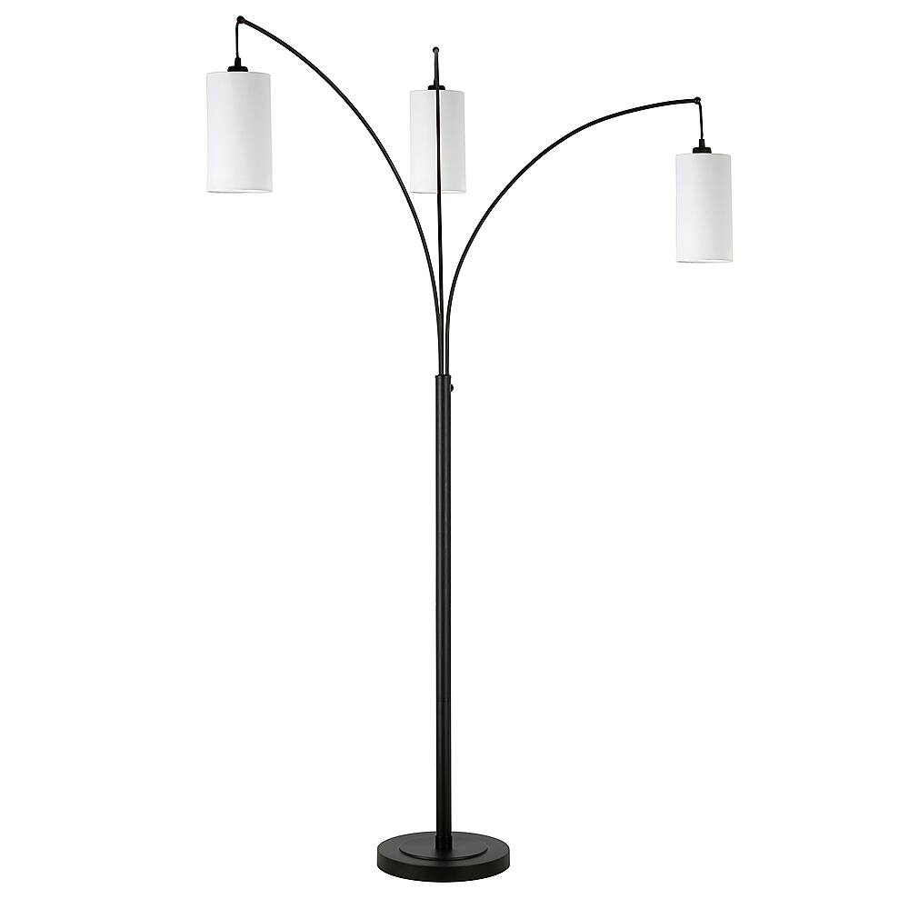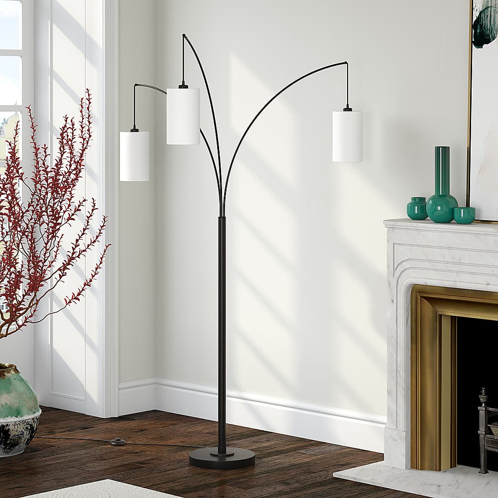 Create open concept design with this unique three-light floor lamp. The sleek metallic finish enhances its arched silhouette, offering a chic complement to contemporary decor. Three fabric drum shades in varying diameters are suspended from the adjustable arms, creating an intriguing pendant effect and allowing you to customize your lighting in any room.