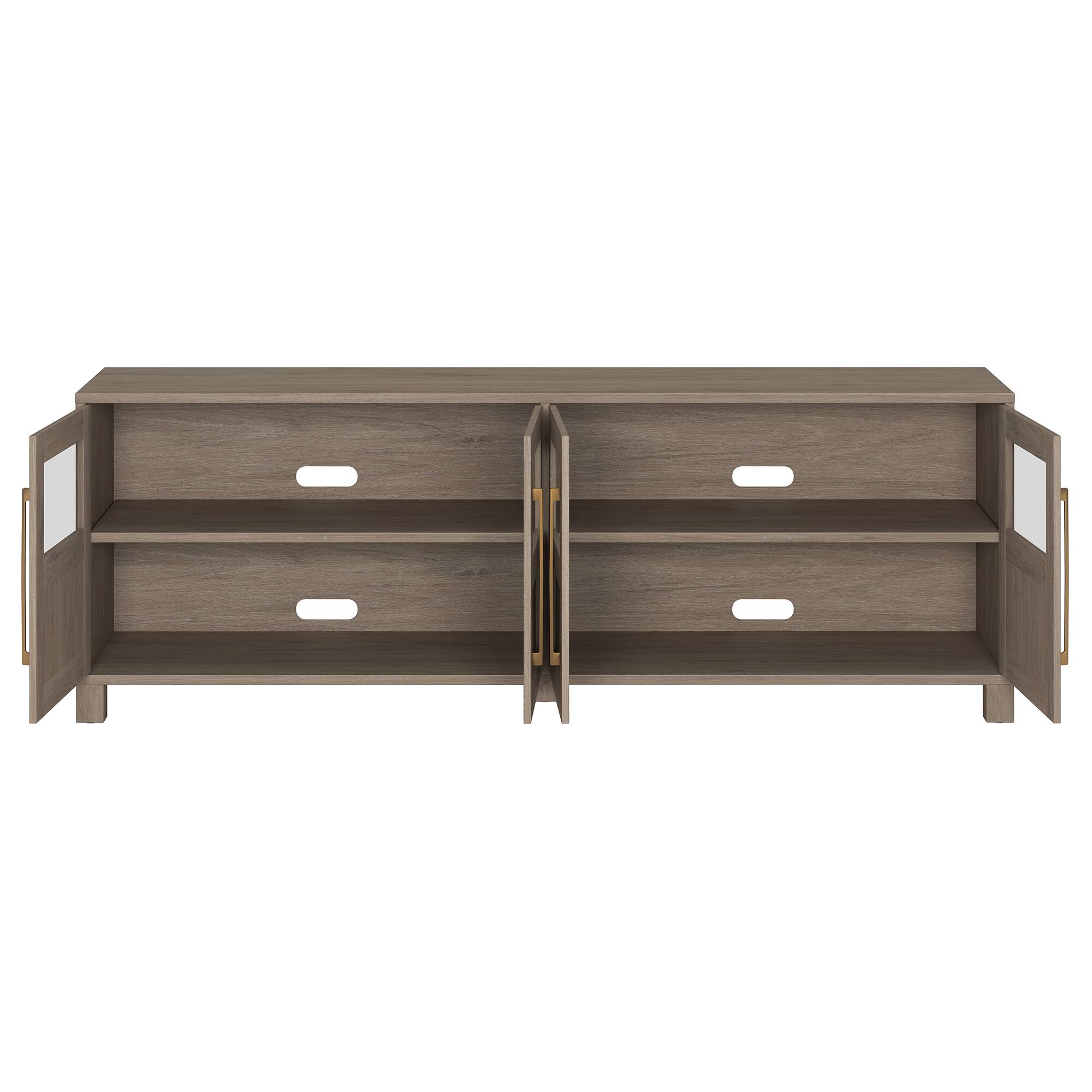 A transitional style that will fit flawlessly into any interior design brings this TV stand to life. With its sleek shape and wood grain finish, this TV stand serves as the perfect staple piece in your living room, den, or game room. Its modern and contemporary design features 4 doors and 6 inner shelves. The mixed material doors allow you to conceal your devices on the inner bottom shelves with a solid panel, while the glass panel offers the top shelf as a space to showcase your decor.