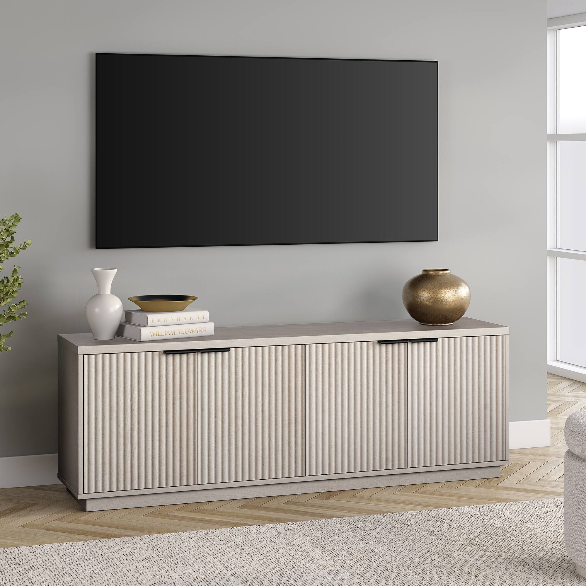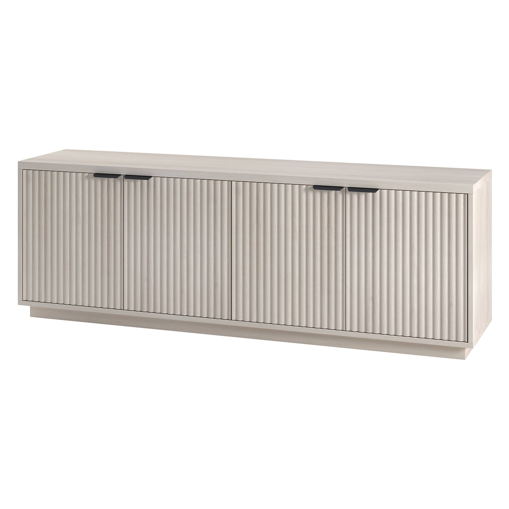 On-trend texture and design combine in this transitional TV stand. With a wood grain finish and textured fluting, this piece is sure to be a statement in your living room, den, or game room. The plinth base gives an illusion of a seamless transition from your floor, while the rounded front corners create a softer modern shape. The console features 4 fully enclosed doors with 4 inner shelves, allowing for ample storage for your devices, games, books, and more.