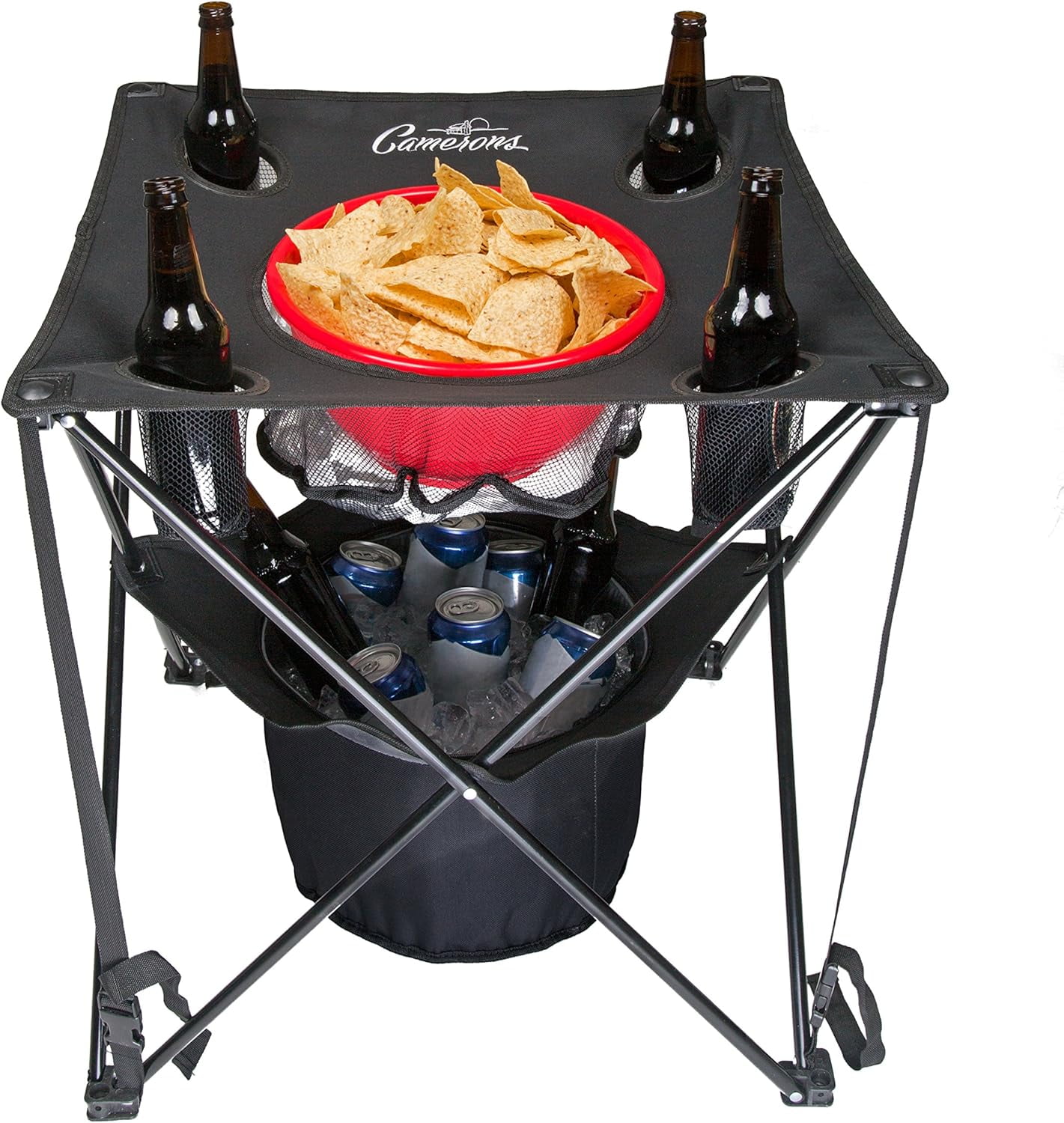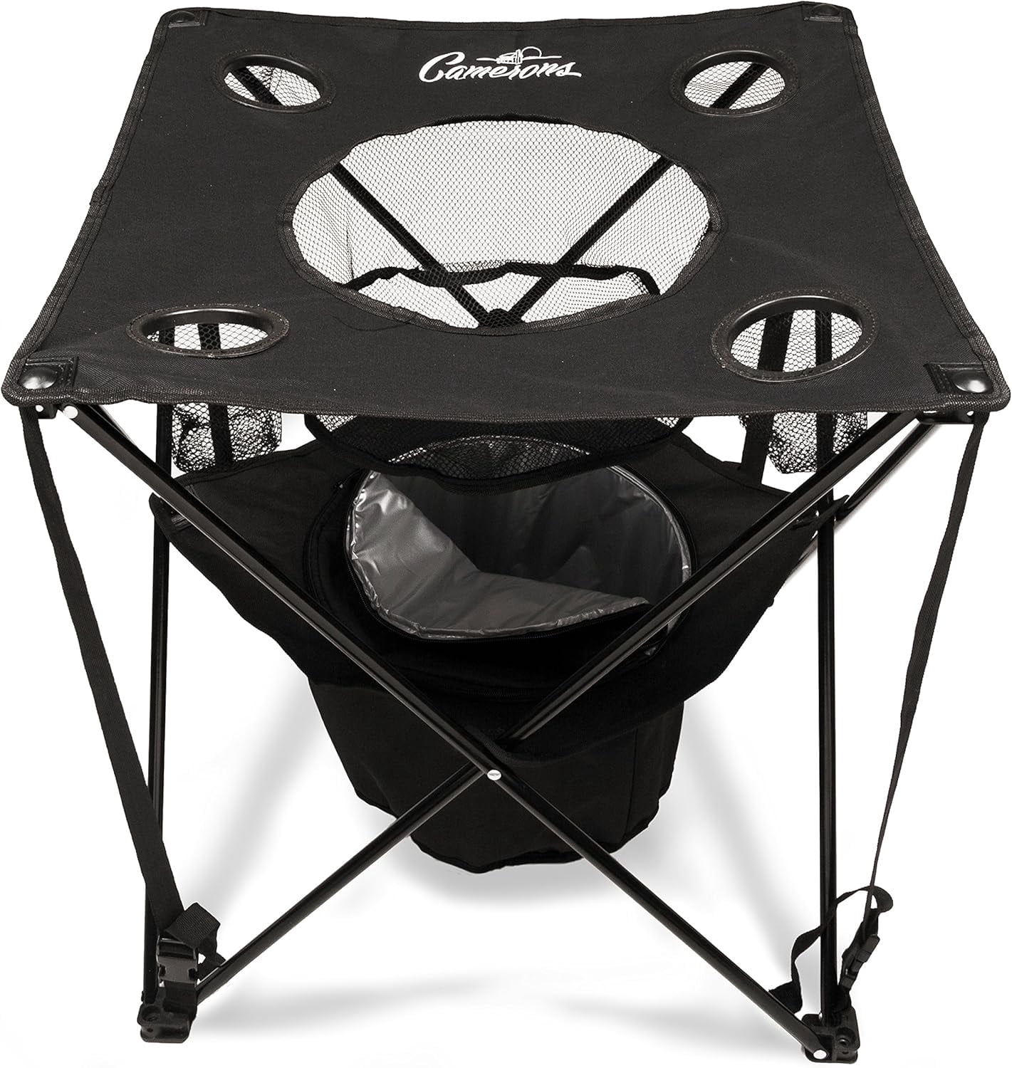 Camerons Collapsible Camping Table with Insulated Cooler, Folding Beach Table for Picnic & Tailgate Perfect for tailgating, camping, hiking, and summer celebrations Features an insulated cooler, four cup holders, and a food basket for convenience Includes a travel bag for easy portability and storage Tension straps create a stable surface, ensuring reliability during use Lightweight and easy to use, ideal for serving food and drinks