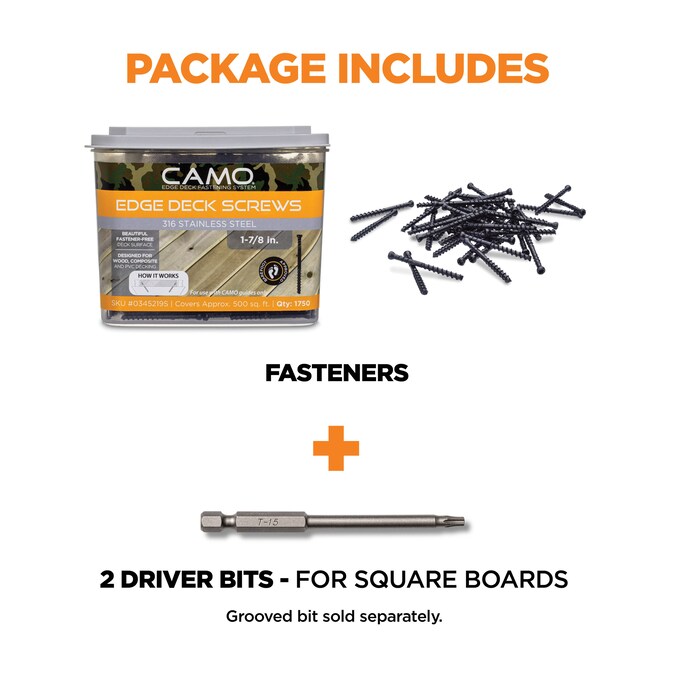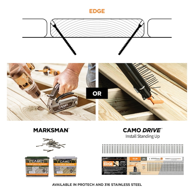 Hidden fasteners for any deck top. Beautiful, strong decks are fastened on the edge. Shifting the fastener location from the deck top to the edge of the board will extend the life of your deck. Edge fastening reduces splintering, splitting and maintenance. The MARKSMAN guide is a jig that allows you to place CAMO® Edge fasteners on the edge of your boards. Not only does this system improve the overall look of your deck, but it holds stronger than a traditional face fastener. When a deck board is face fastened, the head of the screw or nail is keeping your board in place. Edge fastening leverages the strength of the entire screw to hold your deck board in place. CAMO Edge fasteners offer robust features that ensure a sturdy, beautiful deck surface. From tip to head, this screw is designed for beauty and performance. The reverse rake tip bores out material from the hole to prevent bubbling and splitting from the expansion and contraction of the material. The aggressive lower threads hold the board to the joist. The reverse upper threads hold the board strongly in place. Finally, the T15 star drive is designed for strong bit engagement to allow for easy sinking of the trim head. To manage warped boards and lock them in place, use the CAMO LEVER®.