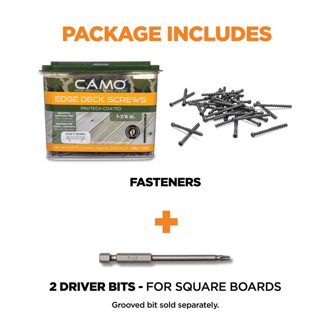 Hidden fasteners for any deck top. Beautiful, strong decks are fastened on the edge. Shifting the fastener location from the deck top to the edge of the board will extend the life of your deck. Edge fastening reduces splintering, splitting and maintenance. The MARKSMAN guide is a jig that allows you to place CAMO® Edge fasteners on the edge of your boards. Not only does this system improve the overall look of your deck, but it holds stronger than a traditional face fastener. When a deck board is face fastened, the head of the screw or nail is keeping your board in place. Edge fastening leverages the strength of the entire screw to hold your deck board in place. CAMO Edge fasteners offer robust features that ensure a sturdy, beautiful deck surface. From tip to head, this screw is designed for beauty and performance. The reverse rake tip bores out material from the hole to prevent bubbling and splitting from the expansion and contraction of the material. The aggressive lower threads hold the board to the joist. The reverse upper threads hold the board strongly in place. Finally, the T15 star drive is designed for strong bit engagement to allow for easy sinking of the trim head. To manage warped boards and lock them in place, use the CAMO LEVER®.