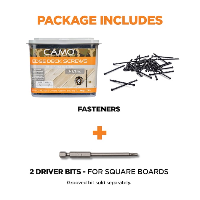Hidden fasteners for any deck top. Beautiful, strong decks are fastened on the edge. Shifting the fastener location from the deck top to the edge of the board will extend the life of your deck. Edge fastening reduces splintering, splitting and maintenance. The MARKSMAN guide is a jig that allows you to place CAMO® Edge fasteners on the edge of your boards. Not only does this system improve the overall look of your deck, but it holds stronger than a traditional face fastener. When a deck board is face fastened, the head of the screw or nail is keeping your board in place. Edge fastening leverages the strength of the entire screw to hold your deck board in place. CAMO Edge fasteners offer robust features that ensure a sturdy, beautiful deck surface. From tip to head, this screw is designed for beauty and performance. The reverse rake tip bores out material from the hole to prevent bubbling and splitting from the expansion and contraction of the material. The aggressive lower threads hold the board to the joist. The reverse upper threads hold the board strongly in place. Finally, the T15 star drive is designed for strong bit engagement to allow for easy sinking of the trim head. To manage warped boards and lock them in place, use the CAMO LEVER®.