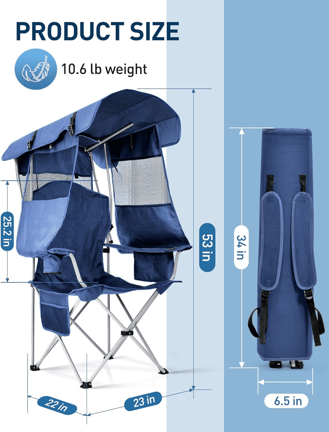 [Cooler Bag for Cooling and Quenching of Thirst] The folding chair with sunshade comes with a cooler bag to help you keep your drinks and snacks cold and fresh, enjoy cold drinks and fresh food during outdoor activities without leaving your seat. [UPF 50+ for Strong Shading Effect] Compared with traditional UPF 50+ sunshade chairs, our camping chair with sunshade adds side sunshades and tailgates to block the sun from the sides and back, provide maximum cool shade, and shade you from all directions. [ Super Handy like A Backpack ] After folding, the sunshade can be transformed into a suitcase, which is secured by two durable snap locks, and the comfortable padded double shoulder straps make the lawn chair with sunshade as easy to carry as a backpack ! [ Hold Adults up to 330 Pounds ] This outdoor chair with sunshade features an extra-sturdy steel frame, extra center support for enhanced stability, and durable 600D Oxford fabric to support adults up to 330 pounds and last for long-term use [ Pragmatic Design for Your Life] The beach chair with sunshade comes with a cup holder so you can relax and enjoy your favorite drink by your side, and the storage pocket on the side is perfect for storing your phone, snacks, magazines, wallet or keys. [ Suitable as Gift Giving ] This foldable beach chair is large enough to fit people of all sizes. Suitable for gifting to family and friends. Anyone would be delighted to receive such a gift! At the same time, you can also give it to yourself as a reward! [ Lifetime Warranty ] Victsing provides all our customers with a lifetime warranty and a 45-day money back guarantee, ensuring you can use it with confidence. Please feel free to contact us if you have any questions, we look forward to your consultation! Brand: Victsing Color: Blue Product Dimensions: 22″”D x 23″”W x 53″”H Size: Adult Size Back Style: Solid Back