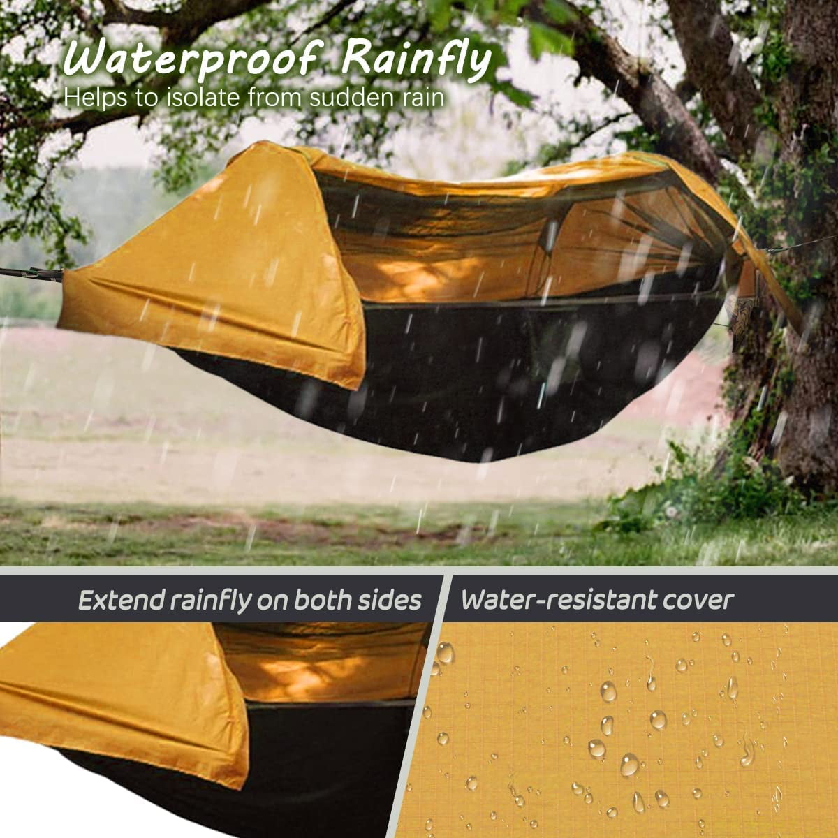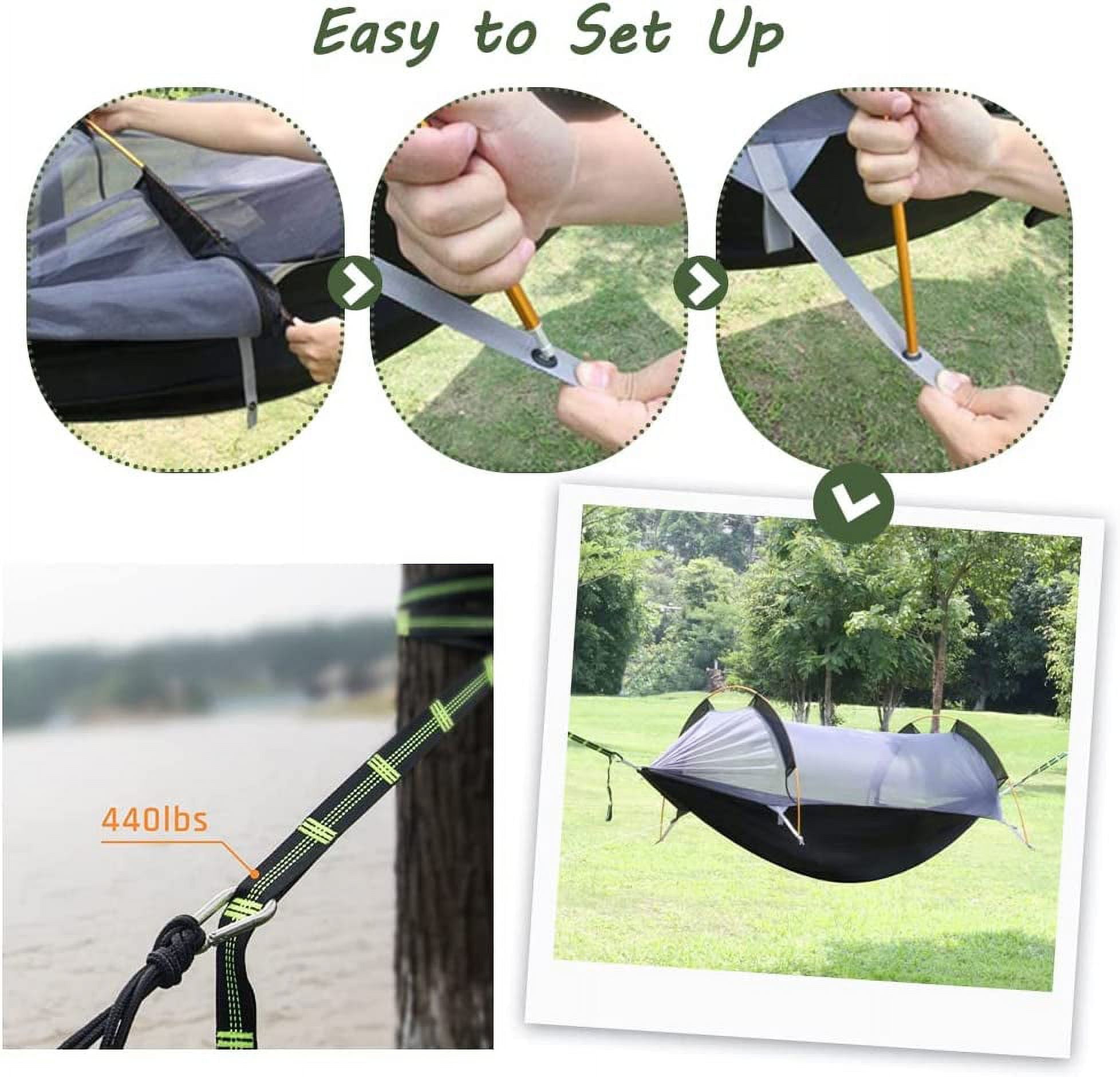 Lightweight, compact, and portable design for easy transport and quick setup. Ideal for camping, traveling, hiking, and backyard relaxation, the BreeRainz Double 2-Person Camping Hammock is the ultimate all-in-one outdoor relaxation solution. The 210T thickened oxford polyester fabric boasts exceptional tear-resistance and superior waterproof capabilities, offering comprehensive protection against rain and UV rays to keep you well-shielded. Breathable netting system ensures a pest-free camping experience, keeping mosquitoes and bugs at bay. Rainfly cover provides reliable protection against sunburn, rain, and snow, ensuring you stay comfortable in any weather. Versatile and adaptable, this hammock can be used as a regular swing hammock, ground hammock, or tent, making it perfect for a variety of outdoor activities.