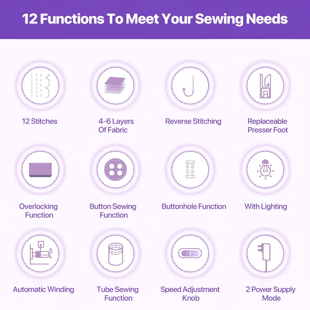 This Sewing Machine Have 12 Stitches To Meet Your Different Needs Of DIY Sewing. It Can Seam, Hem, Button Holing, Auto Winding Or Etc. You Can Make A Unique Clothes For You And Family, Transform The Old Clothes, Make A Cute Little Pajamas For Your Baby, Add A Name Tag And Label On The Baby’s Cloth, Make A New Curtain And Pillowcase Or Etc. Perfect For So Many Home Sewing Projects Such As Altering And Creating Clothing, Crafting, Quilting, Home Decor And More. Feature Featuring 12 Built-In Stitch Patterns Automatic Thread Rewind;Sews Sleeves Drawer Included Built-In Sewing Light Includes Thread Cutter Built In Measuring Tape And Tension Adjuster Forward And Reverse Sewing Four-Step Button Hole Sewing Two Speed (High & Low) To Choose Use Hand Switch Or Foot Pedal To Start Including All-Purpose Presser Foot Replacement Holder Low Noise, Stable Operation, Multifunction Sewing Tool Adjustable Stitch Length And Zigzag Width Allow You To Customize Stitches