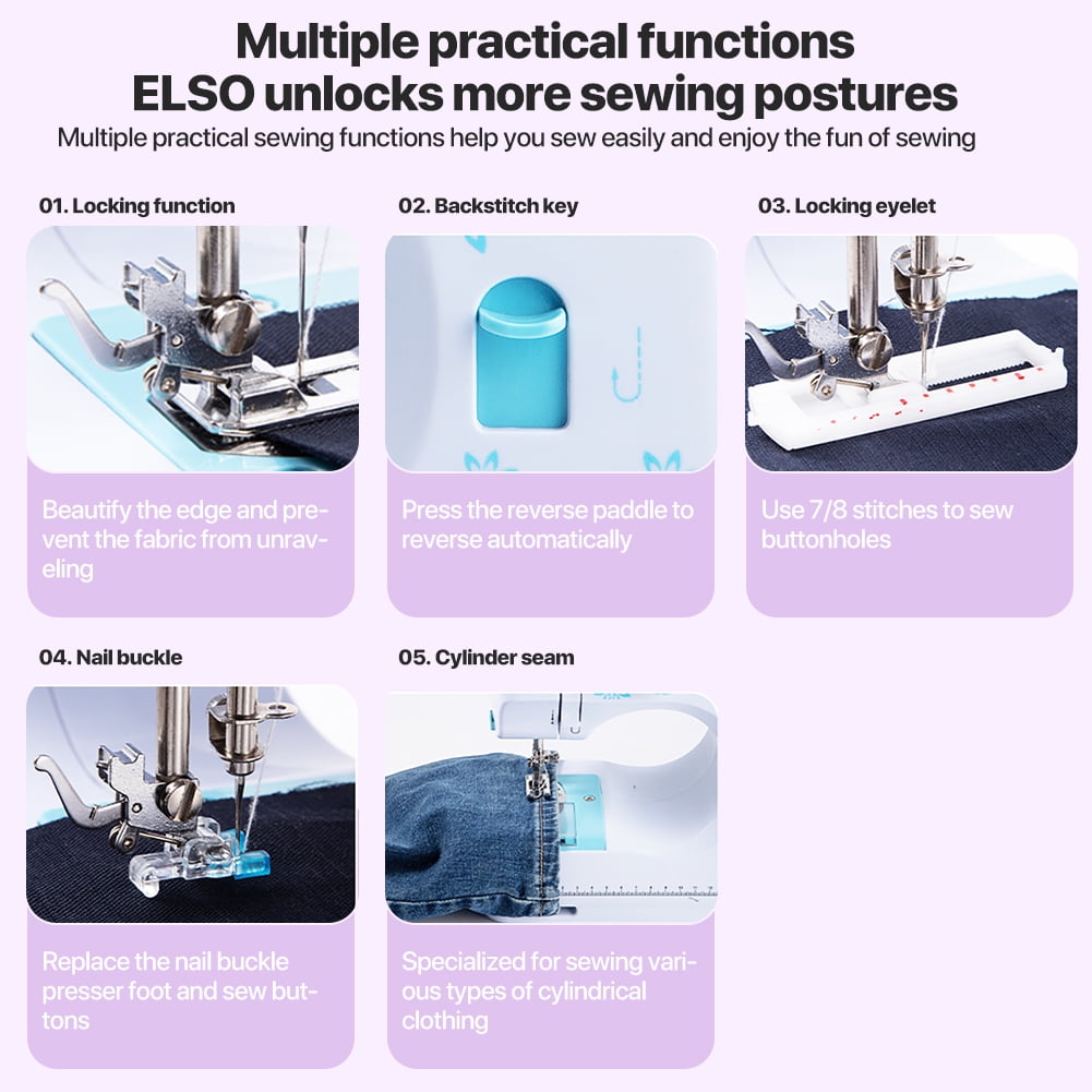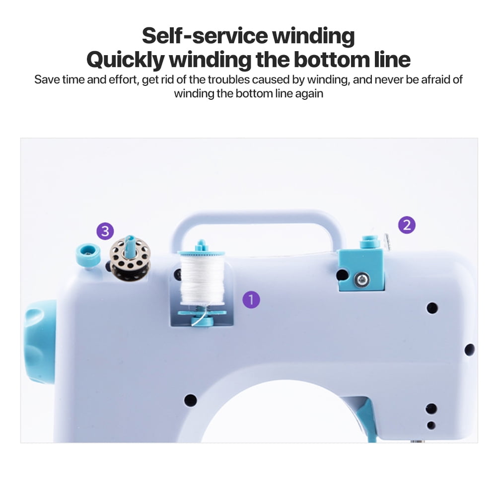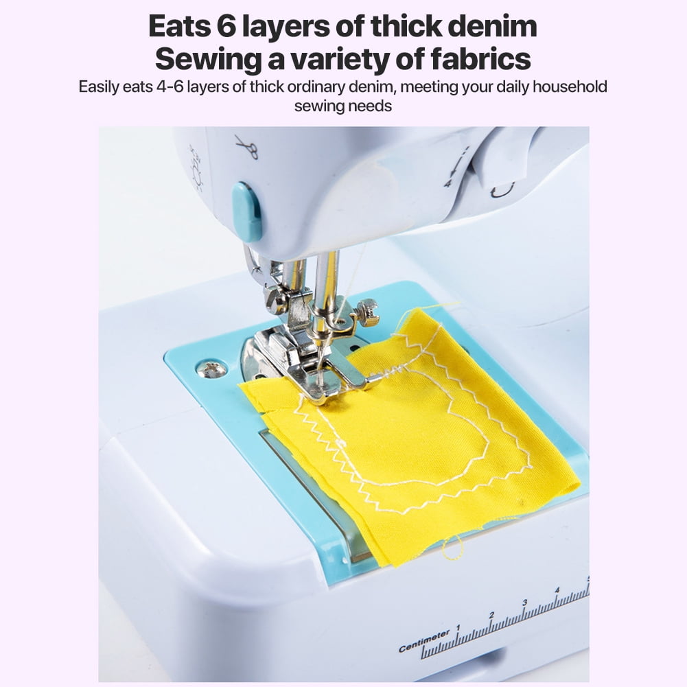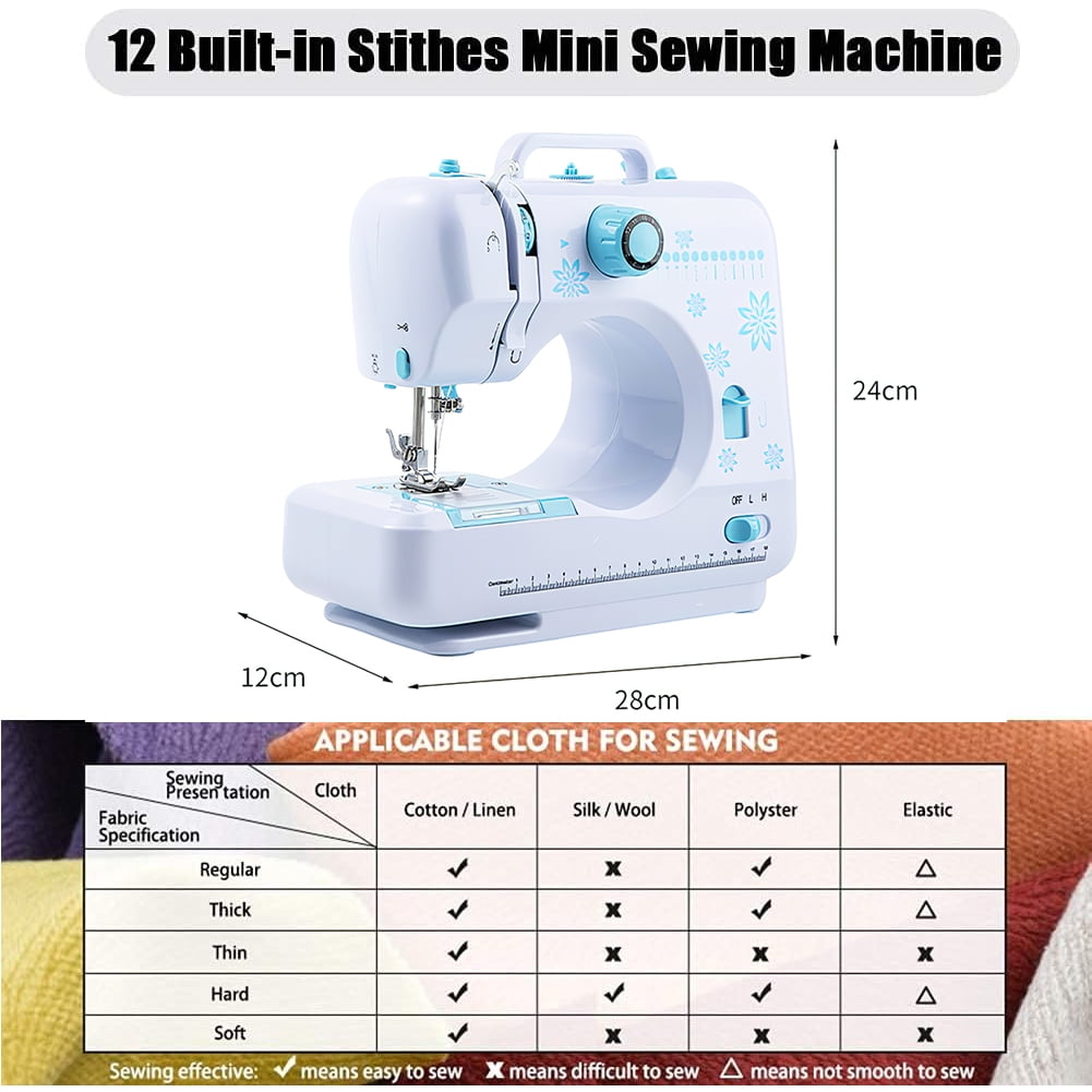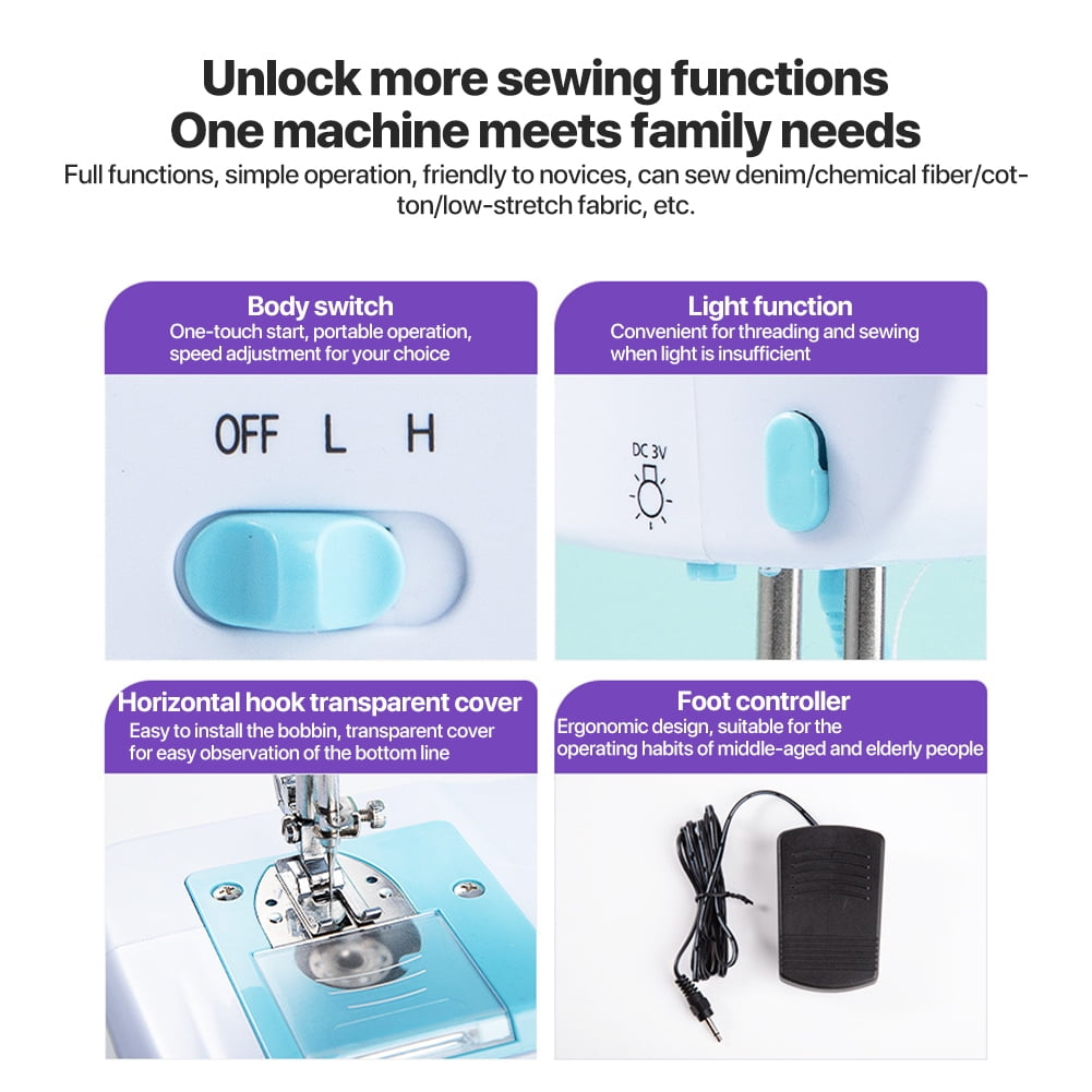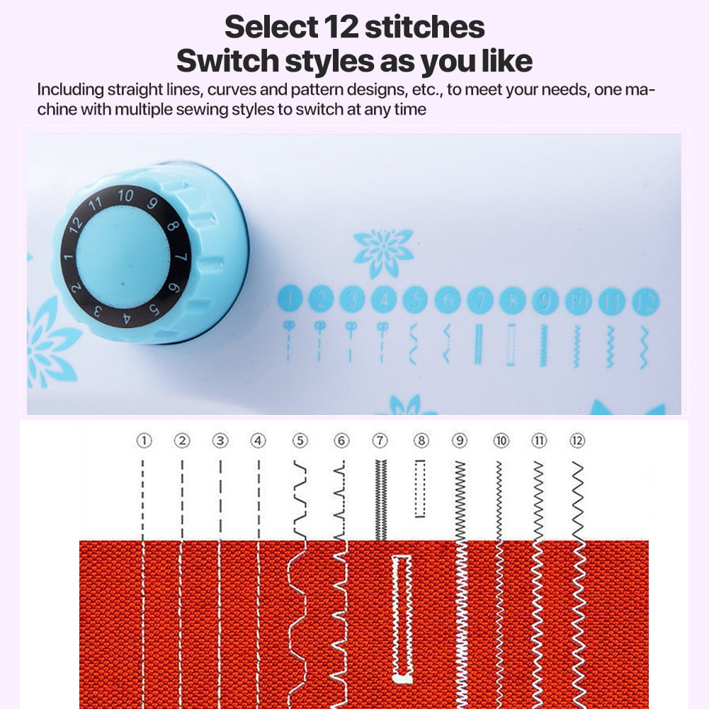 [Sewing machine dual power and dual switch] Our sewing machine can be controlled by foot switch and button switch, whether you are a beginner or a sewing enthusiast, you can easily operate it, AC adapter and 4 AA batteries(not include) two power modes, battery mode is suitable for you to use when going out, remember not to use two power modes at the same time, otherwise the motor will be damaged. [Sewing Machine User Guide] There are threading indication marks printed on the body, which can help you easily thread the thread. Whether you are a beginner or a sewing enthusiast, please watch the use video carefully before using it, which can help you create works more easily. [Precautions for use of sewing machine] 1. The battery and AC adapter cannot be used at the same time. 2. Incorrect operation will cause jamming or broken needles, please watch the video carefully and read the instructions before use. 3. If you have any questions, please feel free to contact us. [Sewing machine 12 kinds of stitches and reverse stitching] Our household sewing machine has 12 kinds of stitches, 1-4 is the adjustment stitch length, 5/6 is the pattern stitch, 7/8 is the lock stitch, 9-12 is a curve stitch, just adjust the knob to the corresponding number, you can use the corresponding stitch. In reverse sewing, you need to keep pressing the reverse sewing switch to use the reverse sewing function.