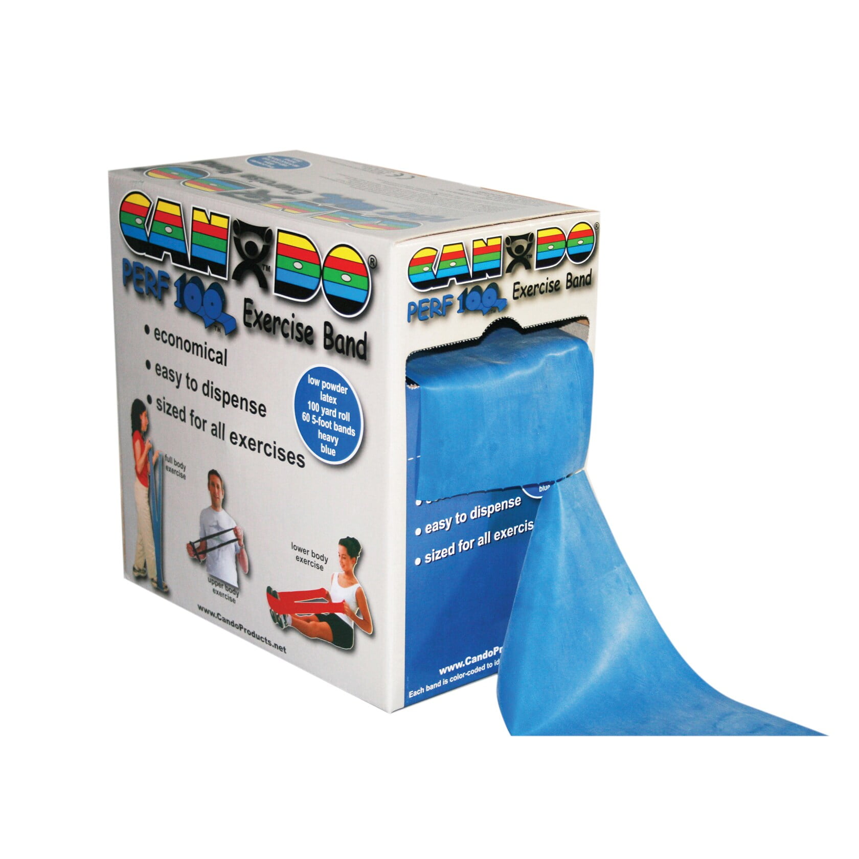CanDo® Perf 100® economic bulk size roll is the best value for large clinics. The CanDo® Perf 100™ offers a true 100 yard roll of exercise band in a convenient dispenser box. The band is perforated every 5 feet. There are 60 5-foot exercisers in each roll. To prepare exercise band for use simply pull 5 foot length from dispenser box and separate perforation line by hand. No scissors are needed!. CanDo® high quality latex resistive exercise band has been used in clinics for rehabilitation, conditioning and training since 1987. It has become a well known staple of many physical therapy programs. CanDo® exercise band is an economic solution for upper and lower body exercise. Lightweight, compact and portable. Durable. Effective when used alone, or with handles and anchors. Color-coded according to the exercise band?s resistance. CanDo® is licensed to use the Thera-Band® color sequence so resistance level is easily identified. Available in 8 levels of resistance for progressive exercise. Levels range in order of strength from least to greatest resistance: tan, yellow, red, green, blue, black, silver, gold. Uniform width – each band is 5″ wide. CanDo® low powder exercise band is made of natural rubber latex, which may cause allergic reactions. For those with latex sensitivities, there are latex-free alternative offerings of CanDo® exercise band. 100 yard Perf 100® rolls, 5-piece set (1 each: yellow, red, green, blue, black)
