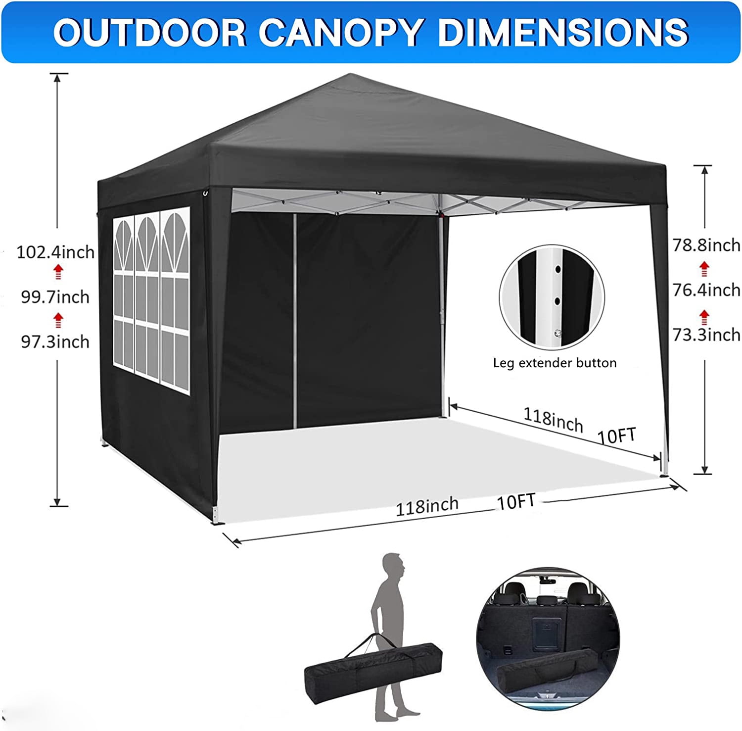 About this item 【Canopy Wide Coverage】: SUGIFT garden gazebo length and width are 10 ft, has 100 sq ft of shade, we can set up canopy in the garden, invite 10 friends, hold a barbecue, cocktail party, or share food with our family. 【Unique Design】: Canopy has an air vent on the top. When we use the 4 sidewalls of the canopy, the air vent ensure the air circulation between inside and outside; at the same time, the canopy is come with 4 sandbags to ensure the stability of the canopy when used in wind and rain. 【Excellent Material】: Pop up canopy is made of 210D white silver-coated waterproof Oxford cloth, and even the waterproof pressure can reach 1000pa, which can effectively resist ultraviolet rays, suitable for both sunny and rainy day. 【Multipurpose Canopy】: Perfect Gazebo for outdoor sports, wedding, event, festival, flea market, garden, party, beach, play ground, enjoy a wonderful holiday with family and friends. 【Package List】 : 10x10ft Pop Up Canopy Frame + 10x10ft Canopy Top Cover + 4 Sidewall + 600D Oxford Fabric Bag + 8xStakes + 4xRopes + Manual. Specification: Colors : Black Size: 10x10ft / 300x300cm Fabric: 210D silver coating oxford, waterproof Frame: Reinforced aluminum frame Capacity: for 10-15 people Uses: Outdoor UV Protection Shelter, Hold a Canopy Accessories: Folwer rope +Threaded Ground +Carry Bag Package List: 1 x 10’x10′ Canopy Frame 1 x 10’x10′ Canopy Top Cover 2 x Canopy Sidewall with Window 2 x Canopy Sidewall with Zipper 8 x Stakes 4 x Ropes 1 x 600D Oxford Fabric Carry Bag 1 x User Manual