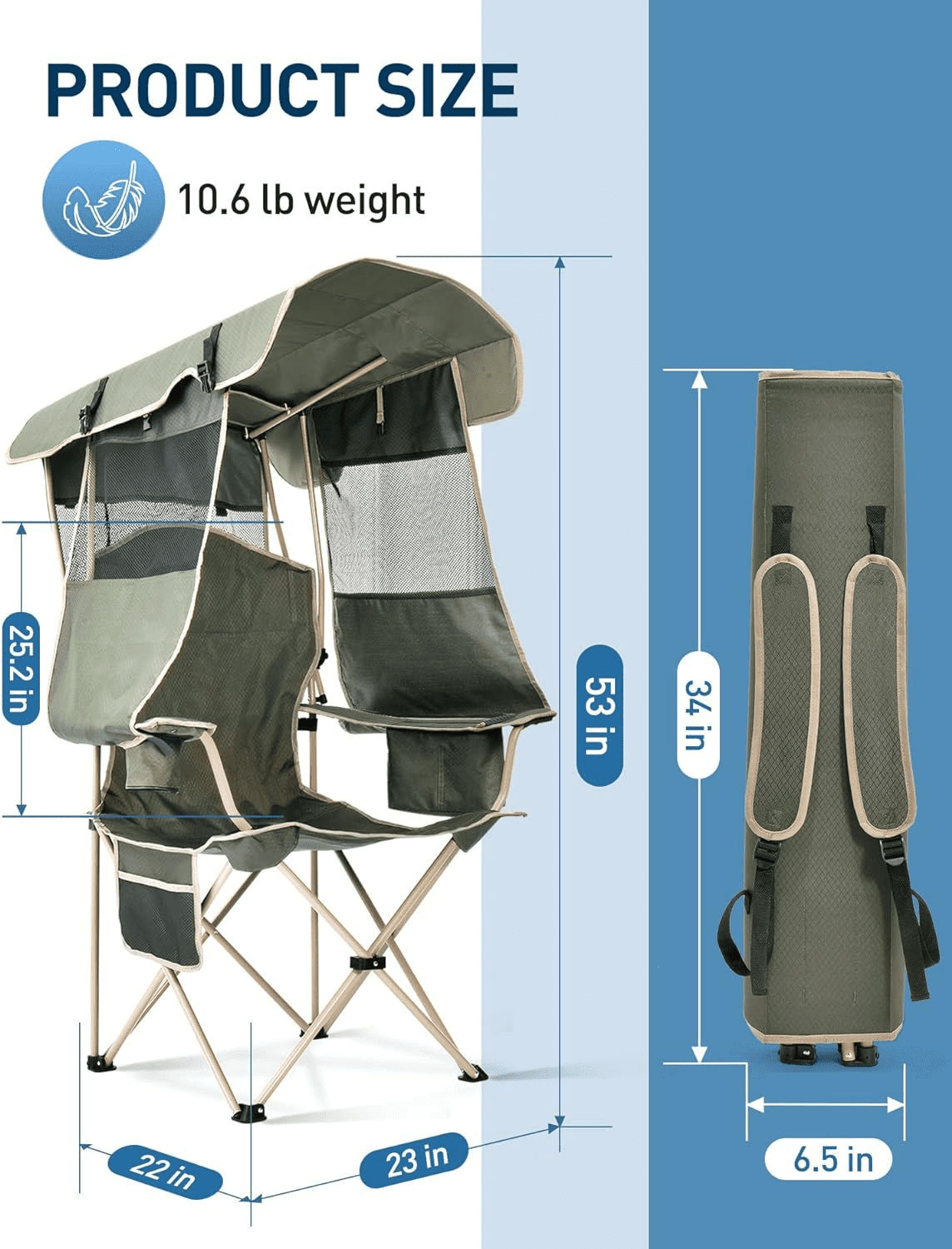 [ Cooler Bag for Cooling and Quenching of Thirst ] The folding chair with sunshade comes with a cooler bag to help you keep your drinks and snacks cold and fresh, enjoy cold drinks and fresh food during outdoor activities without leaving your seat. [ UPF 50+ for Strong Shading Effect ] Compared with traditional UPF 50+ sunshade chairs, our camping chair with sunshade adds side sunshades and tailgates to block the sun from the sides and back, provide maximum cool shade, and shade you from all directions. [ Super Handy like A Backpack ] After folding, the sunshade can be transformed into a suitcase, which is secured by two durable snap locks, and the comfortable padded double shoulder straps make the lawn chair with sunshade as easy to carry as a backpack ! [ Hold Adults up to 330 Pounds ] This outdoor chair with sunshade features an extra-sturdy steel frame, extra center support for enhanced stability, and durable 600D Oxford fabric to support adults up to 330 pounds and last for long-term use [ Pragmatic Design for Your Life ] The beach chair with sunshade comes with a cup holder so you can relax and enjoy your favorite drink by your side, and the storage pocket on the side is perfect for storing your phone, snacks, magazines, wallet or keys. [ Suitable as Gift Giving ] This foldable beach chair is large enough to fit people of all sizes. Suitable for gifting to family and friends. Anyone would be delighted to receive such a gift! At the same time, you can also give it to yourself as a reward! [ Lifetime Warranty ] Victsing provides all our customers with a lifetime warranty and a 45-day money back guarantee, ensuring you can use it with confidence. Please feel free to contact us if you have any questions, we look forward to your consultation! Brand: Victsing Color: Green Product Dimensions: 22″”D x 23″”W x 53″”H Size: Adult Size Back Style: Solid Back