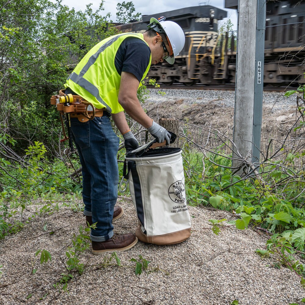 Keep your tools safe and protected with Klein’s Heavy Duty Top Closing Tool Buckets. The top zips closed to prevent falling objects. Load rated for up 150-pound (68 kg), this roomy bucket holds all the necessary tools required to get the job done. Heavy-duty No. 1 canvas body with leather reinforced bottom withstands the harshest job sites.