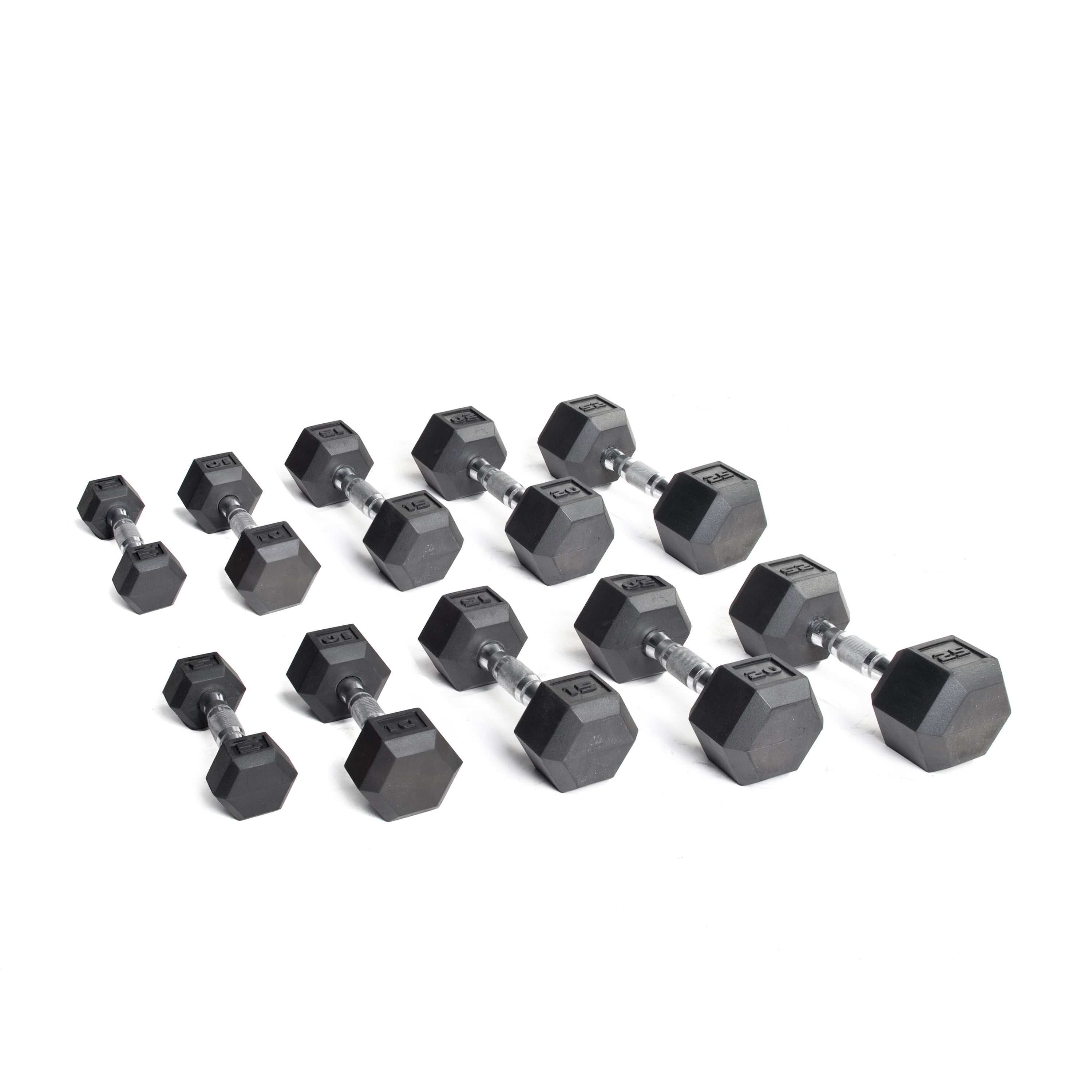 150 Set Includes five pairs of dumbbells: 5, 10, 15, 20, 25 pounds (150lbs Total): Premium quality weights that are built to last and withstand any workout environment Hexagon shaped heads are designed to prevent rolling and provide easier storage Contoured, easy-grip chrome steel handles The medium depth knurling on the ergo handle provides essential grip and security during use Protective rubber coating on the heads prevent damage to floors and equipment Great for both upper body and lower body workouts Perfect for isolations, full body, functional and HIIT workouts RACK NOT INCLUDED