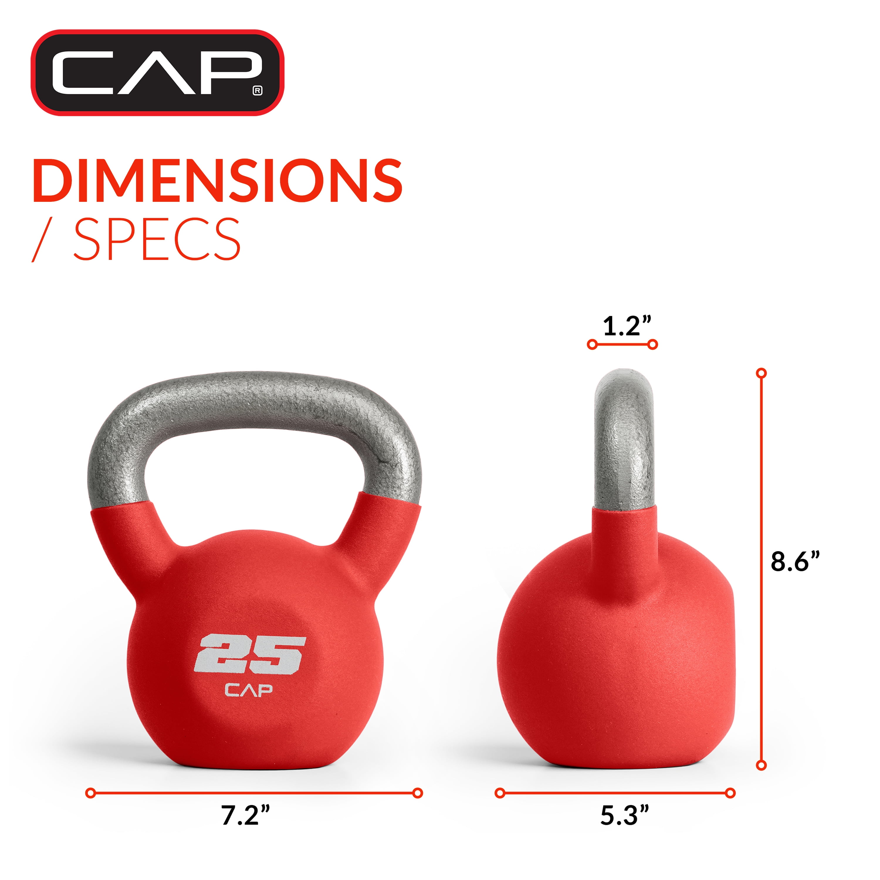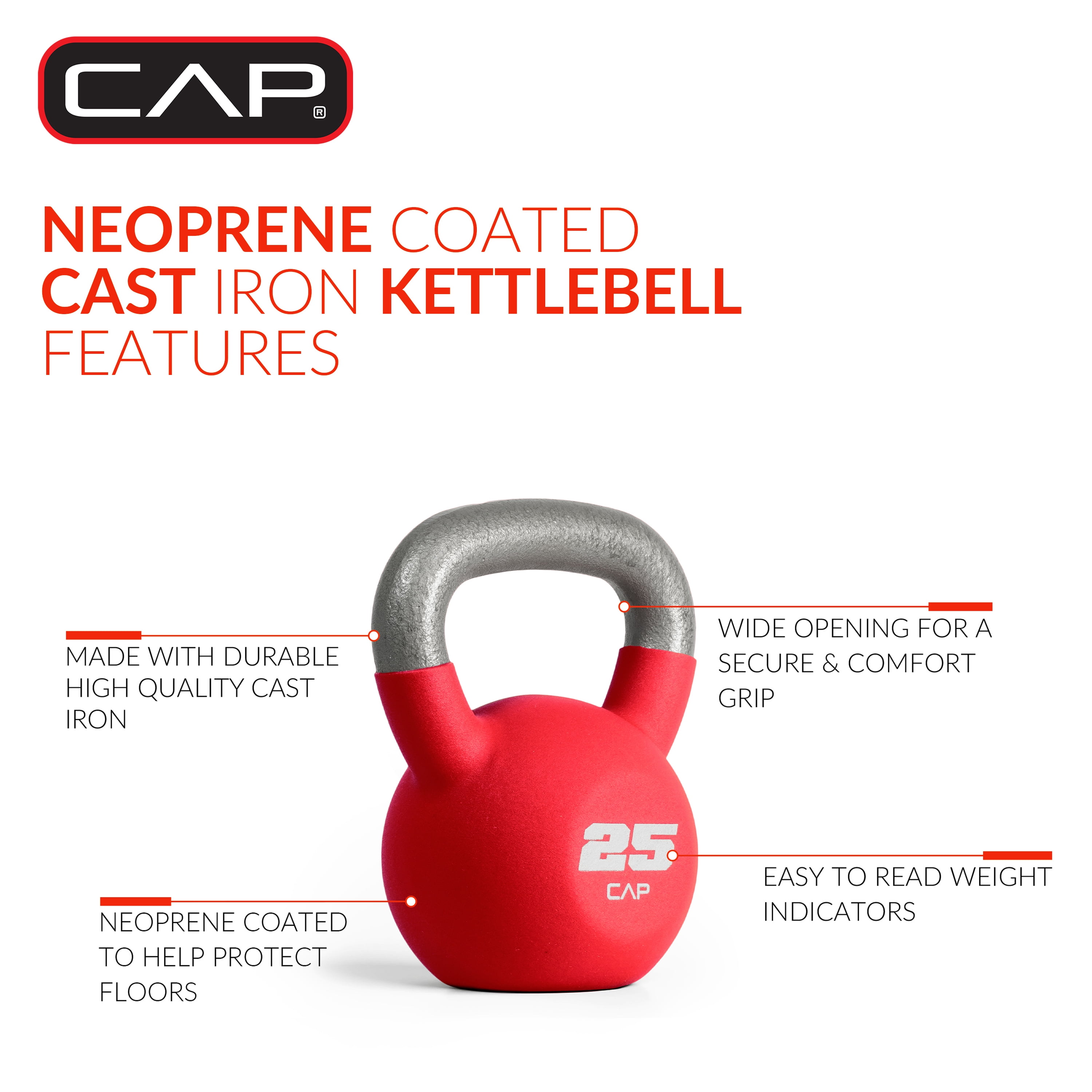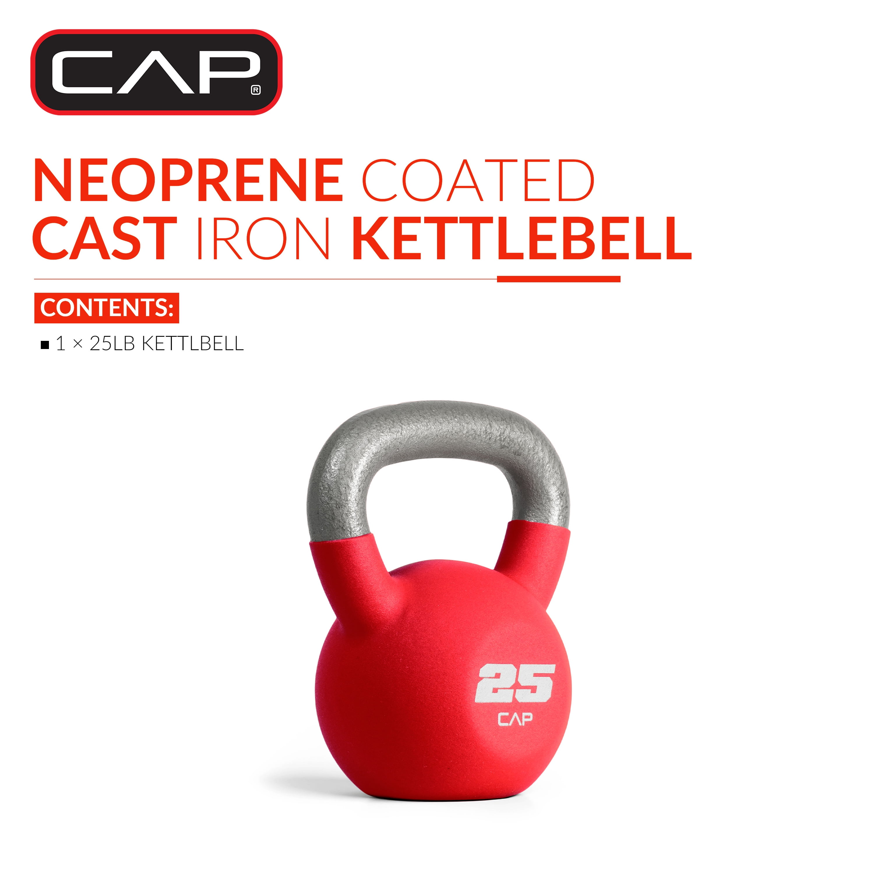 CAP Neoprene Coated 25 Lb. Kettlebell, Red: Kettlebells offer the ability to target specific muscle group exercises or get a full-body workout Cast Iron coated in Neoprene to provide exceptional protection and durability The generous wide opening handle ensures a comfortable, secure grip with one hand or two Flat bottom allows for easy, safe storage and the ability to be used in specific flat bottom kettlebell exercises Perfect for swings, deadlifts, squats, get-ups, snatches, and other athletic or cross-training workouts This kettlebell group from CAP is available in sizes 10, 15, 20, 25, 30, 35, and 40 pounds