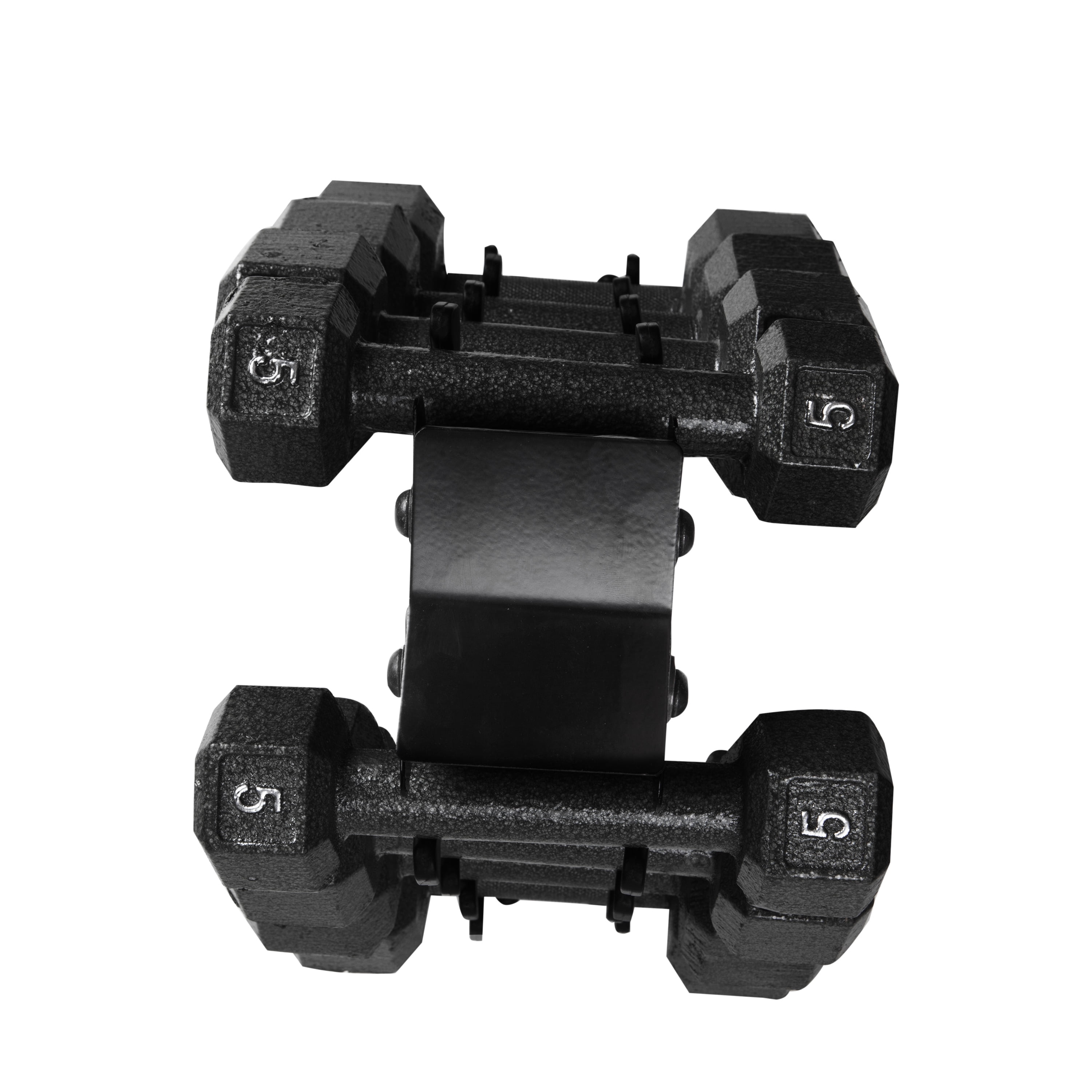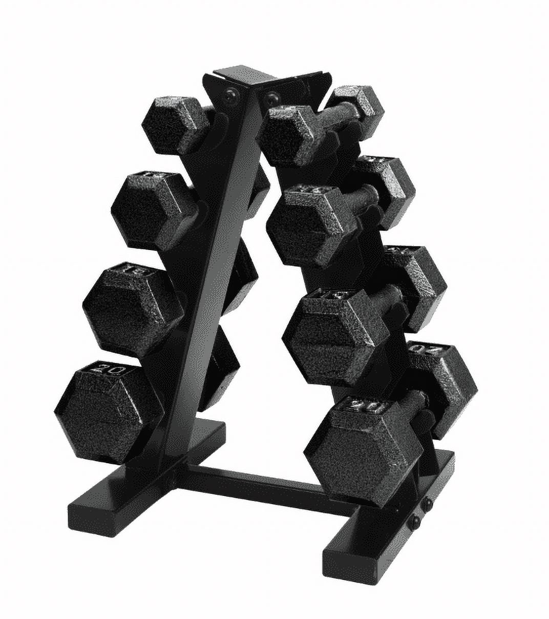 Cap Barbell 100 lb Cast Iron Hex Dumbbell Weight Set with Rack, Black: Black cast iron dumbbell set with rack Steel handles with ergonomic grip Enamel coating provides a durable and effective finish Hexagonal shape prevents rolling and allows easy storage Set includes: a 5 lb dumbbell pair, a 10 lb dumbbell pair, a 15 lb dumbbell pair, a 20 lb dumbbell pair, and a 20″ A-frame dumbbell rack for easy storage Great for both upper body and lower body workouts