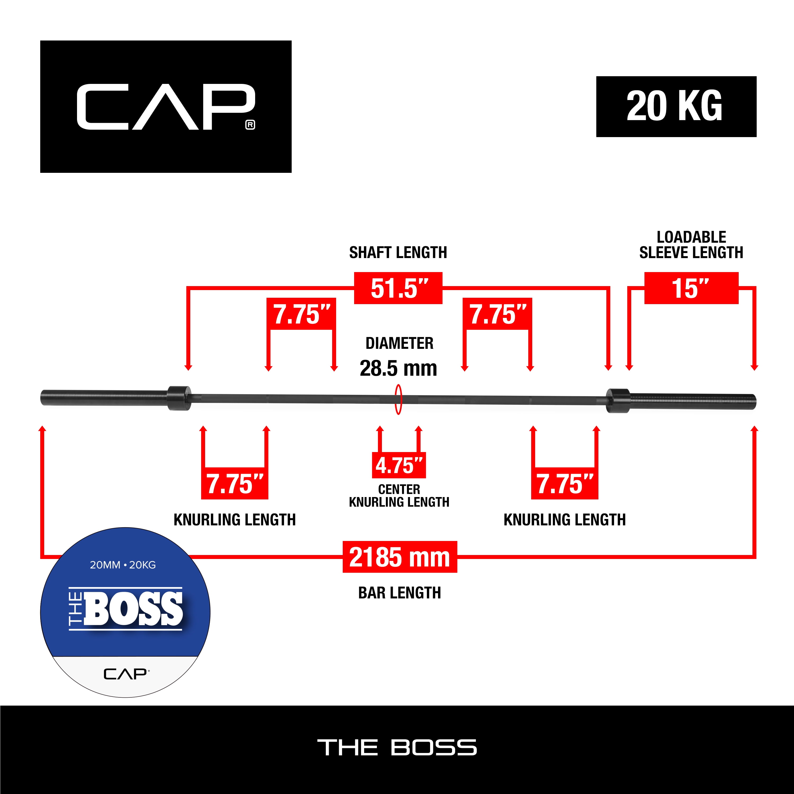 CAP Barbell Weightlifting 7 Ft. Olympic Solid Power Squat Bar, Black: Crafted with solid Japanese steel and coated with a black phosphate finish Maximum loading capacity of 1500-pounds makes this barbell ideal for experienced lifters Center knurling and side knurling provide a secure, non-slip grip 15-inch loadable sleeve length provides ample room to load Olympic weights Great for squats, bench presses, deadlifts, lunges, and much more Collars are not included