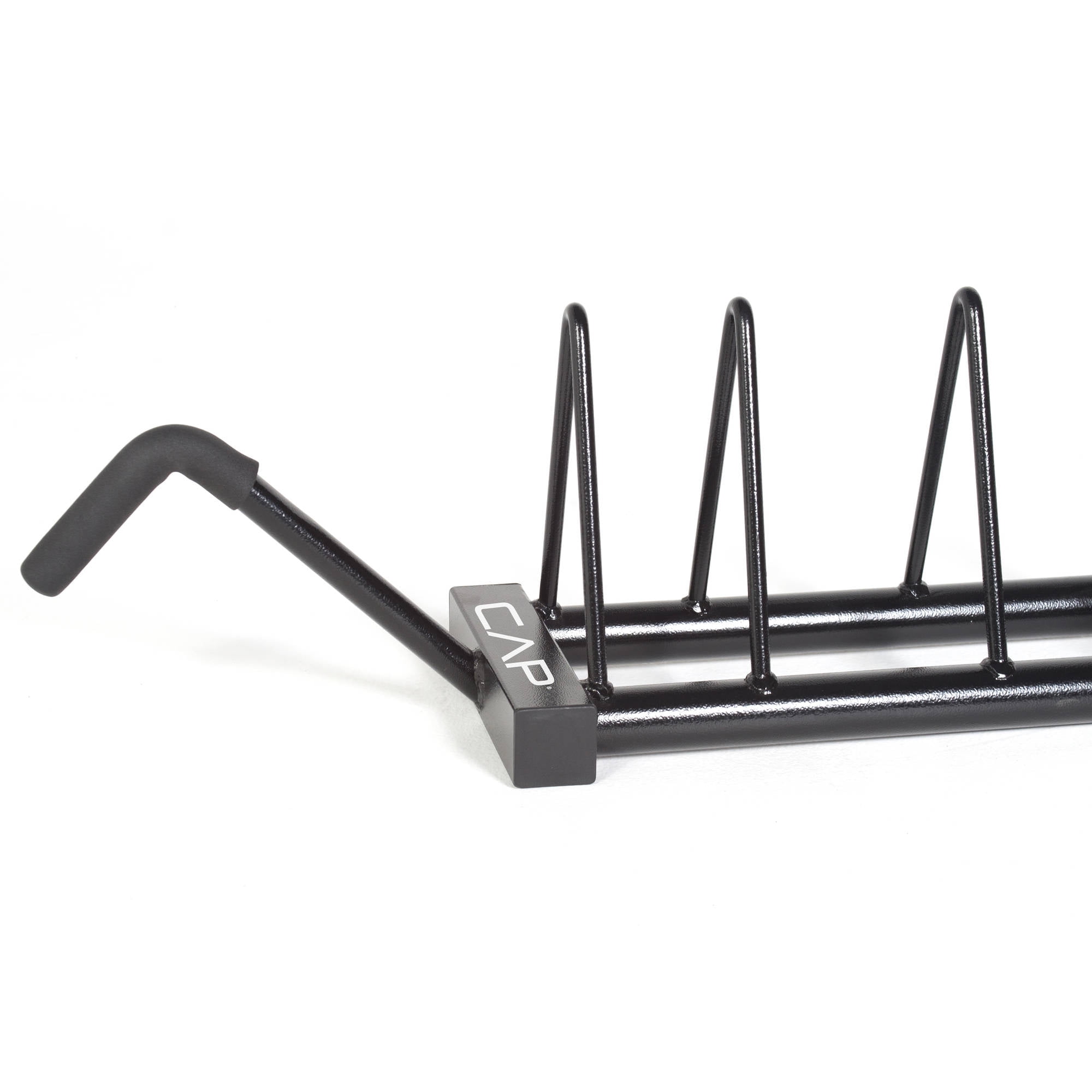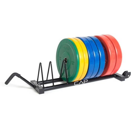 CAP Horizontal Olympic Plate Rack with Wheels: Heavy duty steel construction Equipped with transportation wheels and a handle grip for easy moving 500 lb weight capacity Storage of Olympic weight plates keeps your workout area clean and plates organized