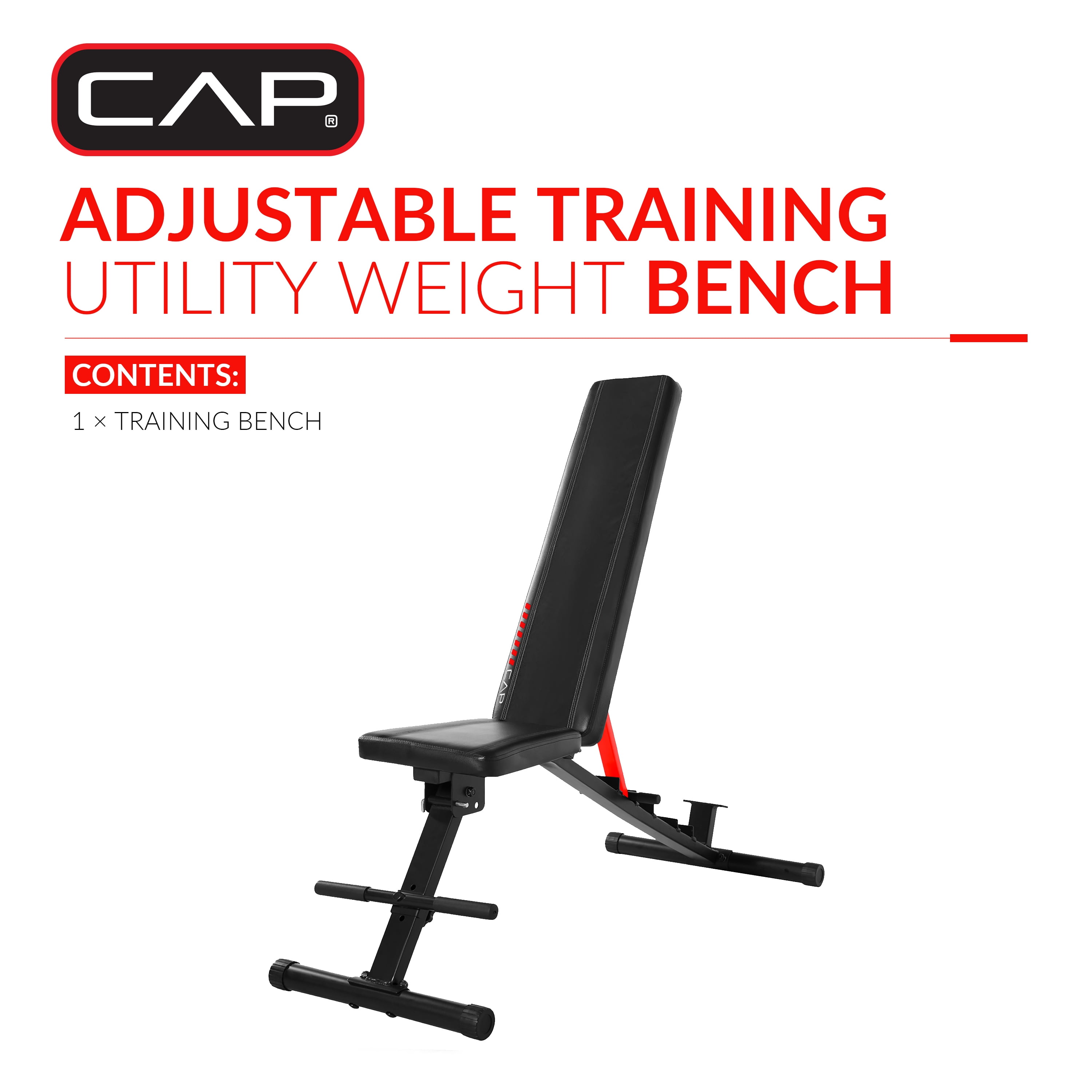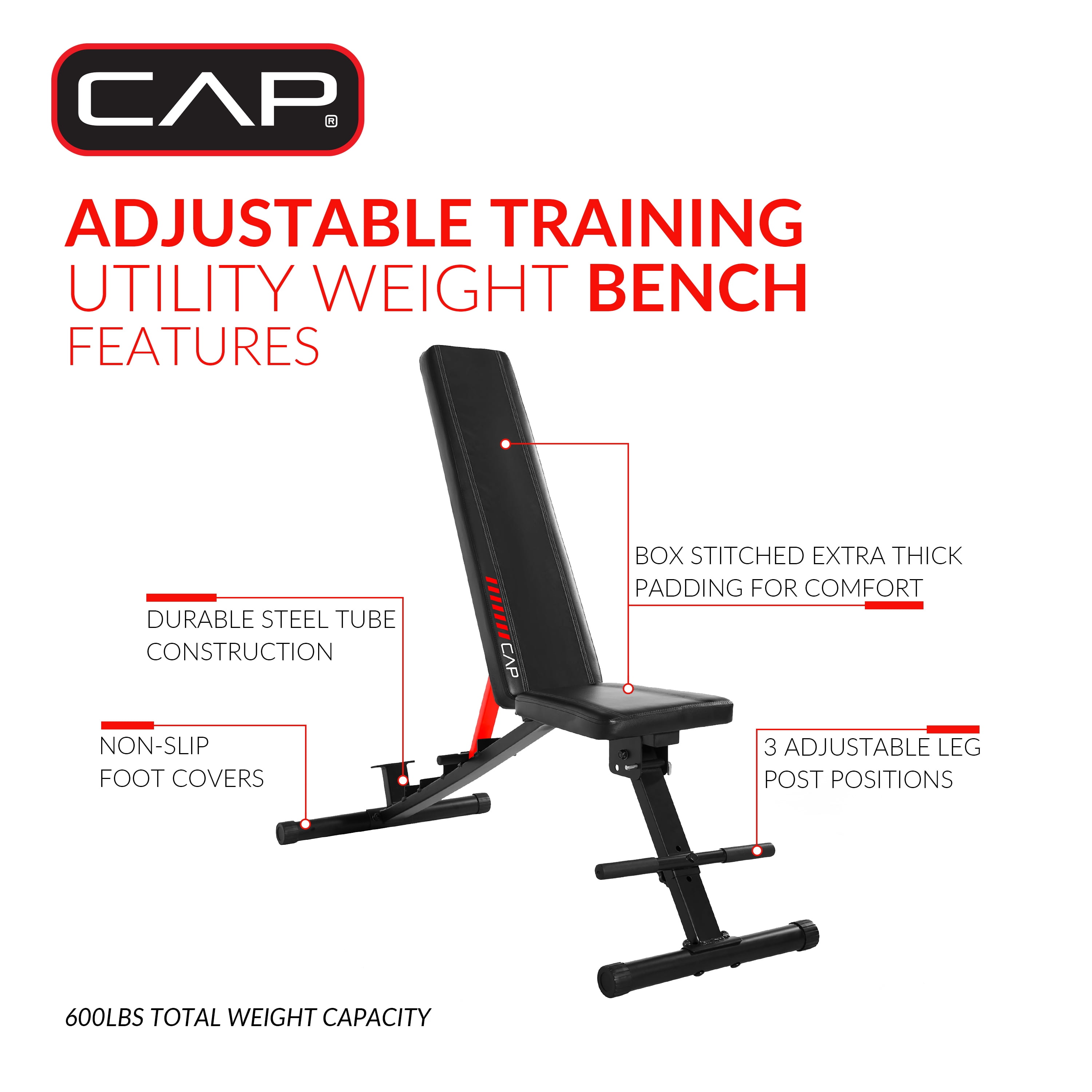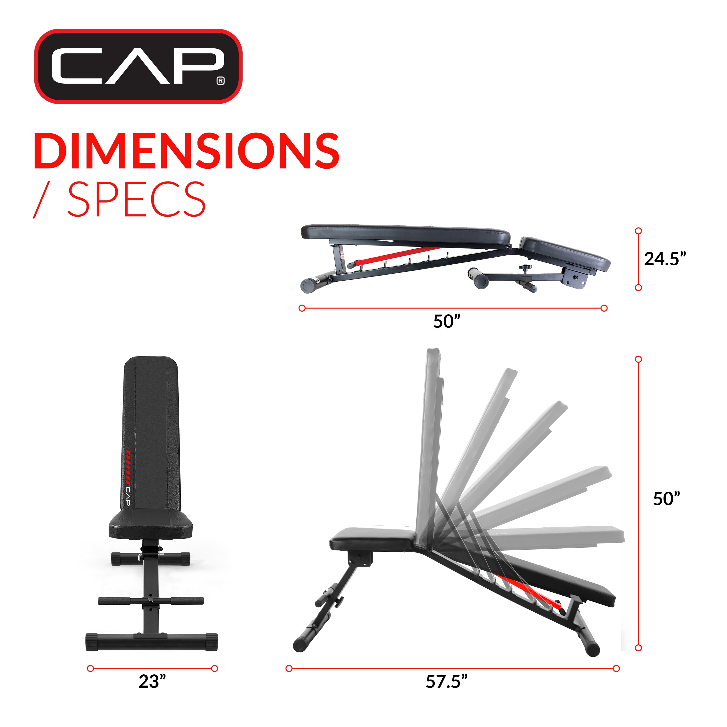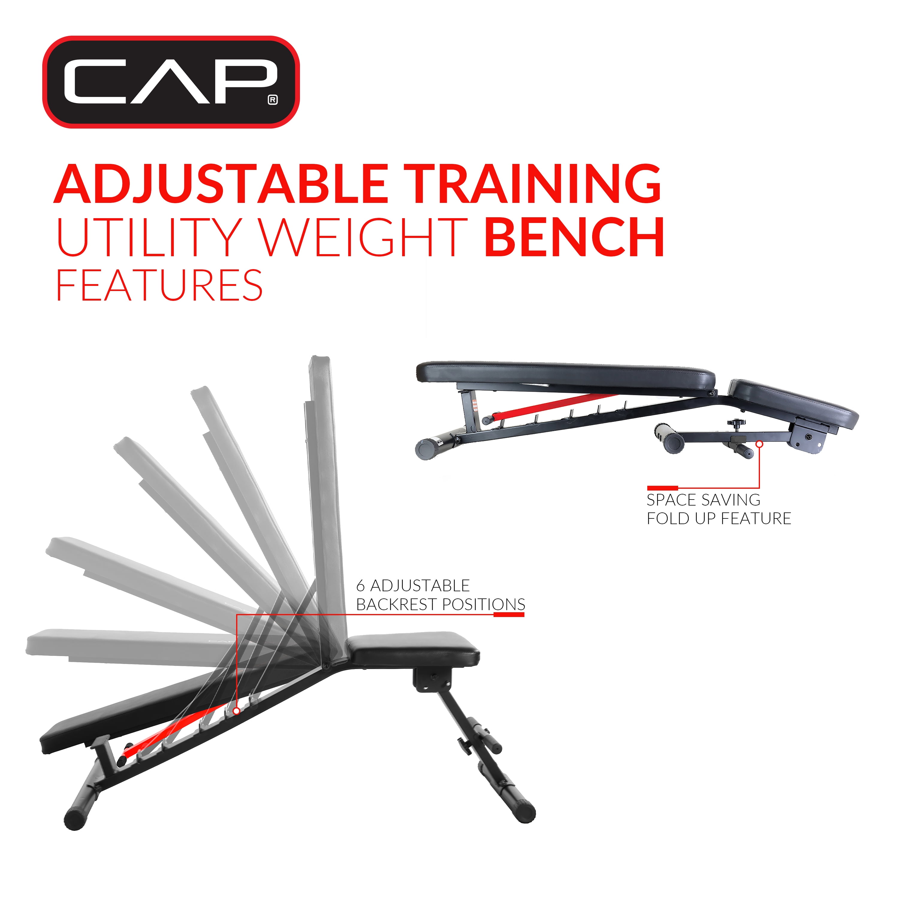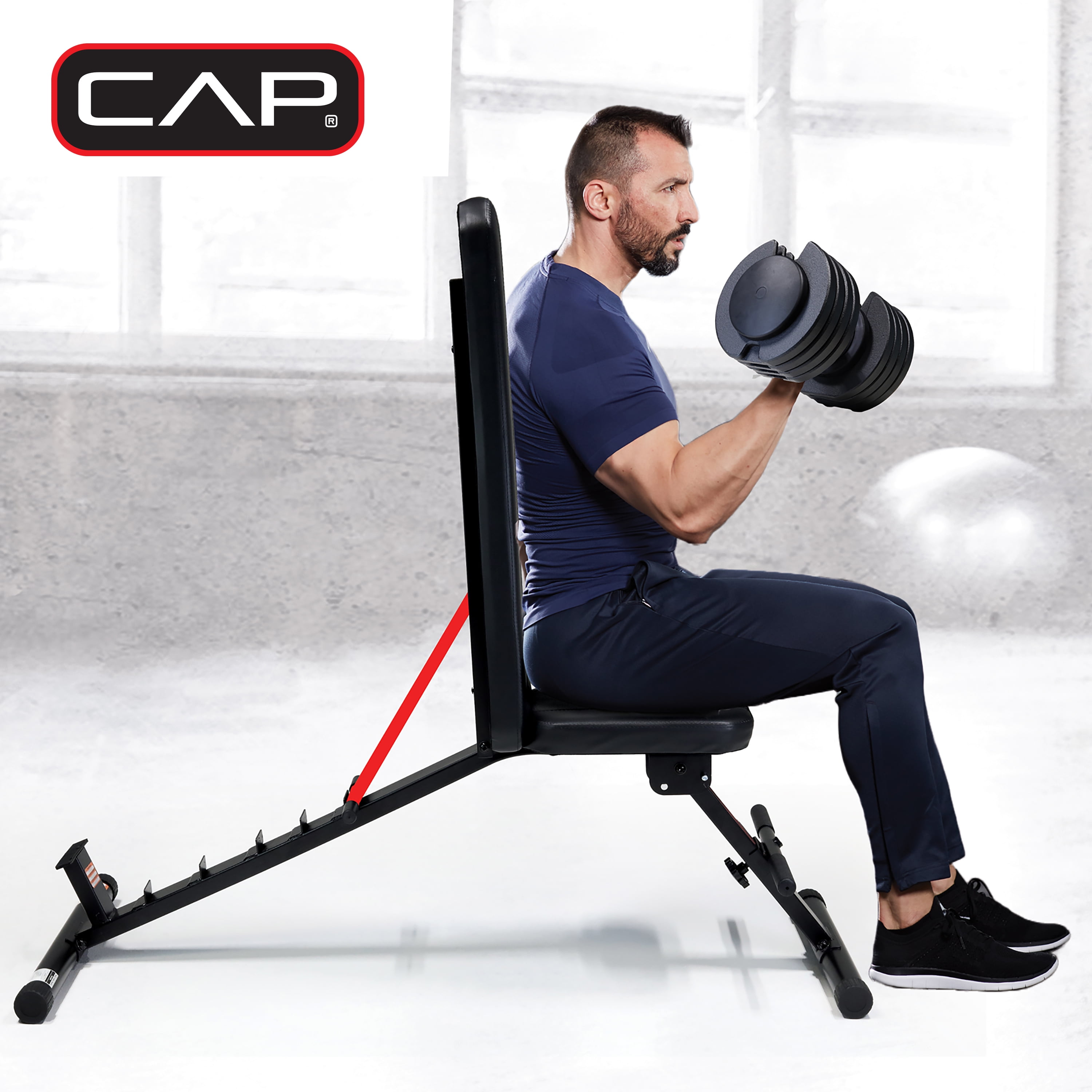 The CAP Multi Purpose Foldable Utility Weight Bench offers the flexibility and reliability needed when going strong. This adjustable flat, incline, and decline bench can enhance your workout routine by allowing a variety of workouts to be performed at different angles. Target major muscle groups and get a full body workout with this multipurpose FID bench. The double stitched boxed pad is firm yet comfortable providing less stress on your joints when going heavy. The cold rolled steel tubing and powder coated finish ensure a strong, durable weight bench that will last for years to come. Easily folds down to fit in the closet, cabinet or under a bed.