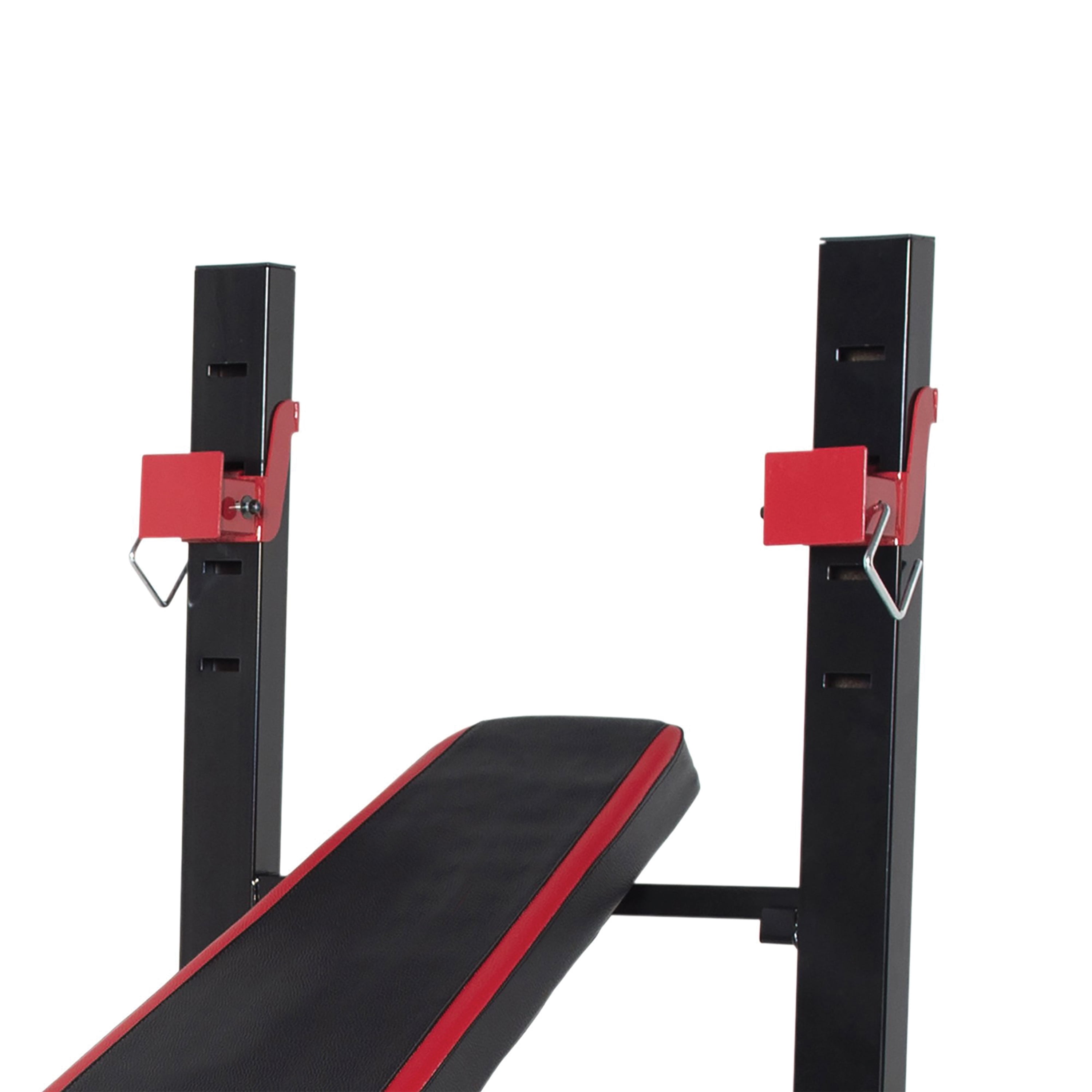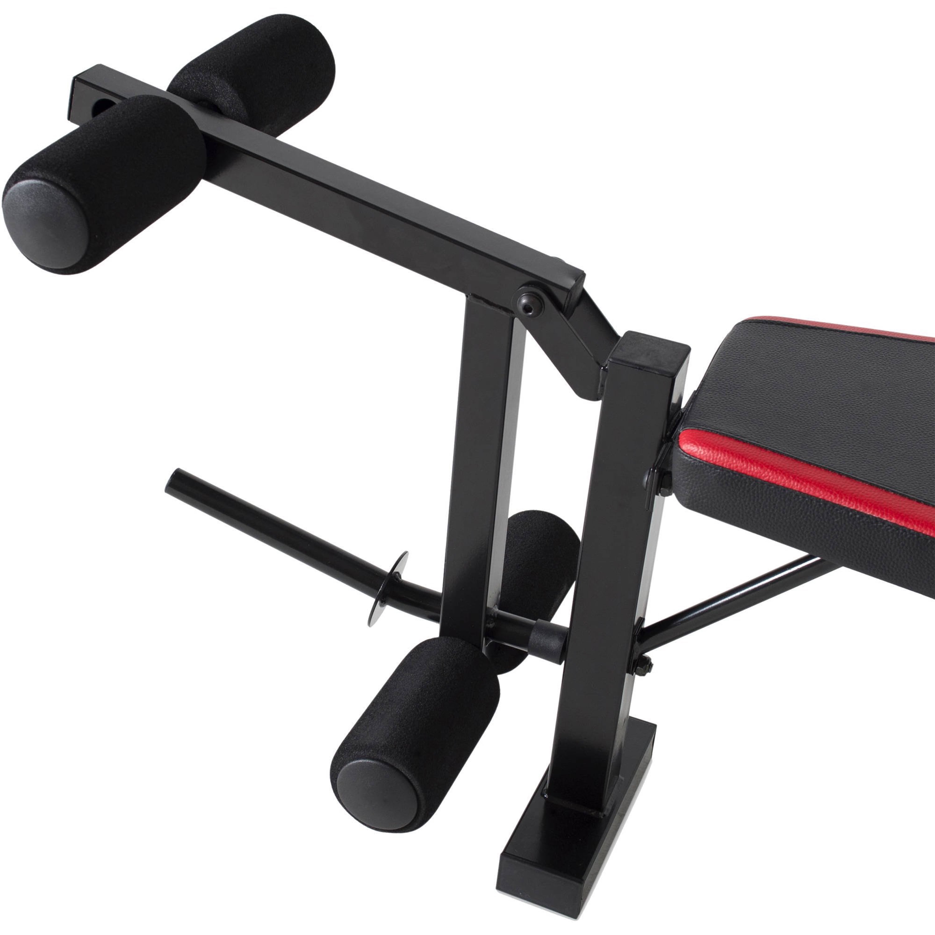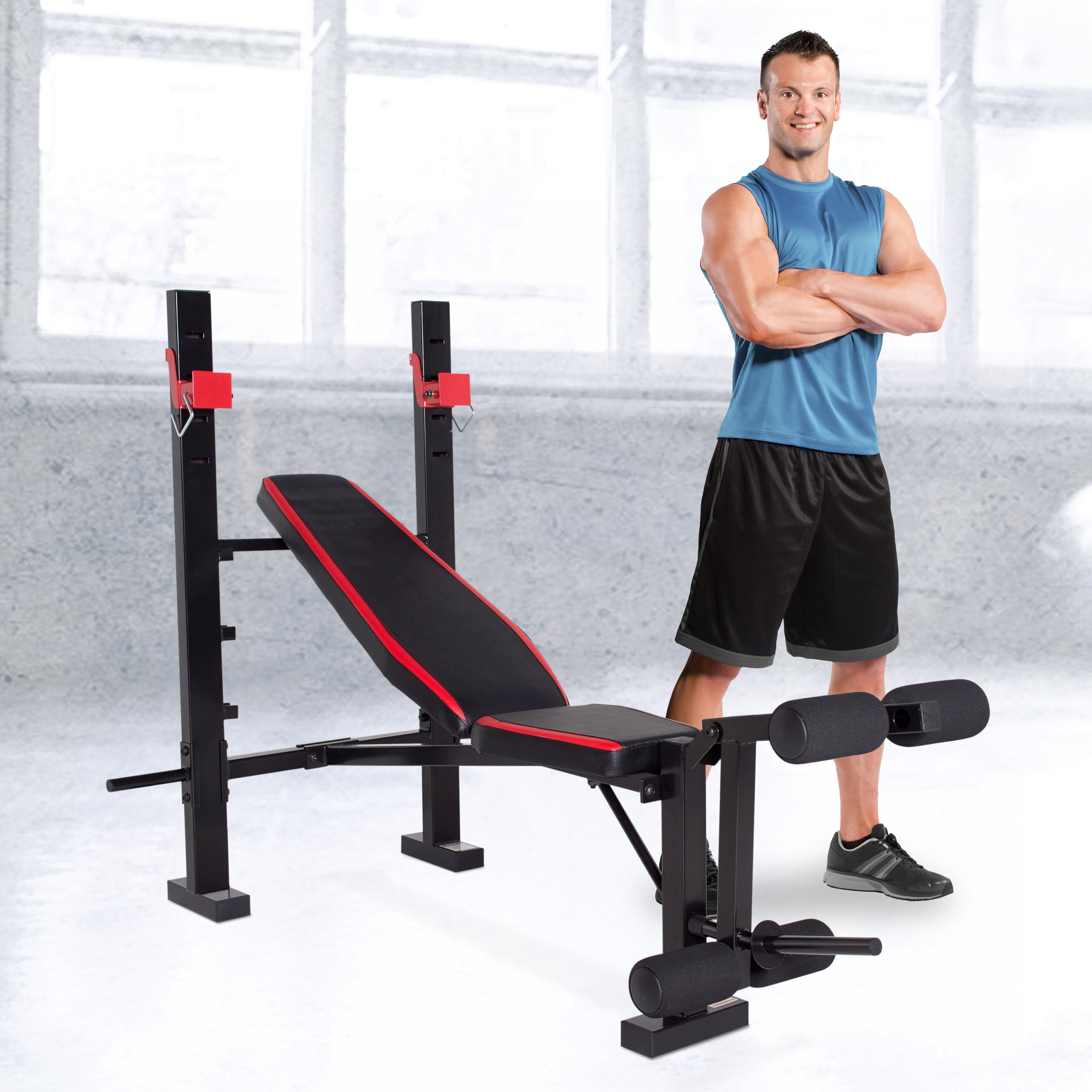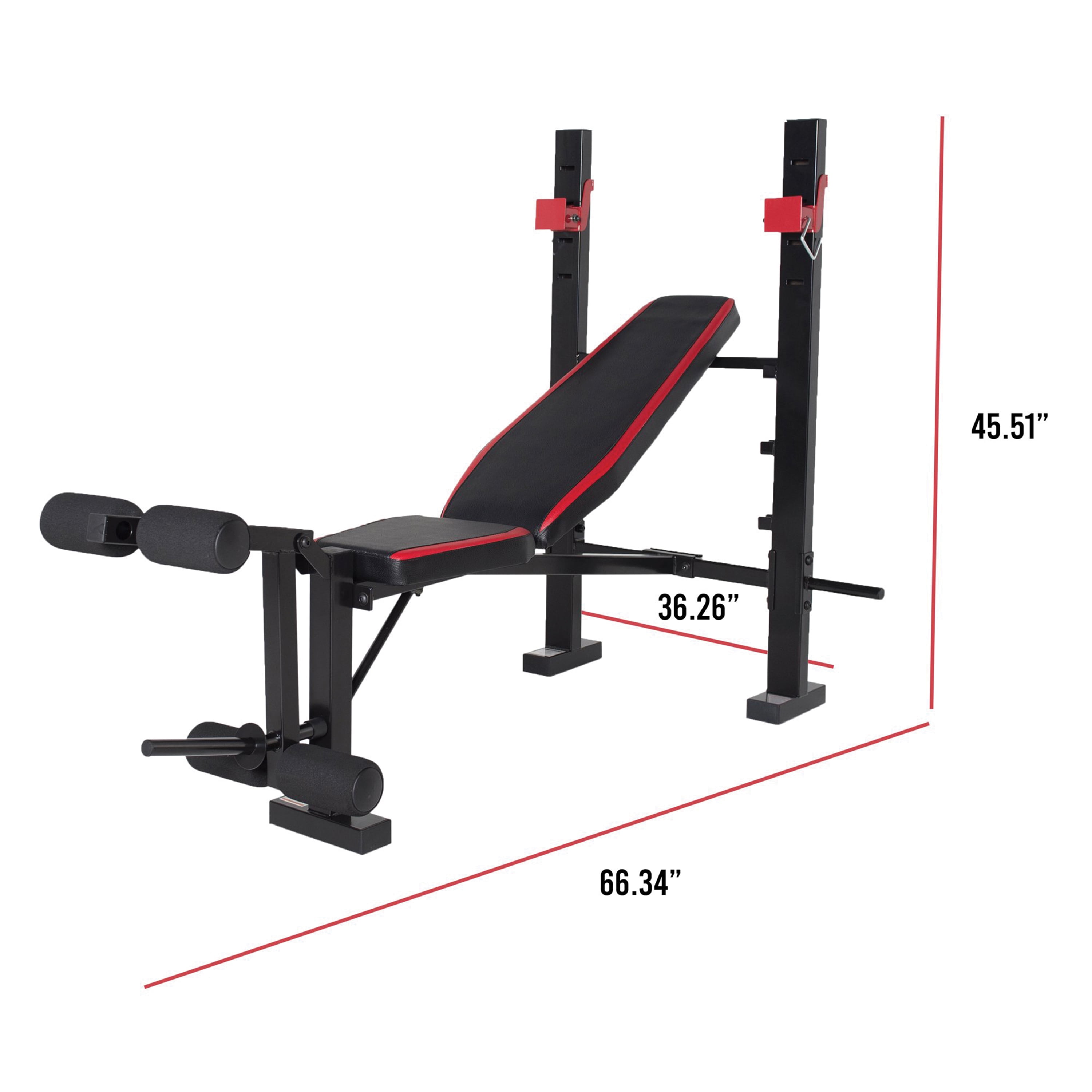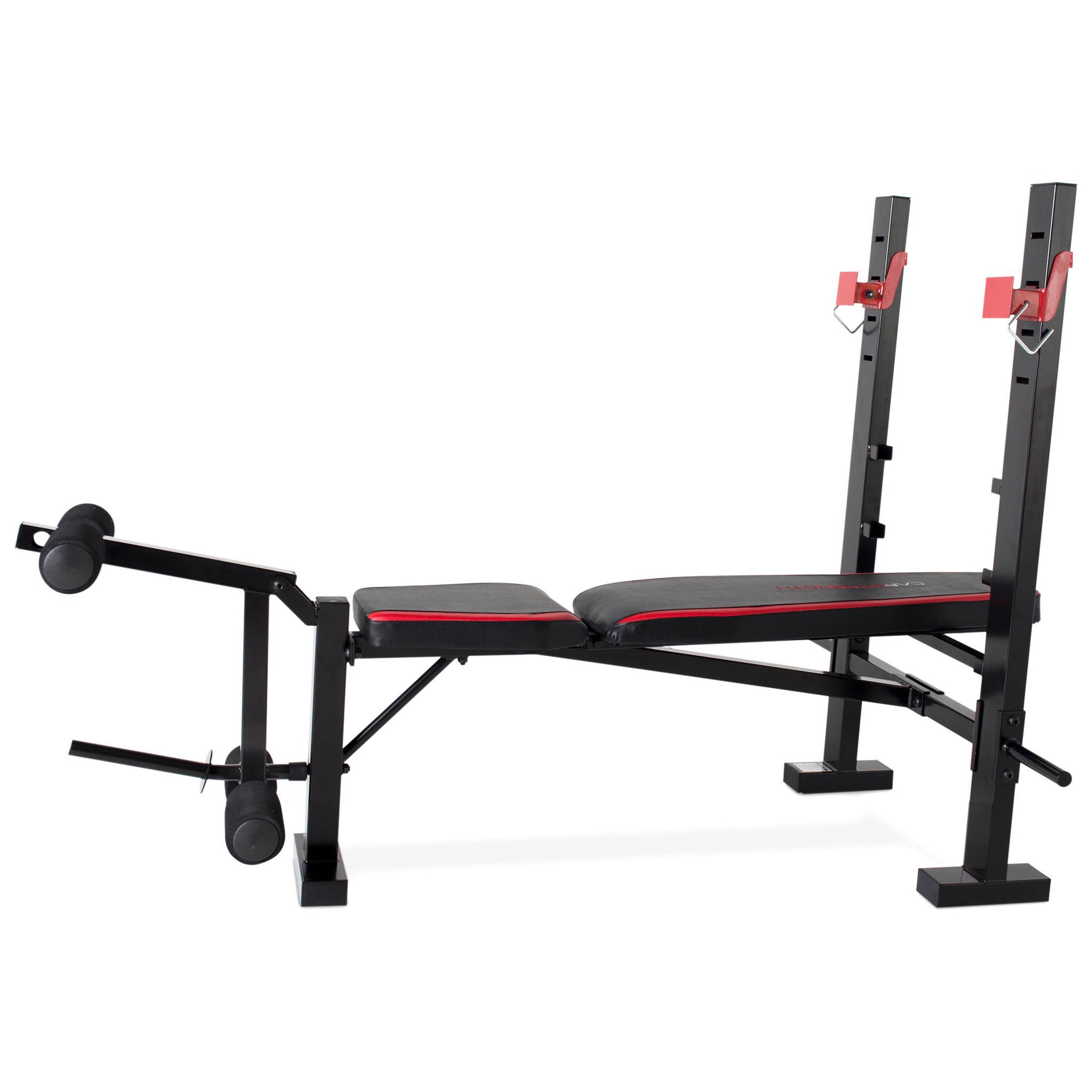 Features a back pad that adjusts to incline, flat, and decline chest press positions Accommodates most standard barbell sets with a 5- to 6-foot bar Leg developer allows user to target the hamstrings, quads, and glute muscles Padded rollers allow user to comfortably perform leg exercises Durable 14-gauge, heavy-duty steel tube frame with powder coated finish Firm and comfortable padding offers support during heavy lifts Bench is great for strength training and full body workouts 500-pound weight load capacity, including the user