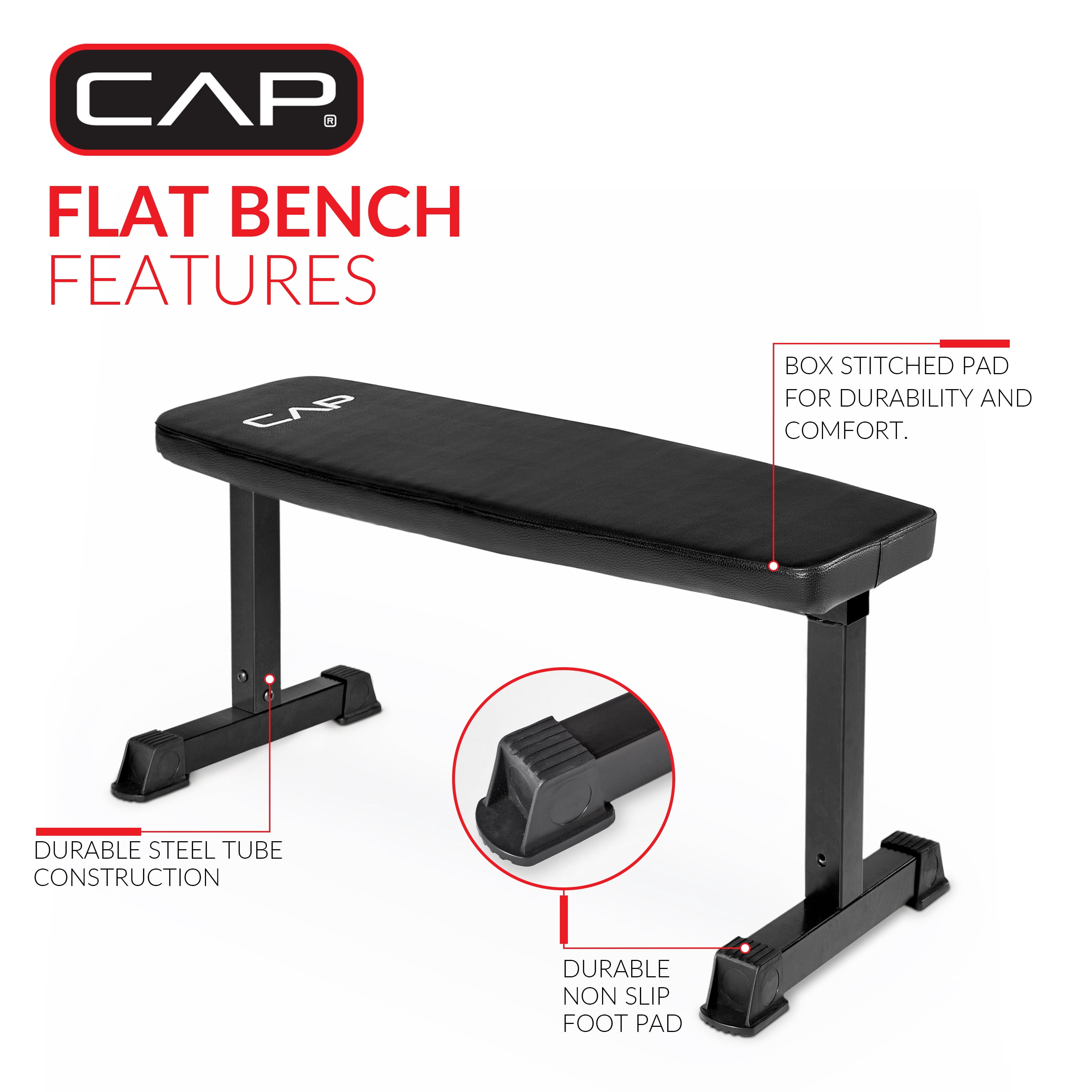 The CAP Strength Flat Weight Bench is a safe, simple and effective tool for nearly any exercise program. This workout bench features a powder-coated, tubular steel frame, with a thickly padded boxed stitched surface for strong, durable and comfortable use. The flat workout bench is ideal for not only dumbbell exercise but also for tubing or band exercises and most body weight exercises. This bench only takes a few minutes to assemble and is built for years of use.