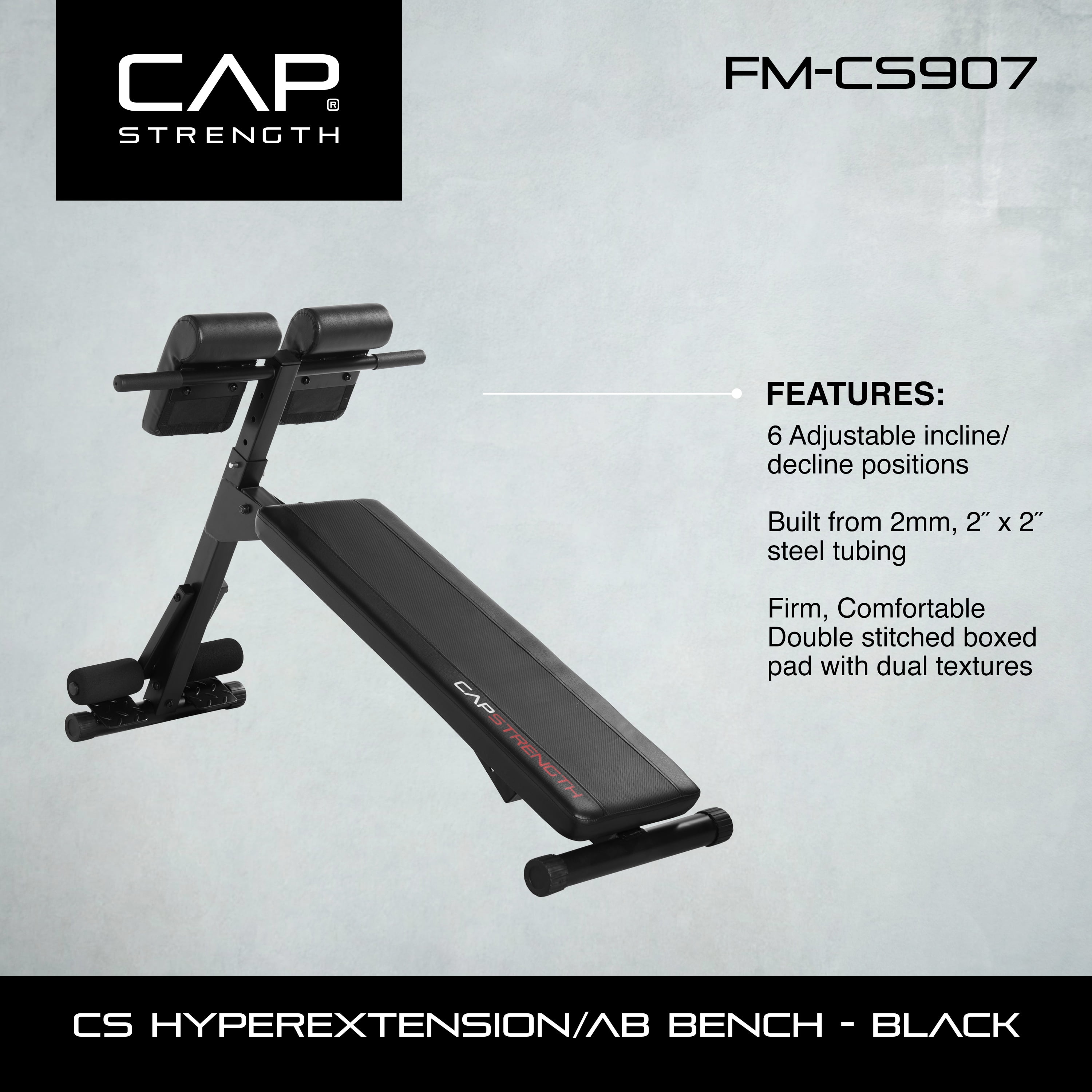 CAP’s Strength Hyperextension/Ab Bench is essentially 4 fitness products in one. This ab bench can be used as a Hyper-Extension bench, a flat weight bench, an upper body bench and a core/slant board. The padding offers a firm yet comfortable, support surface to perform body weight exercises. Tighten your core and build strength in your upper body by incorporating this hyperextension bench into your fitness routine. Engineered with correct proportions and manufactured with quality materials, this hyper extension bench is a versatile, unique body weight training product. The recommended maximum weight capacity is 300 lbs.