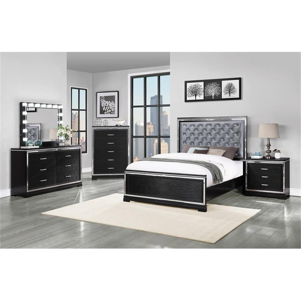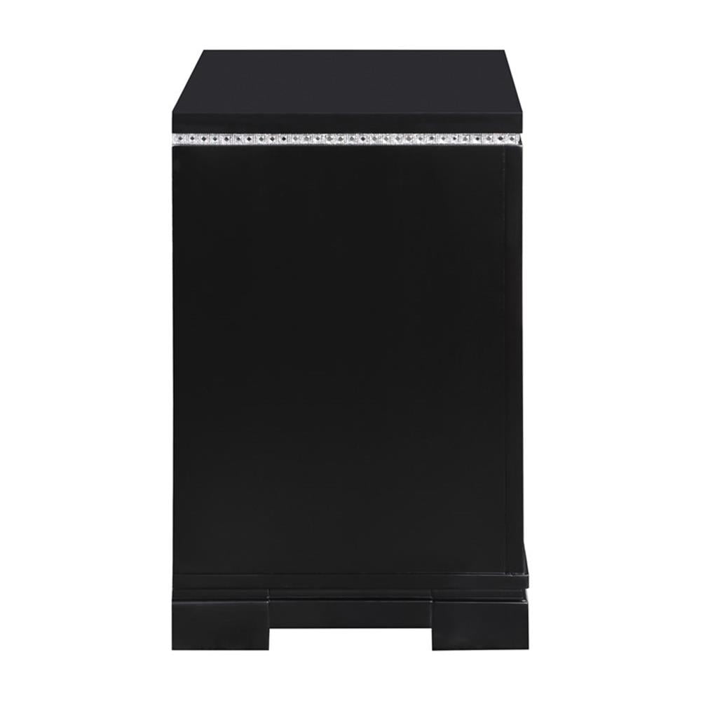 Include: One (1) nightstand Finish: Black Hardware finish: Crystal Materials: Pine An elegant and regal design sure to add fame and fortune into your glamorous bedroom decor Features mirror trim accents, grid-patterned front panels in a glowing black finish Mirrored strips reflecting elegance Dual USB charging ports Black felt-lined top drawers Drawer joinery method: Front french dovetail and back english dovetail Drawer box construction style: 4 pieces Drawer box – thickness of vertical panel: 9mm Drawer glides: Metal extension glide Drawer glide – size and length extension glide: 45mm x 9.84″L Drawer – cedar line: No Drawer – tinted drawer: Yes, all drawers Drawer – felt lined: Yes, top drawer only (in black)