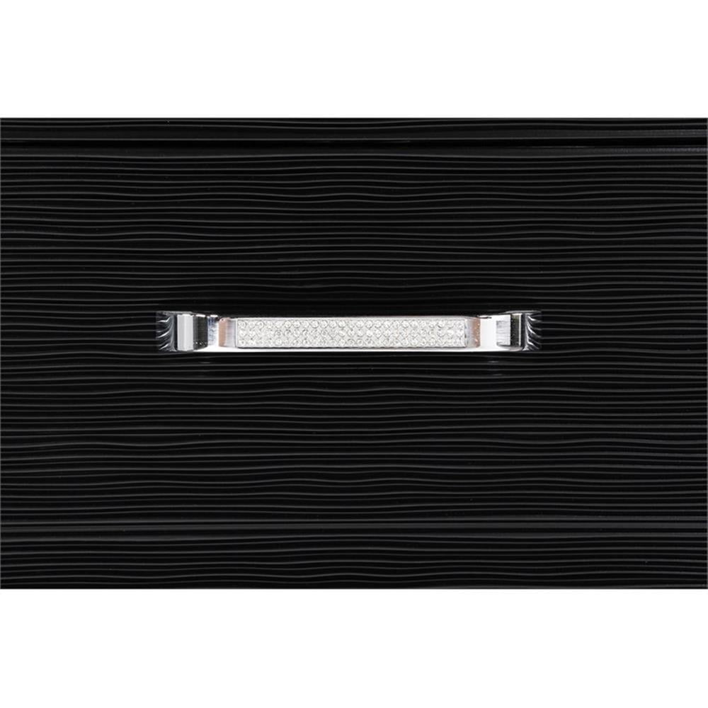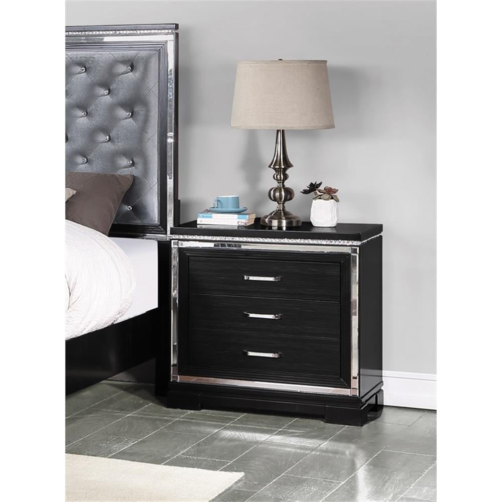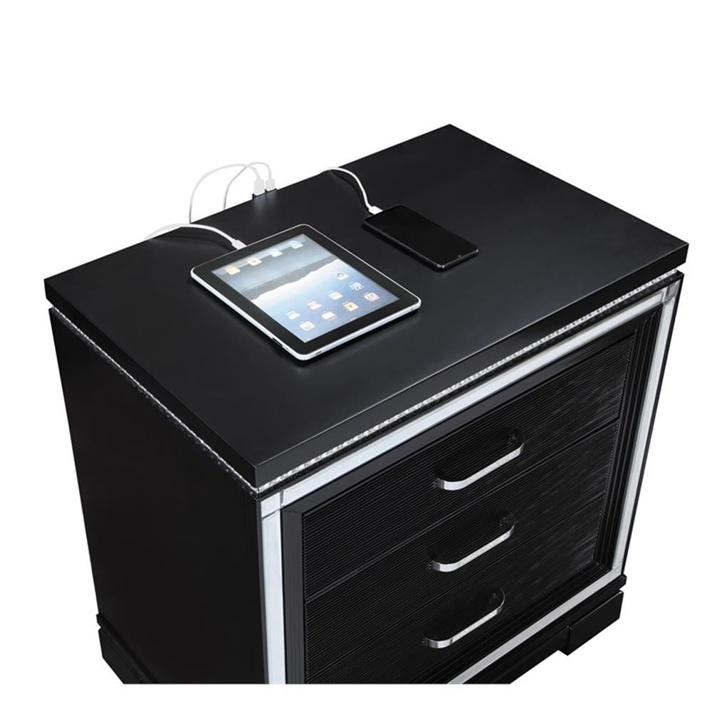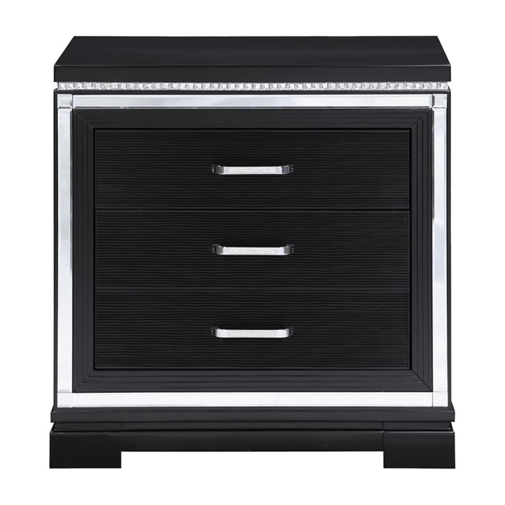 Bold, dramatic hues set the stage for clean lines and luxe details in this glam nightstand. Glimmering accents such as polished mirror trim create a border around the stacked drawers, capped with corner mirror tiles. A dark black finish offsets the polished and sparkling accents, while offering modern sensibilities like USB charging ports and a felt-lined top drawer for delicates. Along the drawer fronts is a wood grain surface that adds a hint of texture. Along the tabletop surface is a crystal-like border, mirrored also in the sleek hardware pulls. Features: Include: One (1) nightstand Finish: Black Hardware finish: Crystal Materials: Pine An elegant and regal design sure to add fame and fortune into your glamorous bedroom decor Features mirror trim accents, grid-patterned front panels in a glowing black finish Mirrored strips reflecting elegance Dual USB charging ports Black felt-lined top drawers Drawer joinery method: Front french dovetail and back english dovetail Drawer box construction style: 4 pieces Drawer box – thickness of vertical panel: 9mm Drawer glides: Metal extension glide Drawer glide – size and length extension glide: 45mm x 9.84″L Drawer – cedar line: No Drawer – tinted drawer: Yes, all drawers Drawer – felt lined: Yes, top drawer only (in black) Specifications: Product Dimensions: 29″H x 28.25″W x 18.5″D Product Weight: 59.52 lbs Number of Drawers: 3 Drawer Weight Capacity: 60 lbs Assembly Required: No Warranty: One (1) year limited manufacturer warranty