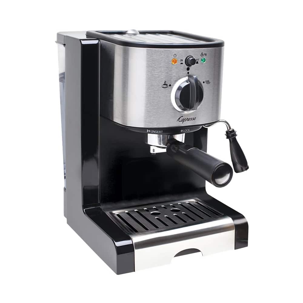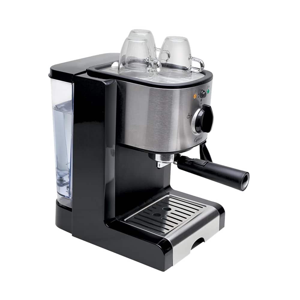 Brew a cup of delicious gourmet coffee with this Capresso machine. The two sieves allow dual brewing of espresso and unlimited steam output for perfectly frothed cappuccinos, and the self-locking filter ensures everything stays in place. The ThermoBlock heating system in this Capresso machine has 15 bars of pressure for high-quality results.