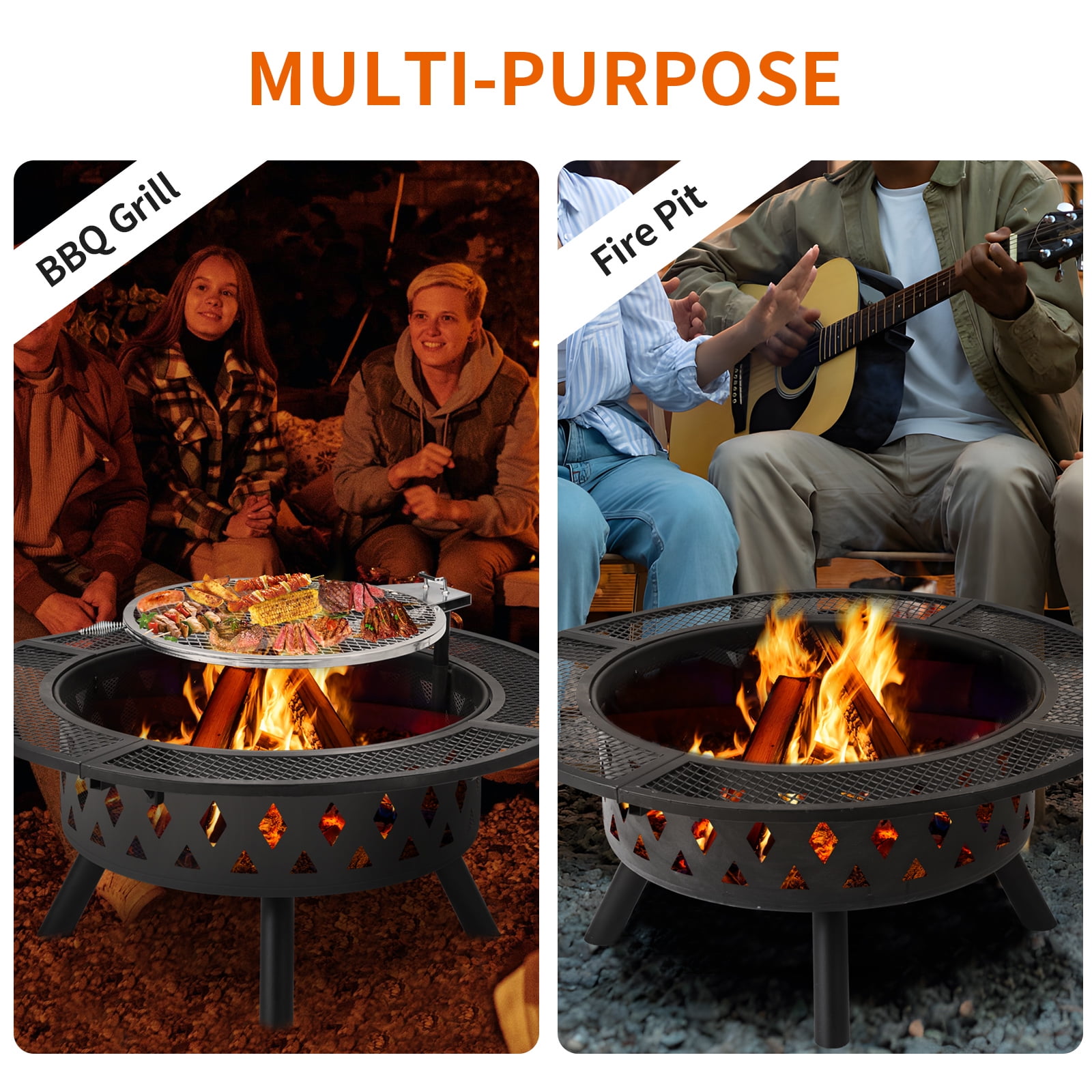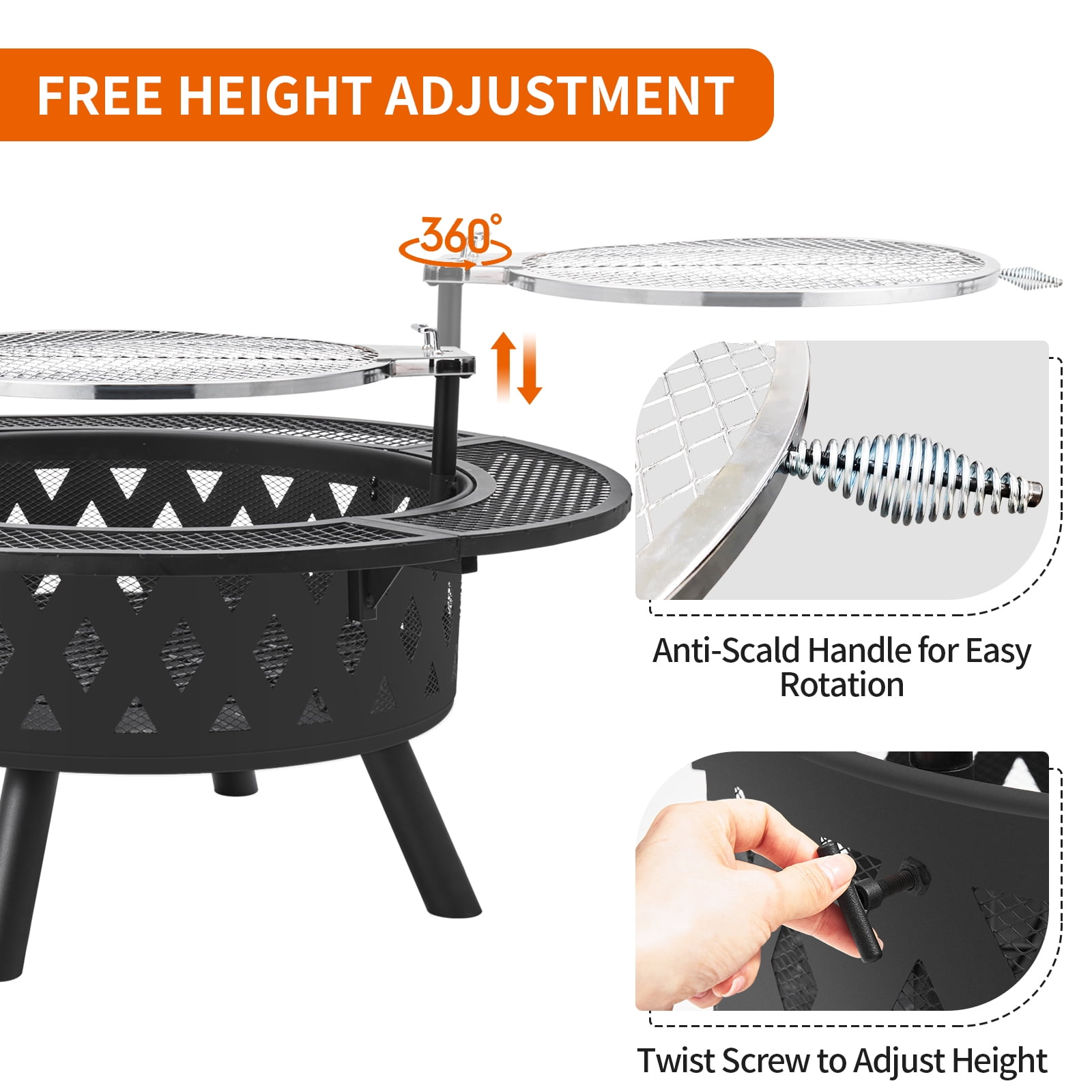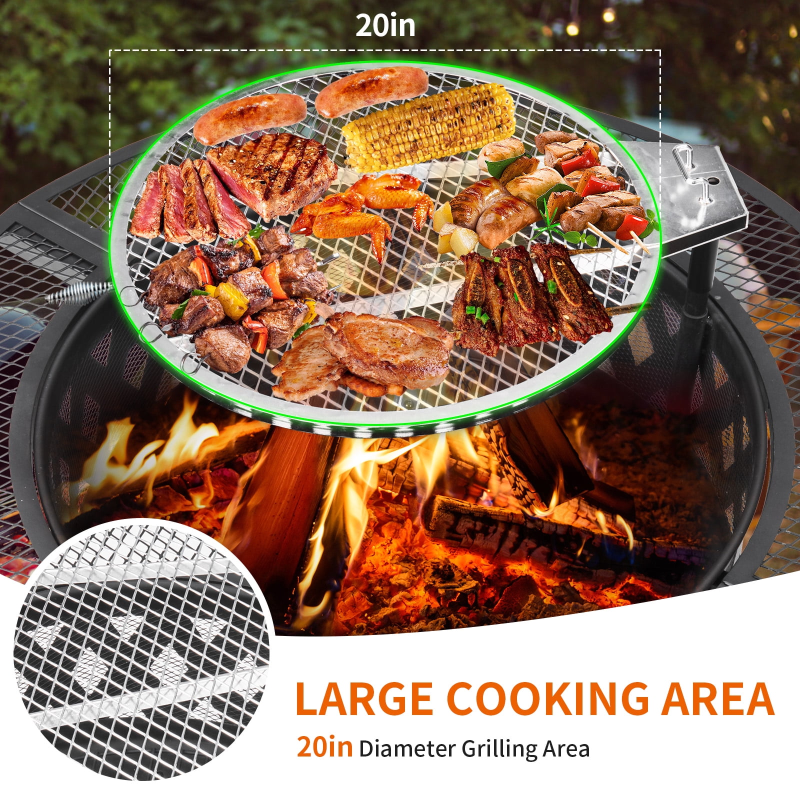 【2 IN 1 OUTDOOR FIRE PIT WITH GRILL】Experience the versatility of our wood-burning fire pit, a perfect blend of outdoor heating and grilling. With a multi-functional design, it includes a cooking grate and an outer ring for convenient mobility around the central fire area. The premium round table shape, supported by 3 sturdy legs, ensures both stability and support for an enjoyable and reliable outdoor experience. 【360 DEGREE ROTATION COOKING GRATE】Featuring a safe 20-inch diameter grill area with heat-resistant handles, the cooking grate ensures a secure cooking experience. The barbecue grill is designed for 360-degree swiveling, allowing for easy movement to the left or right. Moreover, the grill is adjustable both up and down, securely fixed in place with screws. 【EFFICIENT COMBUSTION & EASY TO CLEAN】Designed with a log grate and mesh ventilation holes, this outdoor fire pit enhances airflow, ensuring a stable flame and efficient combustion. It facilitates easy soot removal and drainage, simplifying the cleaning process after use. 【EASY TO ASSEMBLE】Our product comes packaged within one box with all necessary parts, tools, and instructions. Following our clear assembly instruction, it only takes 15-20 minutes to assemble this fire pit table. 【Service Guarantee】 If you have any other questions, please feel free to contact us. We will provide caring customer service and professional warranty services to escort your shopping journey. We will always serve you and warm your life!