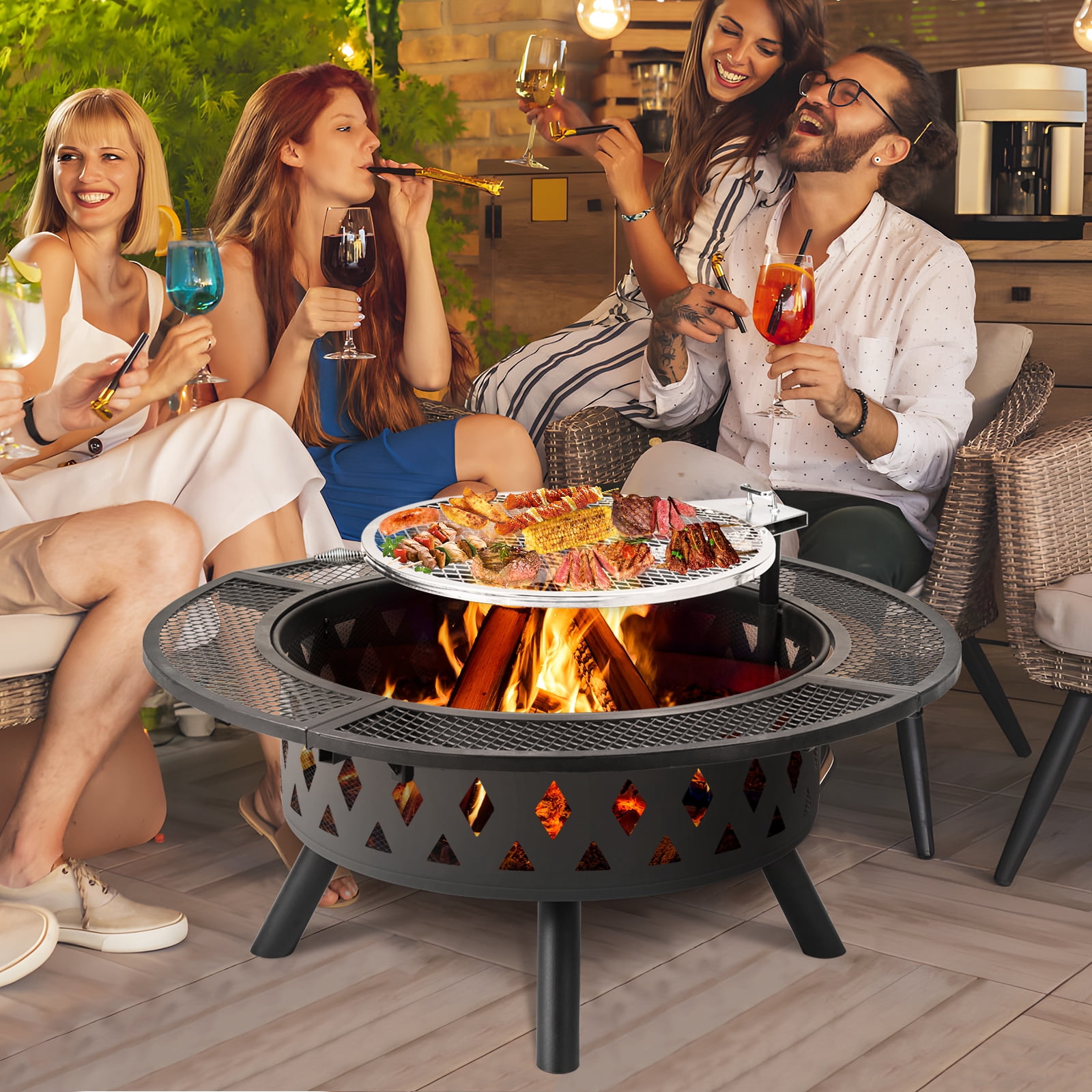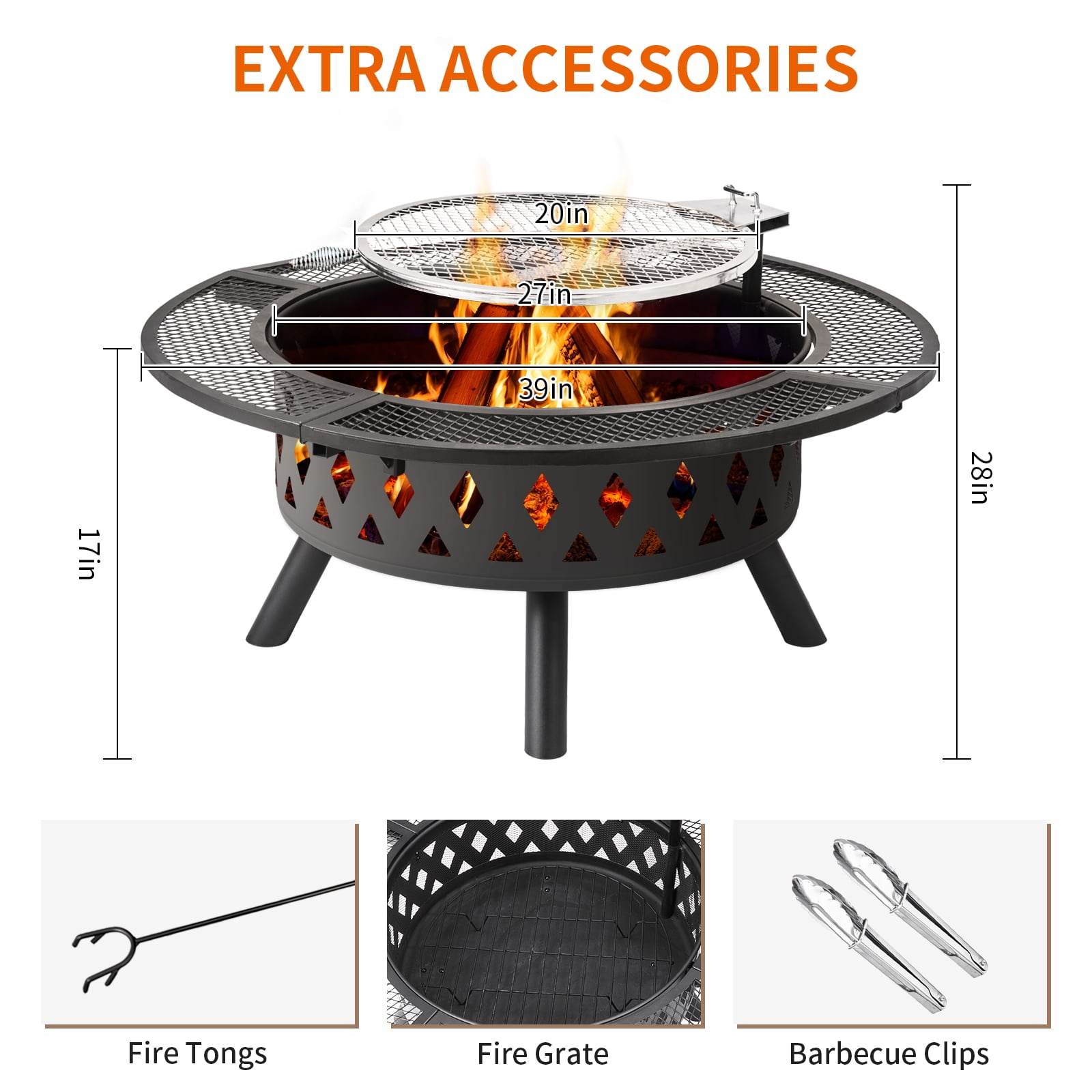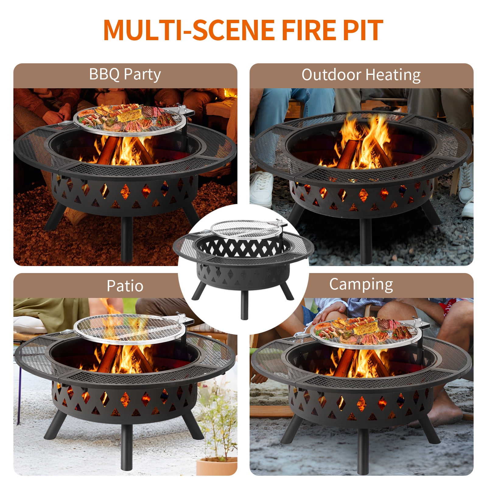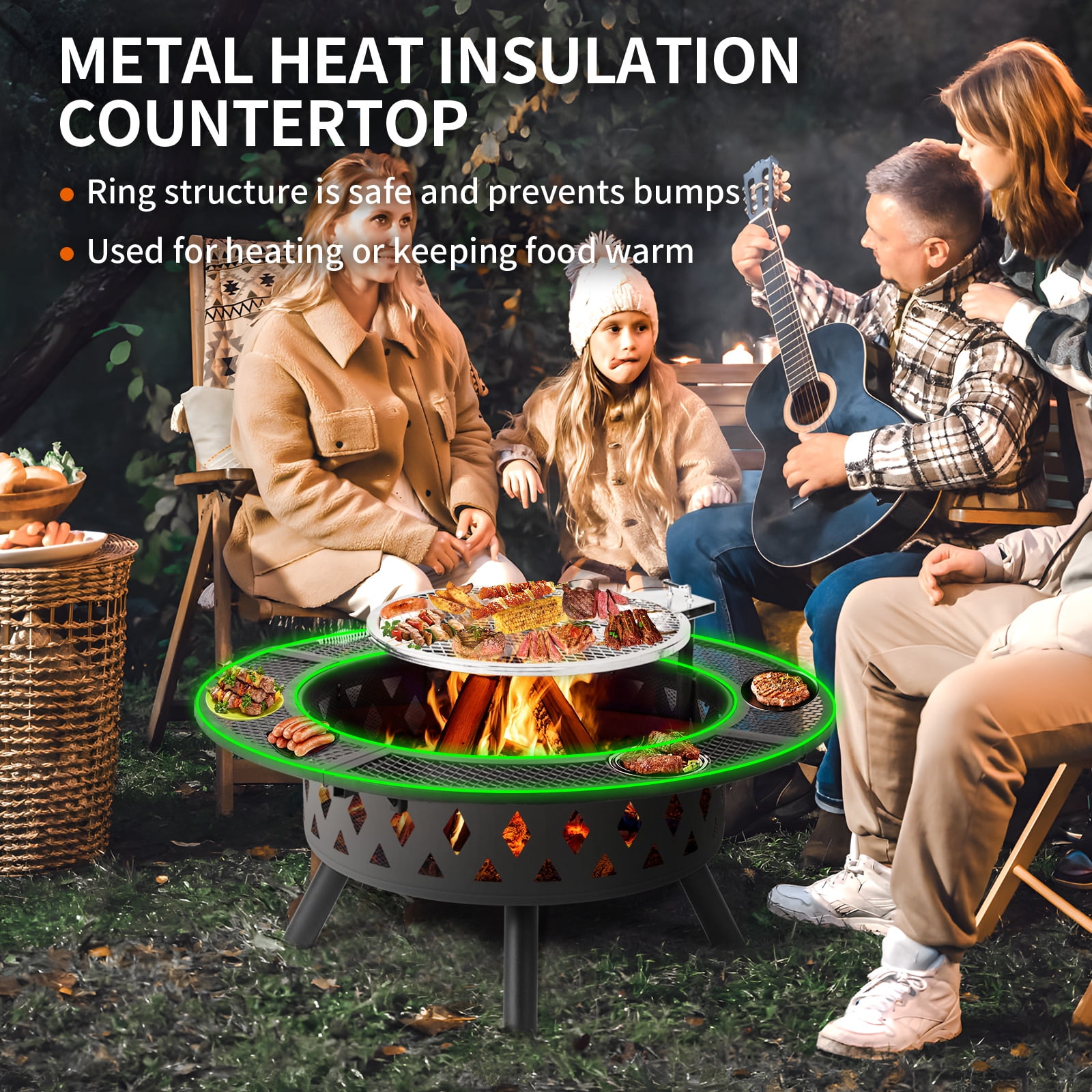 【2 IN 1 OUTDOOR FIRE PIT WITH GRILL】Experience the versatility of our wood-burning fire pit, a perfect blend of outdoor heating and grilling. With a multi-functional design, it includes a cooking grate and an outer ring for convenient mobility around the central fire area. The premium round table shape, supported by 3 sturdy legs, ensures both stability and support for an enjoyable and reliable outdoor experience. 【360 DEGREE ROTATION COOKING GRATE】Featuring a safe 20-inch diameter grill area with heat-resistant handles, the cooking grate ensures a secure cooking experience. The barbecue grill is designed for 360-degree swiveling, allowing for easy movement to the left or right. Moreover, the grill is adjustable both up and down, securely fixed in place with screws. 【EFFICIENT COMBUSTION & EASY TO CLEAN】Designed with a log grate and mesh ventilation holes, this outdoor fire pit enhances airflow, ensuring a stable flame and efficient combustion. It facilitates easy soot removal and drainage, simplifying the cleaning process after use. 【EASY TO ASSEMBLE】Our product comes packaged within one box with all necessary parts, tools, and instructions. Following our clear assembly instruction, it only takes 15-20 minutes to assemble this fire pit table. 【Service Guarantee】 If you have any other questions, please feel free to contact us. We will provide caring customer service and professional warranty services to escort your shopping journey. We will always serve you and warm your life!