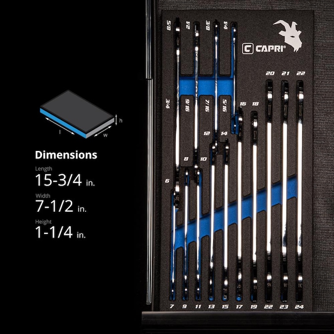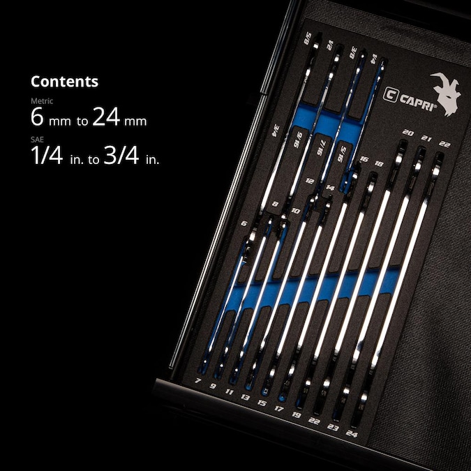 The Capri Tools Super-Thin Open End Wrenches have ultra low profiles that let you reach fasteners in tight clearance. As thin as 2.2 to 5.6 mm, these open end wrenches are truly versatile and come in handy in a wide variety of applications. The wrench head is tipped at a 15-degree angle. Useful especially in narrow spots, after each 15-degree turn, flip the wrench over to quickly engage the fastener again. These super-thin wrenches are constructed of our premium Chrome Vanadium steel, forged with a complete 10-step state of the art heat treatment process. They are made for serious professional and made to last. Each is plated with our flawless SmartKrome plating, achieved through thorough polishing and careful application, to ensure durability and corrosion resistance. Set comes with 14 open end wrenches with 20 metric and 8 SAE sizes: 6, 7, 8, 9, 10, 11, 12, 13, 14, 15, 16, 17, 18, 19, 20, 21, 22, 23, 24mm, 1/4, 5/16, 3/8, 7/16, 1/2, 9/16, 5/8 and 3/4-in. Thinness: 2.2mm thin (6-7mm and 1/4-5/16-in open ends), 2.6mm thin (8-11mm and 3/8-7/16-in open ends), 3.6mm thin (12-15mm and 1/2-9/16-in open ends), 4.6mm thin (16-19mm and 5/8-3/4-in open ends), 5.6mm thin (20-24mm open ends). Comes in our own spill-resistant Mechanics Tray for easy organization and storage. Tray dimensions: 15-3/4-in (L) x 7-1/2-in (W) x 1-1/4-in (H), fits comfortably in most tool chests and cabinets.