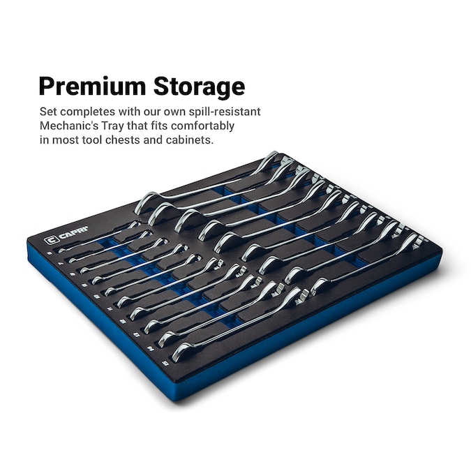 • 19-piece metric set with 19 sizes: 6, 7, 8, 9, 10, 11, 12, 13 , 14, 15, 16, 17, 18, 19, 20, 21, 22, 23, 24 mm. Comes in our own spill-resistant Mechanics Tray for easy organization and storage. Tray dimensions: 16-2/5 in. (L) x 12 in. (W) x 1-1/4 in. (H), fits comfortably in most tool chests and cabinets
