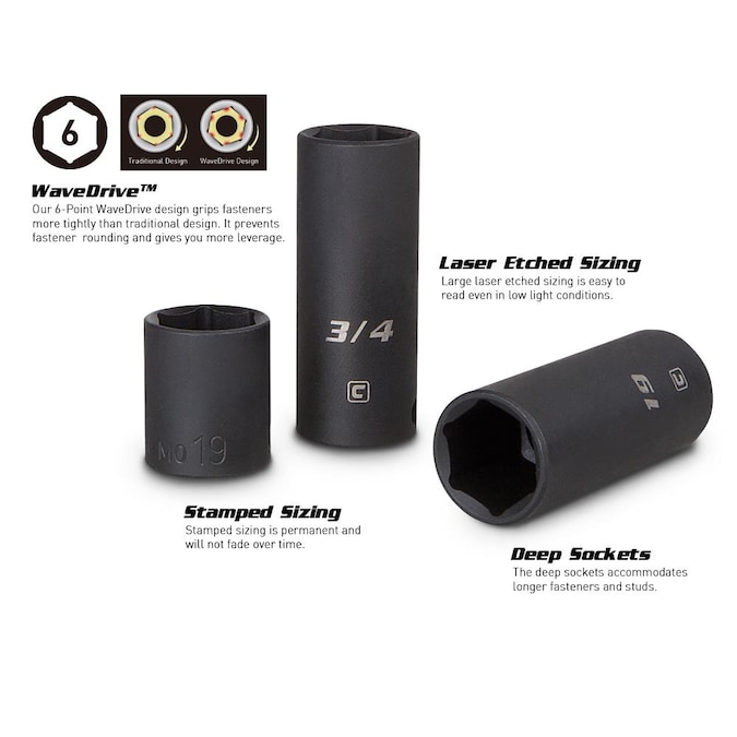 • 6-point WaveDrive design grips fasteners more tightly than traditional design, preventing fastener rounding and giving you more leverage