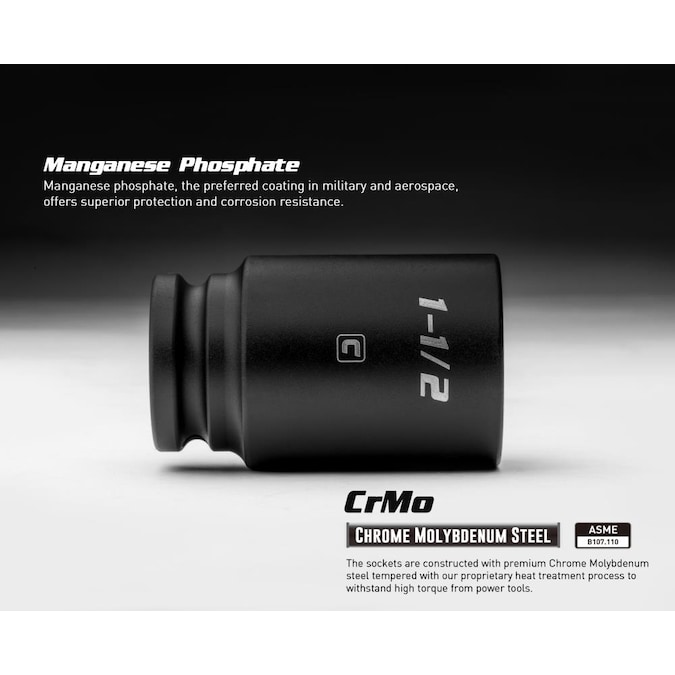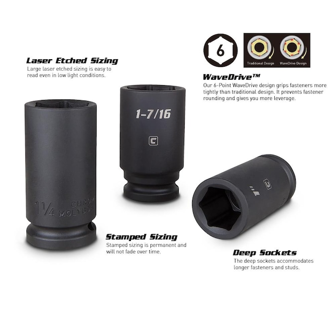 • (8) 3/4-in drive deep impact sockets: 1, 1-1/16, 1-1/8, 1-1/4, 1-5/16, 1-3/8, 1-7/16, 1-1/2-in