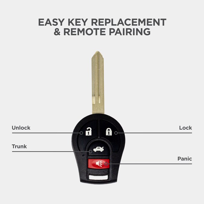 - Features four button functions: LOCK, UNLOCK, TRUNK, and PANIC.