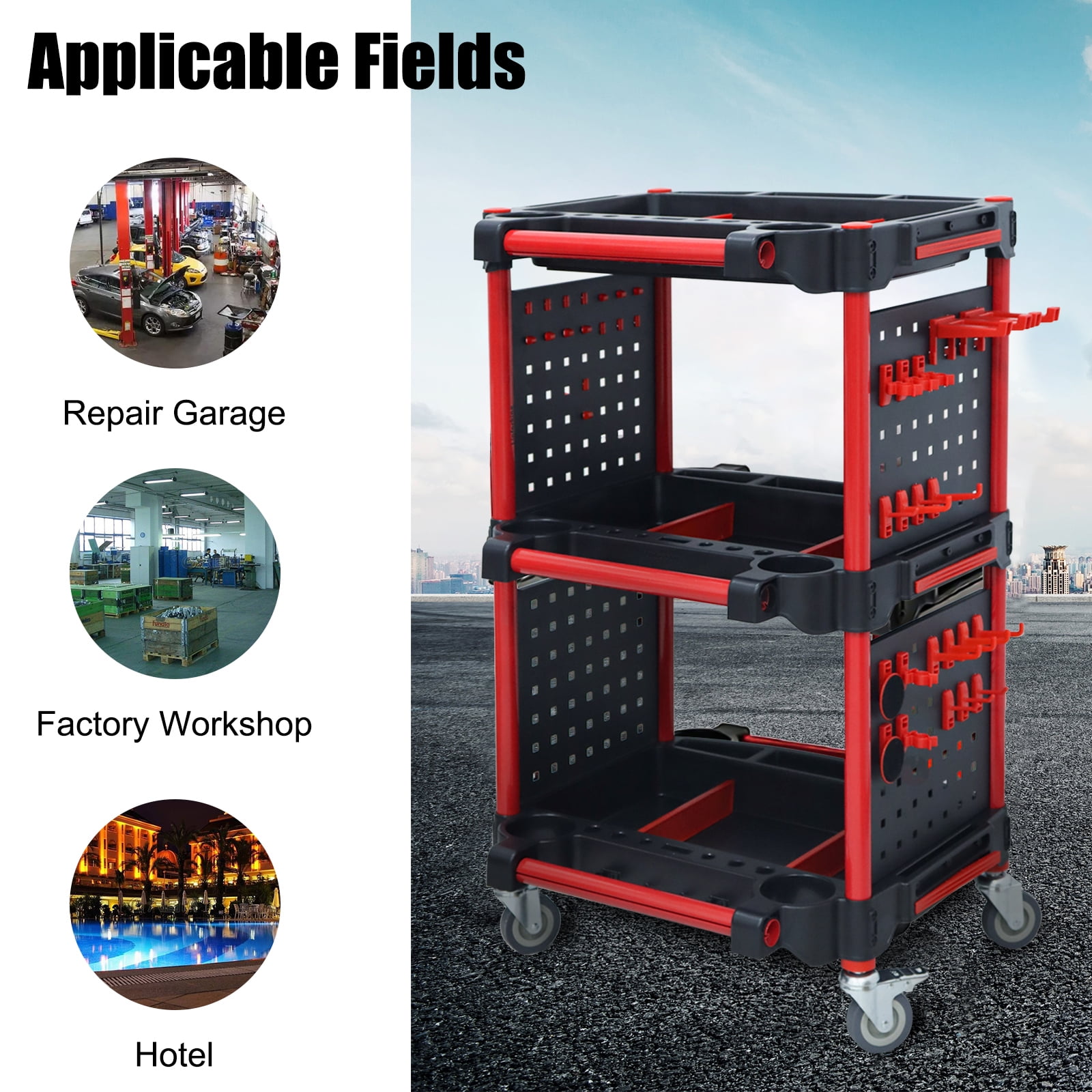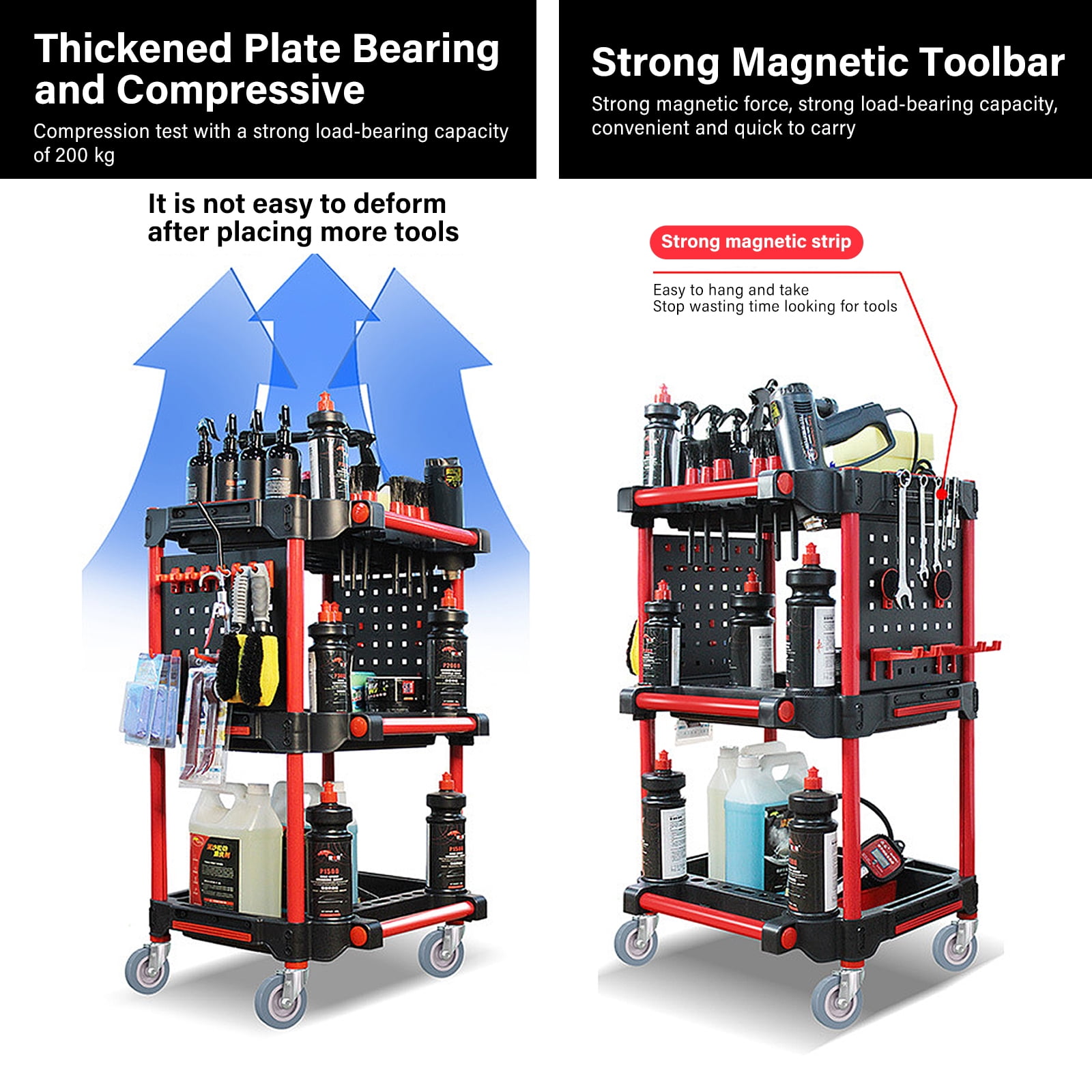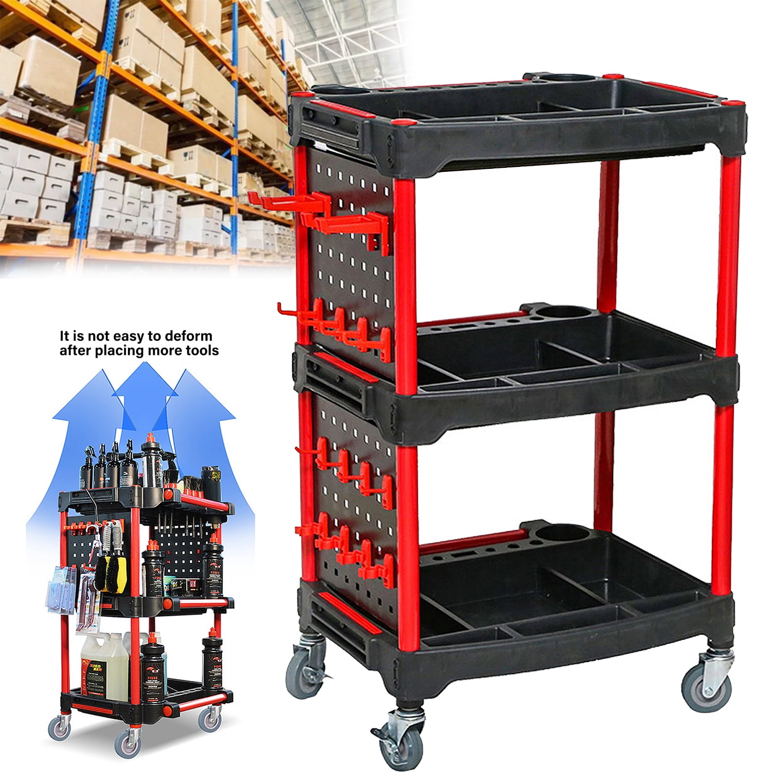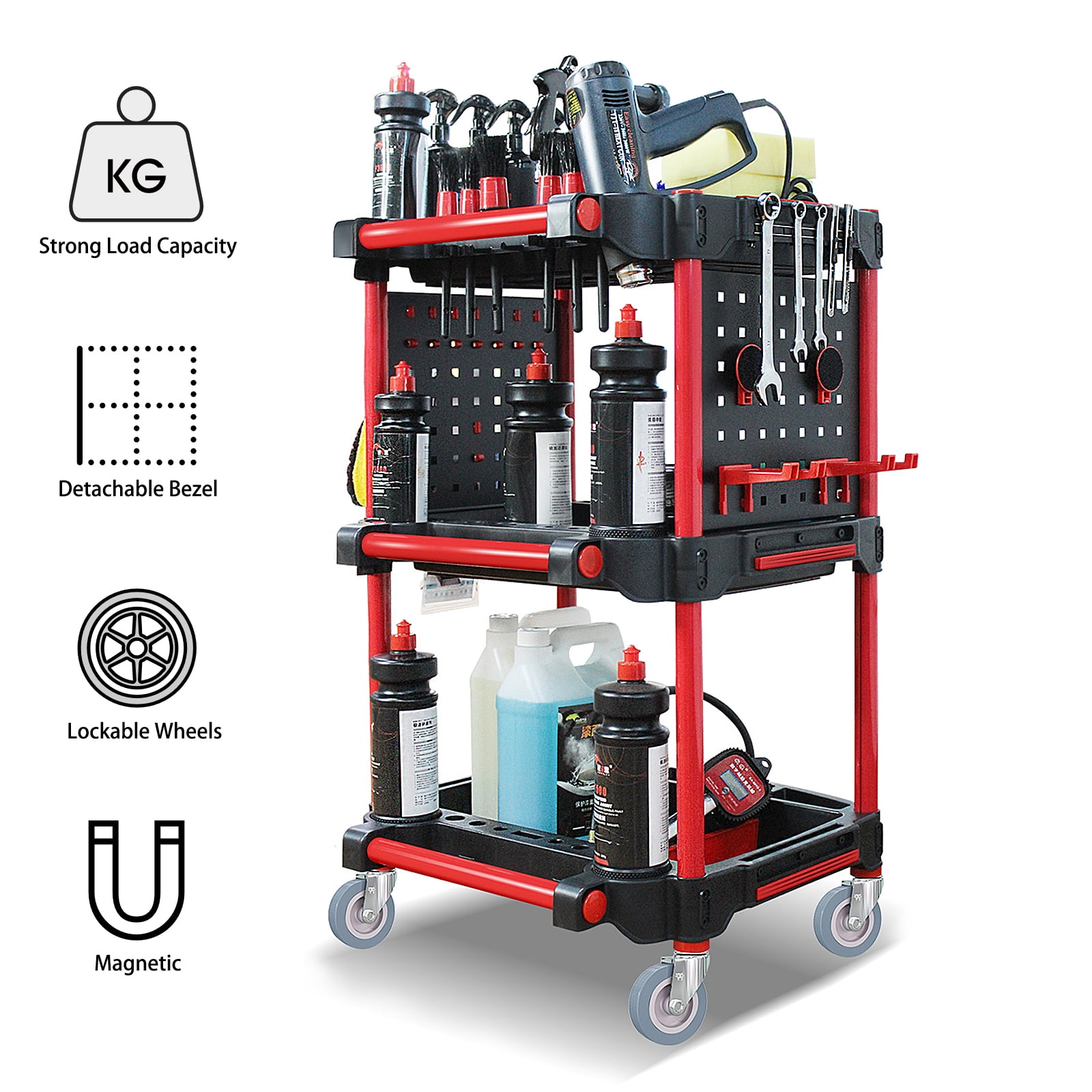 ????️ Heavy-Duty Construction → Supports up to 200kg with reinforced 2-layer base. → Made from durable PP and high-strength aluminum. ???? Adjustable & Organized → Removable partitions for customizable storage. → Hooks and shelves for easy tool classification. ???? Portable Design → 4 lockable wheels for smooth movement and stability. → Lightweight yet sturdy for indoor and outdoor use. ???? Versatile Storage → 3 spacious shelves for tools, cleaners, and supplies. → Ideal for car washes, garages, or home workshops. ???? Durable & Long-Lasting → Corrosion-resistant and wear-resistant surface. → Built to withstand harsh environments and heavy use. Technical Specifications -Material: PP, Aluminum -Dimensions: 57 x 50 x 92 cm / 22.4 x 18.7 x 36.2 inches -Load Capacity: 200kg -Features: Adjustable partitions, 4 lockable wheels, hooks -Color: Black & Red -Package Includes: 1 x Car Wash Detailing Trolley