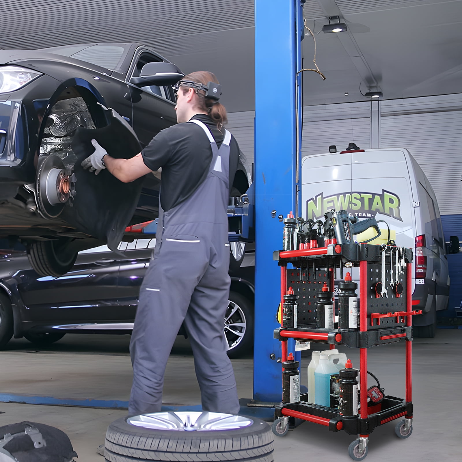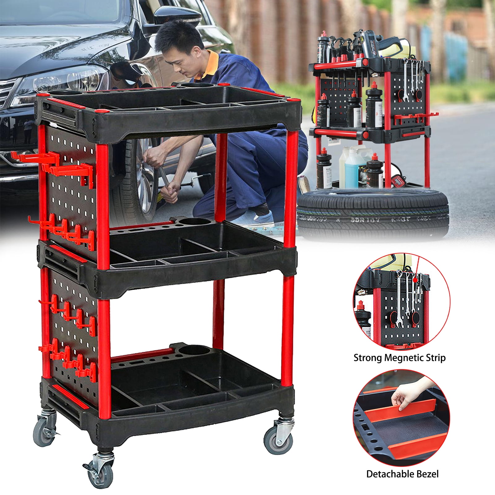 Car Detailing Cart with Wheels – DIY 3-Tier Heavy-Duty Mobile Utility Organizer for Car Wash & Auto Repairs – Adjustable Side Trays, Tool Hooks – Workshop Storage for Mechanics & Detailers