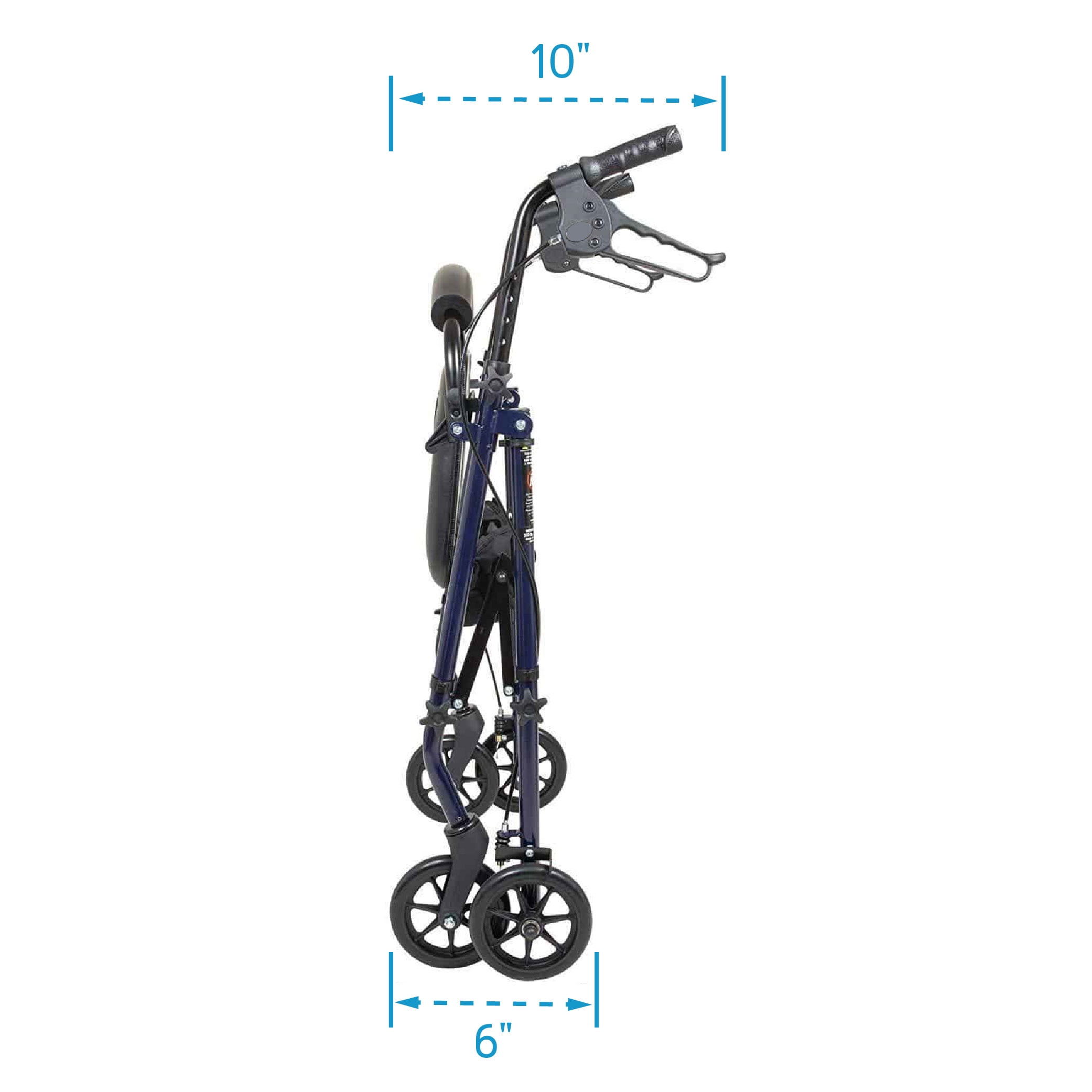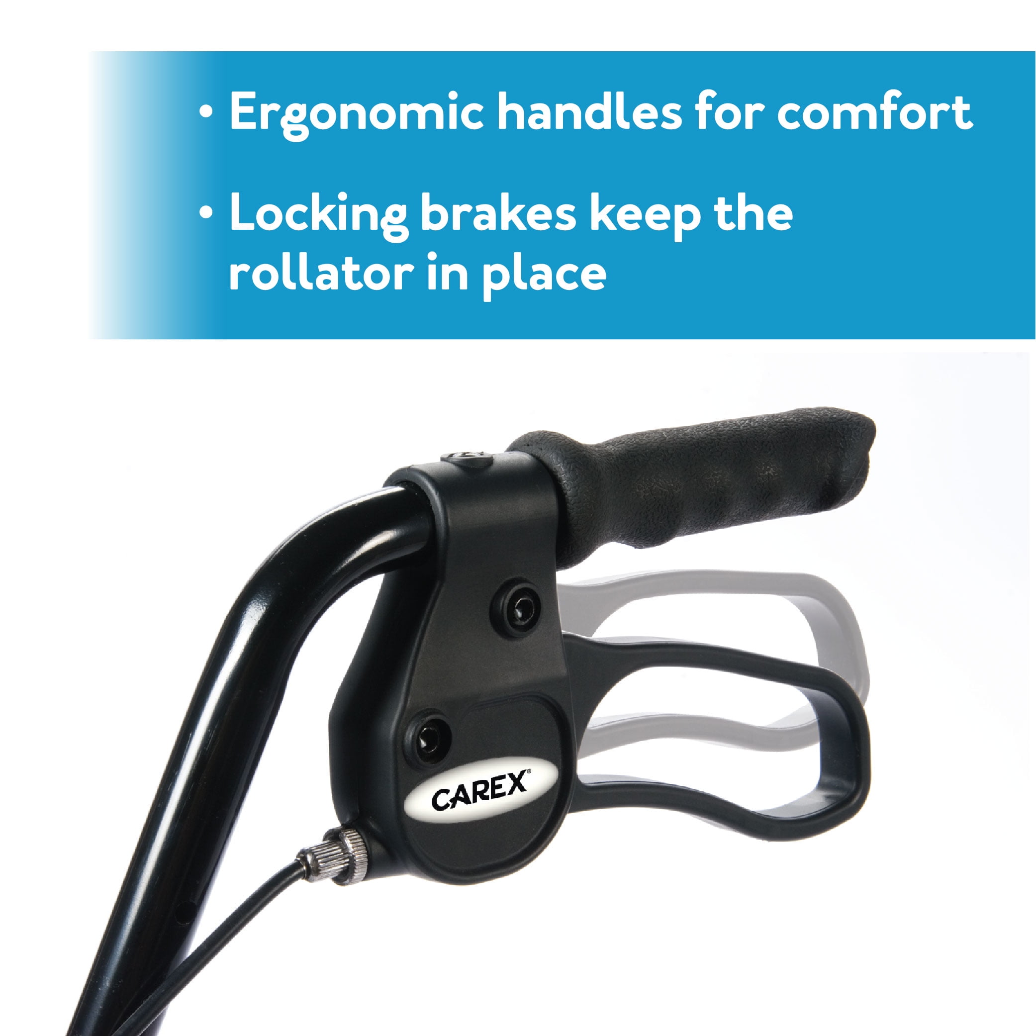 The Carex rollator walker will help increase mobility for anyone who needs it. It has a handy padded seat and backrest that will allow them to take a rest comfortably or use it as extra seating so that they’re always ready to be on the move. The rollator walker with wheels has all of the features necessary for safe and simple movement assistance. It moves easily while walking and also provides a resting spot that will allow you to go almost anywhere. The 6″ wheels on the folding rollator walker with seat have lockable handbrakes that let you maneuver and stop with little effort. It includes a convenient storage area under the seat to safely hold your personal items, such as a purse, wallet, shopping bags and more. The Carex rollator walker collapses and folds easily so that you can store it out of the way when it’s not in use. Assembly is quick and tool-free so you can begin using it right away. It has a weight capacity of 350 lbs and can be used by a variety of people. It is easily adaptable to all of your travel and storage needs to help keep you mobile and able to participate in a variety of activities and events.