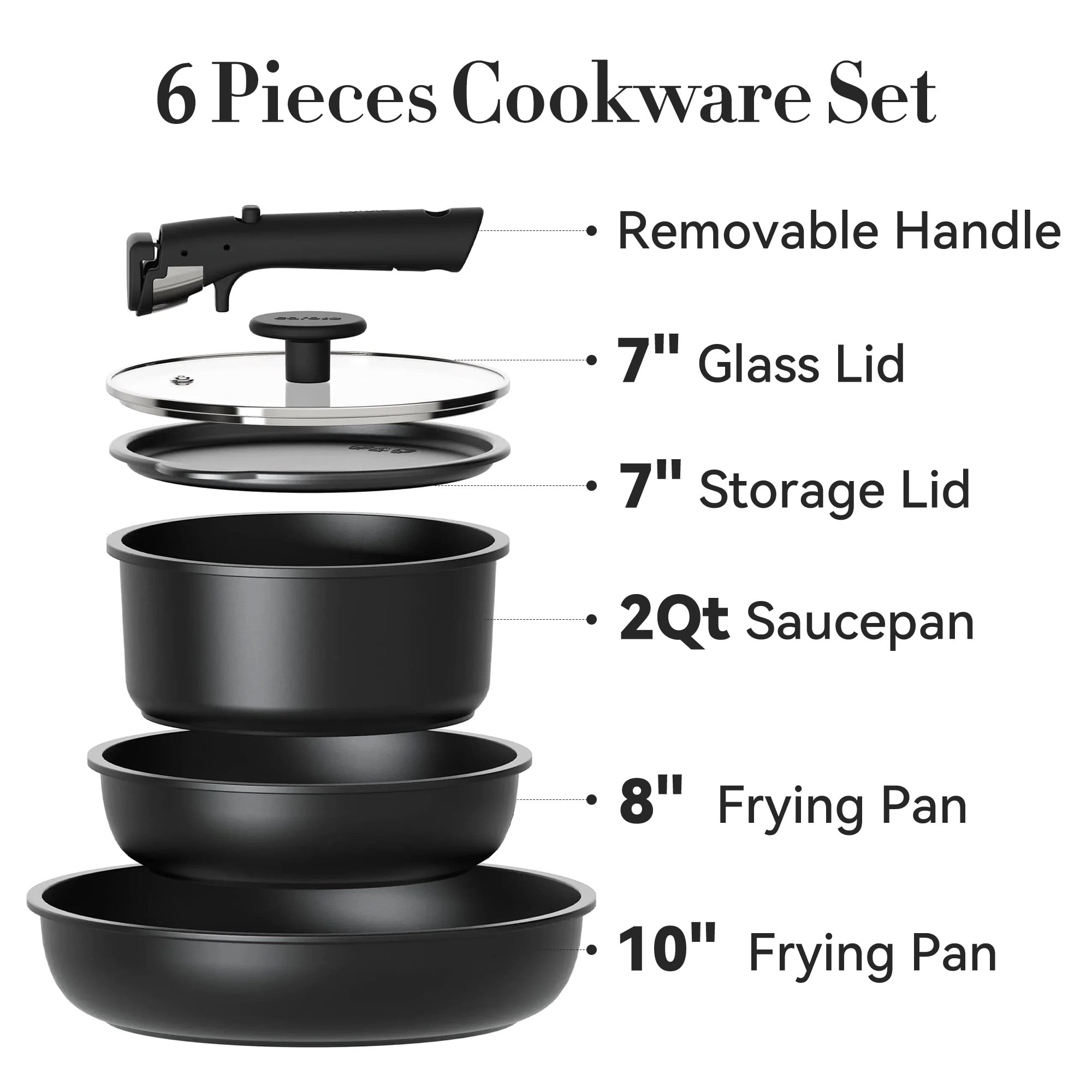 Cookware sets with premium non-stick coating ensures easy food release, healthier low-oil cooking, and quick cleanup every time. Engineered for compact kitchens, the Carote cookware set stacks neatly to save cabinet space, saving up to 70% space. Up to 480°F for versatile stovetop-to-oven cooking. Easy to clean and dishwasher-safe for hassle-free clean. From stovetop to oven, cooking to serving, this detachable cookware set does it all, whether baking, sautéing, or storing leftovers. 8″&10″ Frying Pan, 8″(3QT) Saucepan, Detachable Handles, 8″ Silicone Lid, 8″Storage Lid. All cookwares set offer 12 months warranty for any quality issue. Please feel free to contact us.
