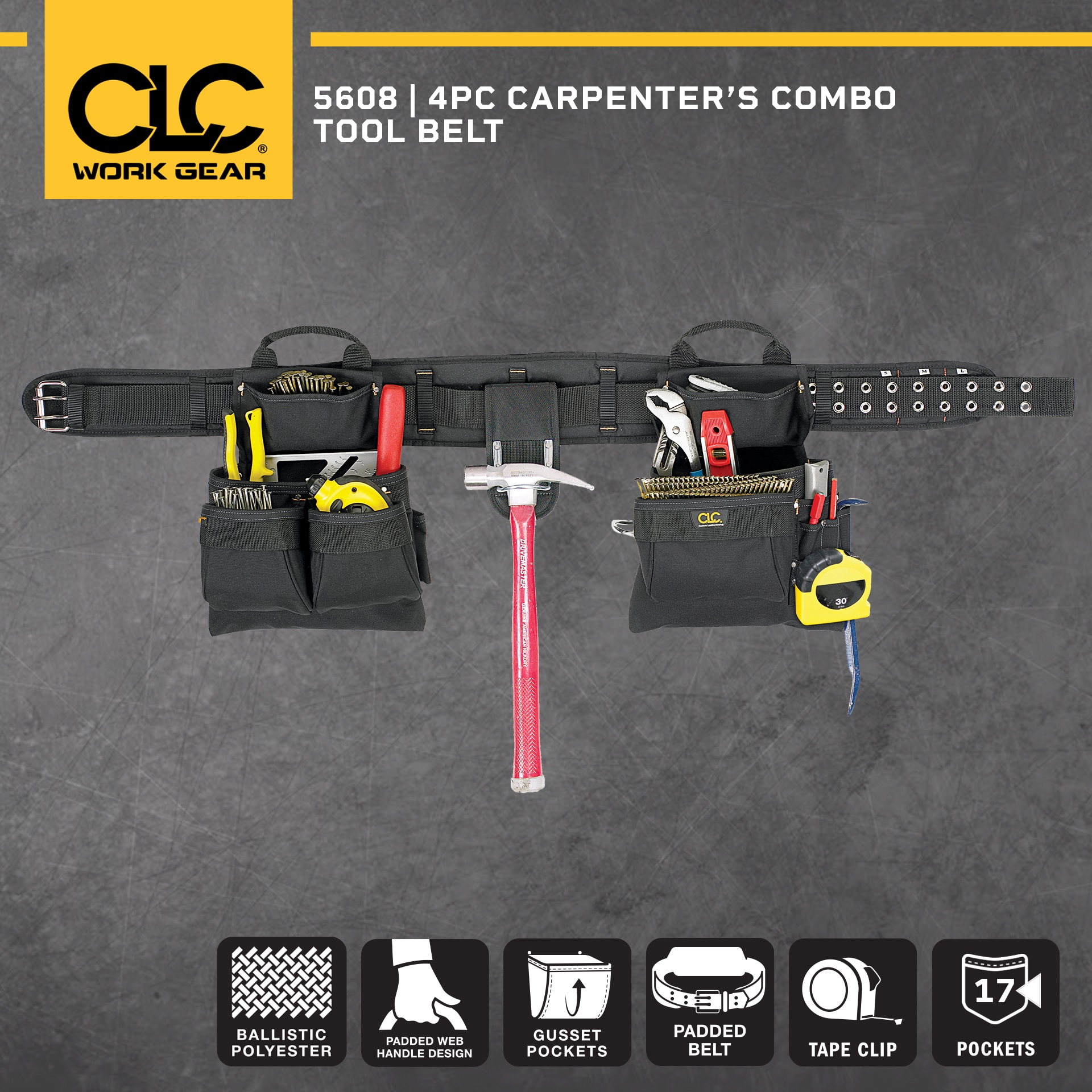 Premium quality CLC 4-piece carpenter’s combo tool belt constructed from ballistic polyester fabric and includes a 5-in padded, double-tongue roller buckle belt, and 17 pockets and sleeves to hold for your favorite nails and tools.