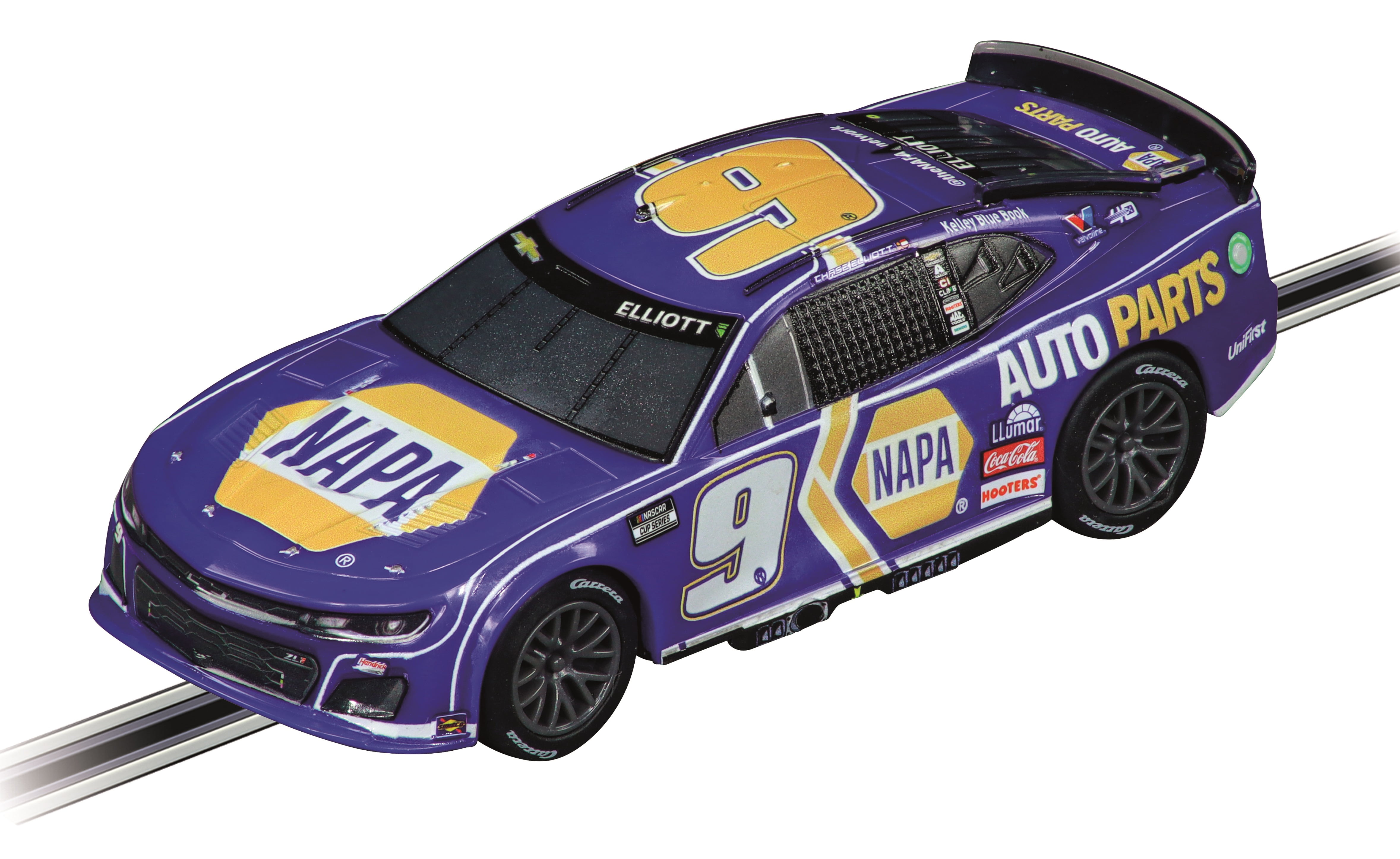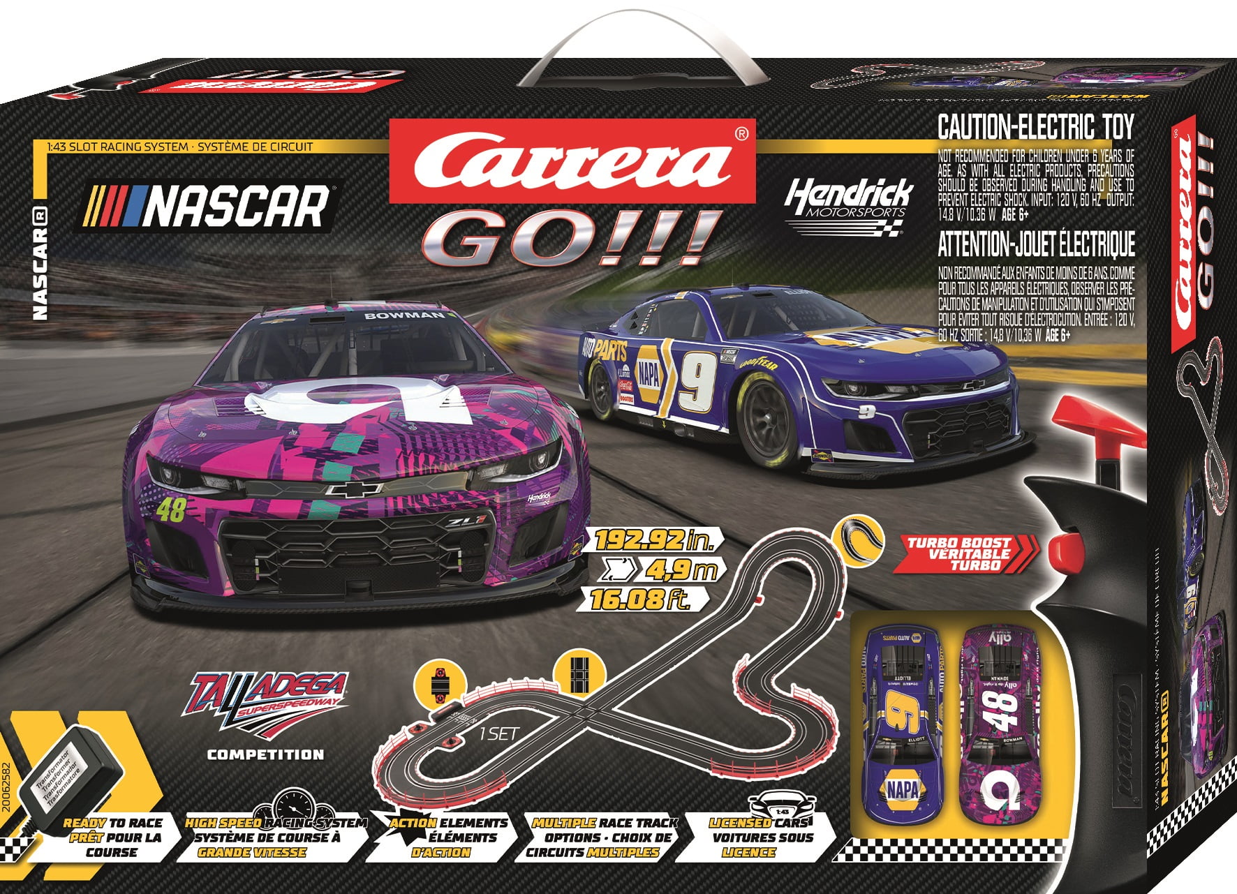 NASCAR Talladega Competition Carrera GO!!! slot car racing set Official NASCAR licensed cars Race Track length: 16.08-ft. Includes lap counter, flyover, junction track, and more. Scale: 1:43 Cars included: NASCAR Camaro NextGen ZL1 “Hendrick Motorsports, Chase Elliott, No.9” and NASCAR Camaro NextGen ZL1 “Hendrick Motorsports, Alex Bowman, No.48” Recommended for age 6 and up