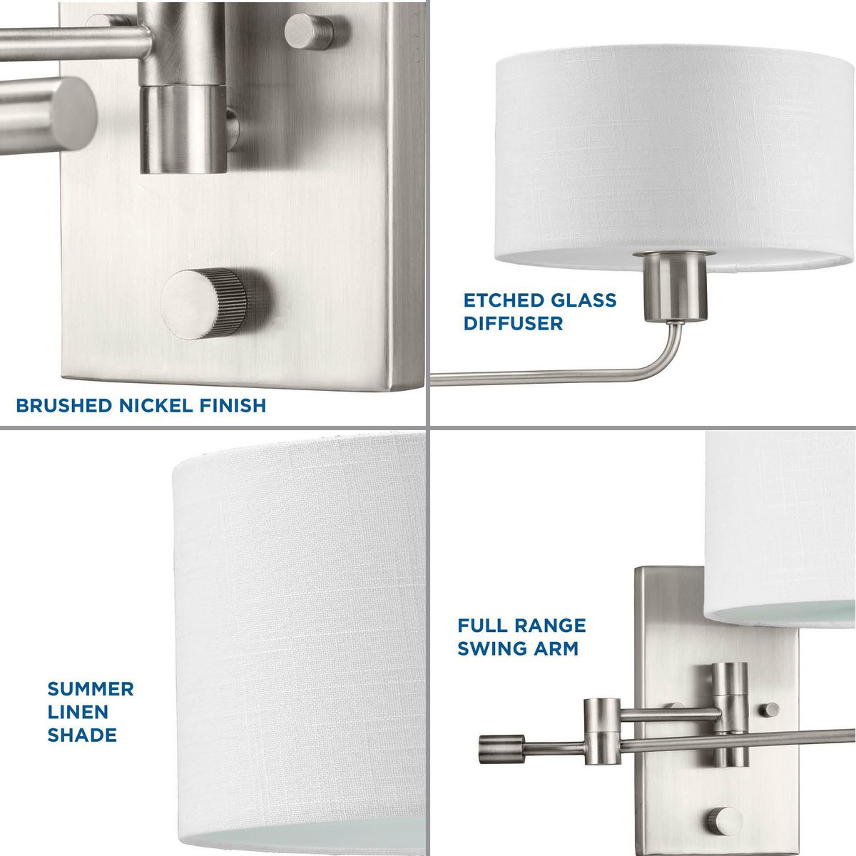 Merge function and fashion with the Carrick Collection. A full-range swing arm supports a crisp summer linen shade and etched glass diffuser for glare-free task illumination. An integral rotary switch on the backplate is included for convenient control. The wall light’s frame is coated in a beautiful brushed nickel finish.