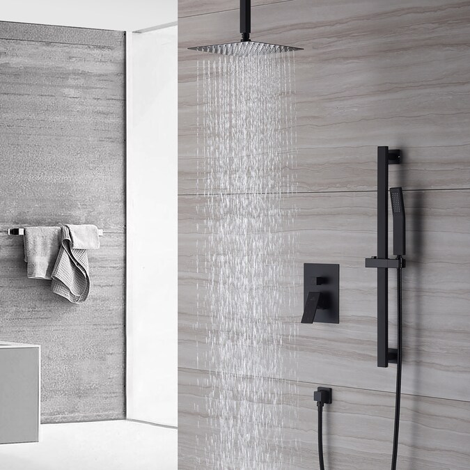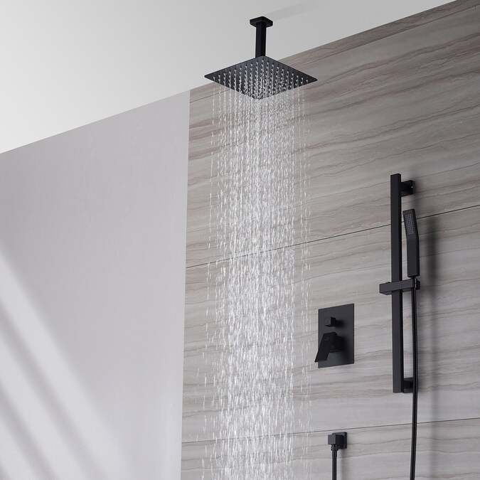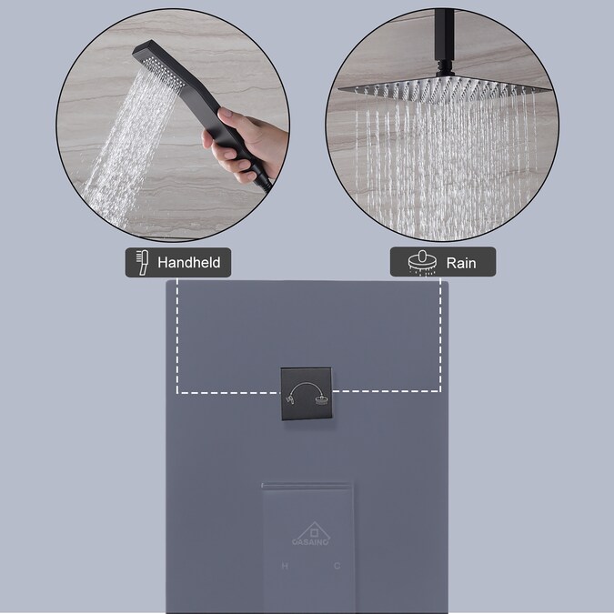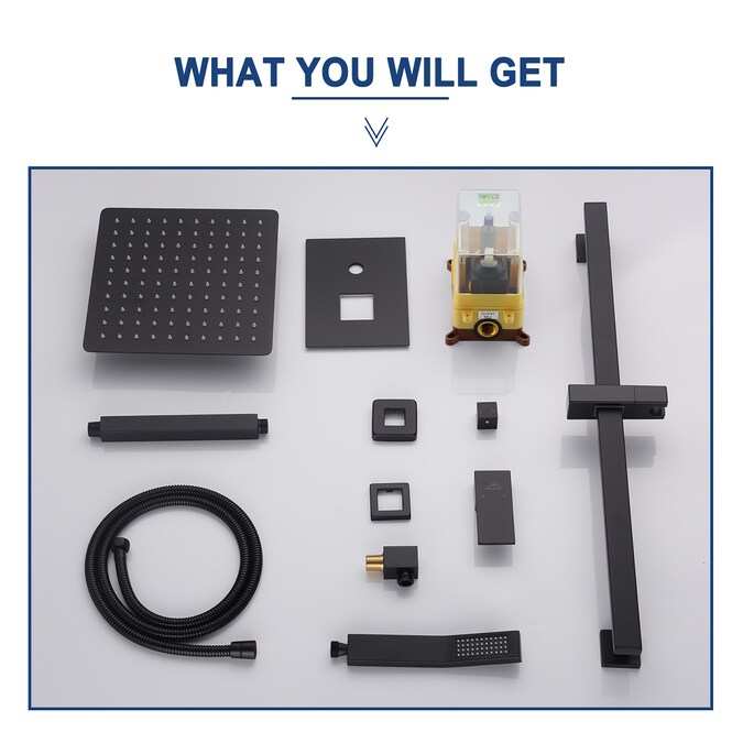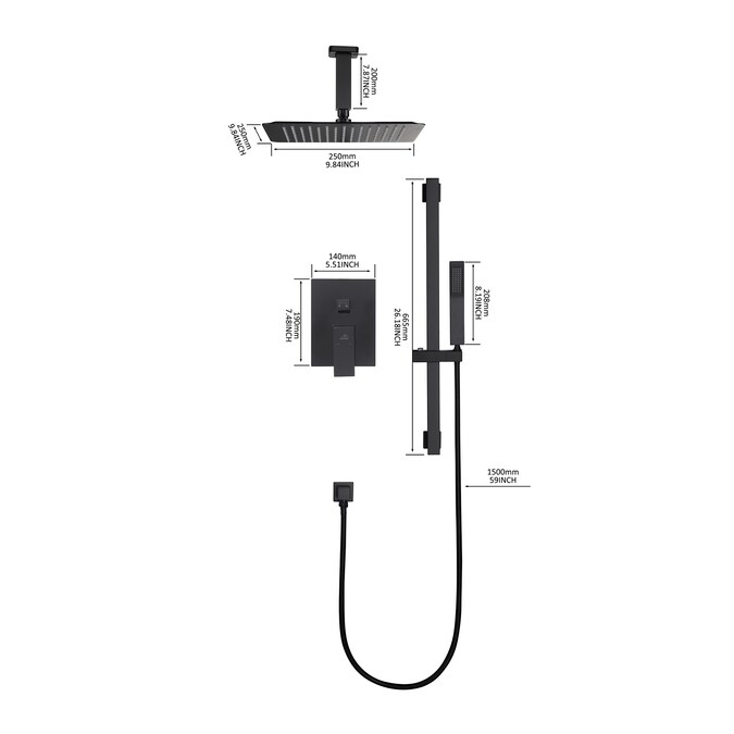 - Those parts include 10-inch square rain shower head, 2 inch handheld shower head, tub spout, 15 inches shower head arm, shower holder, pre-embedded anti-scald valve, and 59 inches shower hose