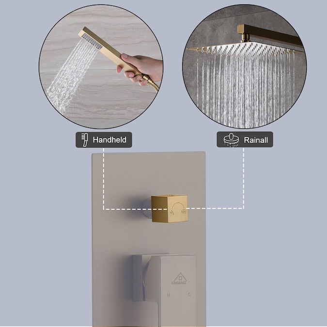 The main body of this brushed gold single shower rain system is made of brass, and the square stainless steel shower has a high-level appearance and long-lasting durability. CUPC certified valve ,Stainless steel hand shower with 59 in. hose and 15 in. shower arm. The whole set of shower system will bring you an advanced shower experience and wash away all-day fatigue.
