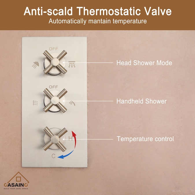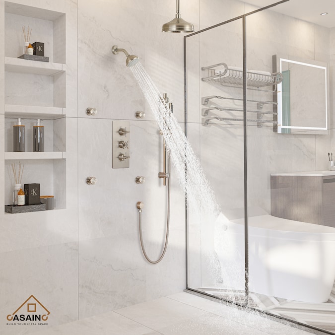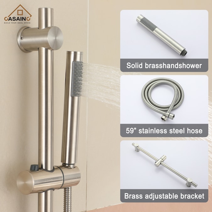 - This multifunctional shower set, with modern brushed nickel finish, has a sleek look; it complements any bathroom, and ensures corrosion resistant and durable