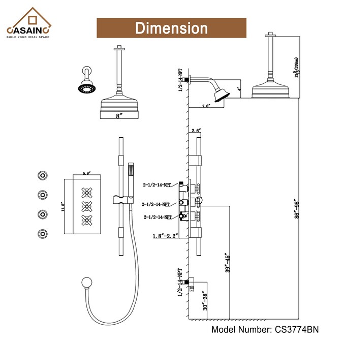 - All threads are NPT 1/2, to ensure the safer and faster installation process, it’s highly recommended to hire the plumber or contractor to install the shower system