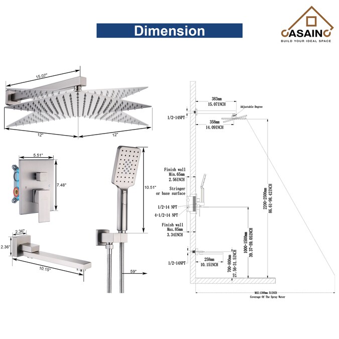 - Enjoy Bathing: Our shower faucets sets complete is made of high quality metal with long service life: 12-inch metal stainless steel round shower head offers a good coverage to soak your entire body as if you are in a luxury hotel or spa; The hand shower is connected to a 59-inch length of stainless steel hose, which can easily clean all parts of the body; 180 degree rotating bathtub spout can adjust the angle as needed and be placed against the wall without taking space