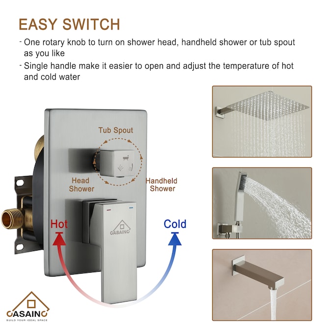 - Single lever design for effortless flow and temperature control; you can switch the knob to open rainfall shower head, handheld shower and tub faucet as you like