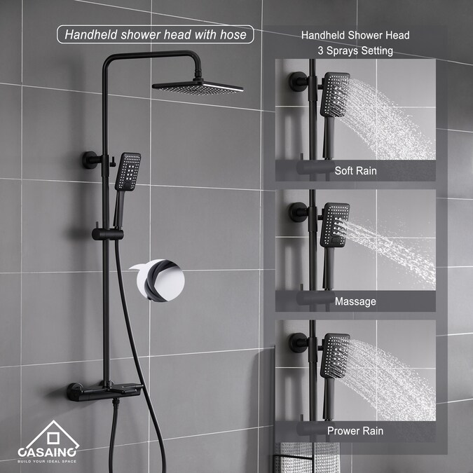 This thermostatic exposed rainfall shower system has an overhead rain shower head and 3 spray modes for handheld showers. A thermostatic shower valve can accurately control the temperature, heating it safely and preventing scalding. The handheld shower adopts high-quality ABS material with a self-cleaning silicone water outlet, making it easier to remove deposits. An all-in-one shower system for multiple uses, this range of shower can meet all your bathroom needs.