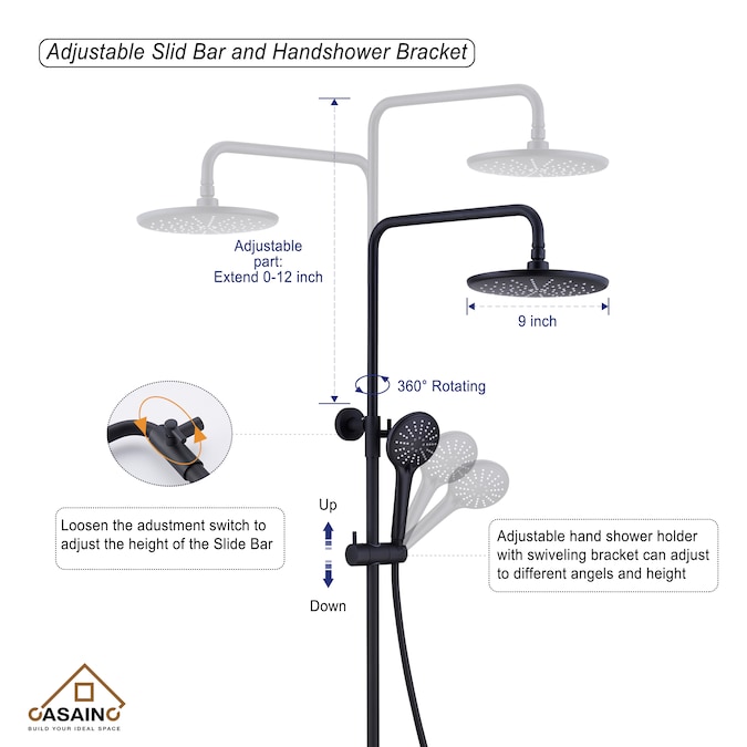 - The rain shower head can offer consistent, powerful water flow, and the shower rod has an adjustable extension height of 0-12 inches